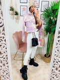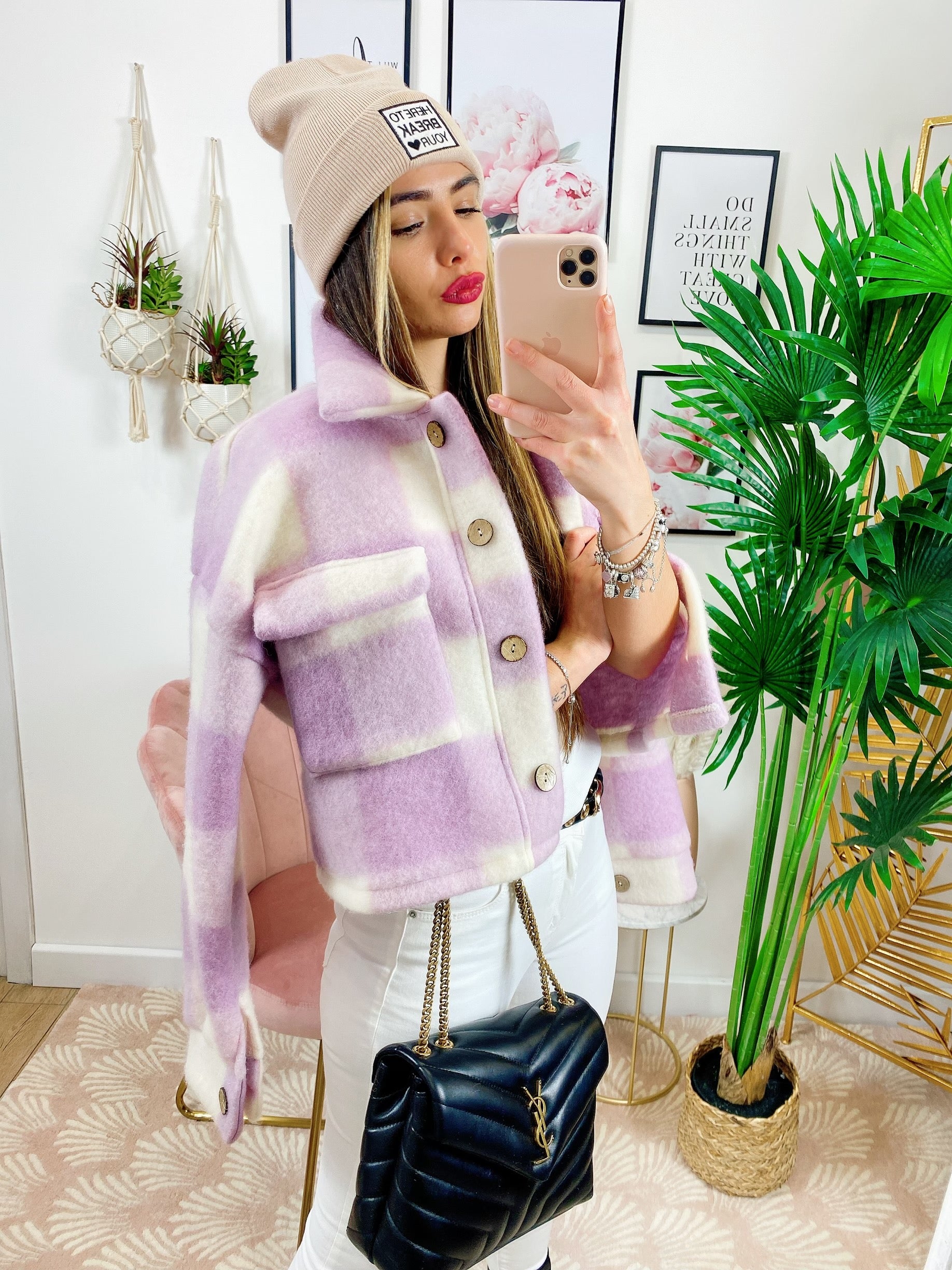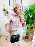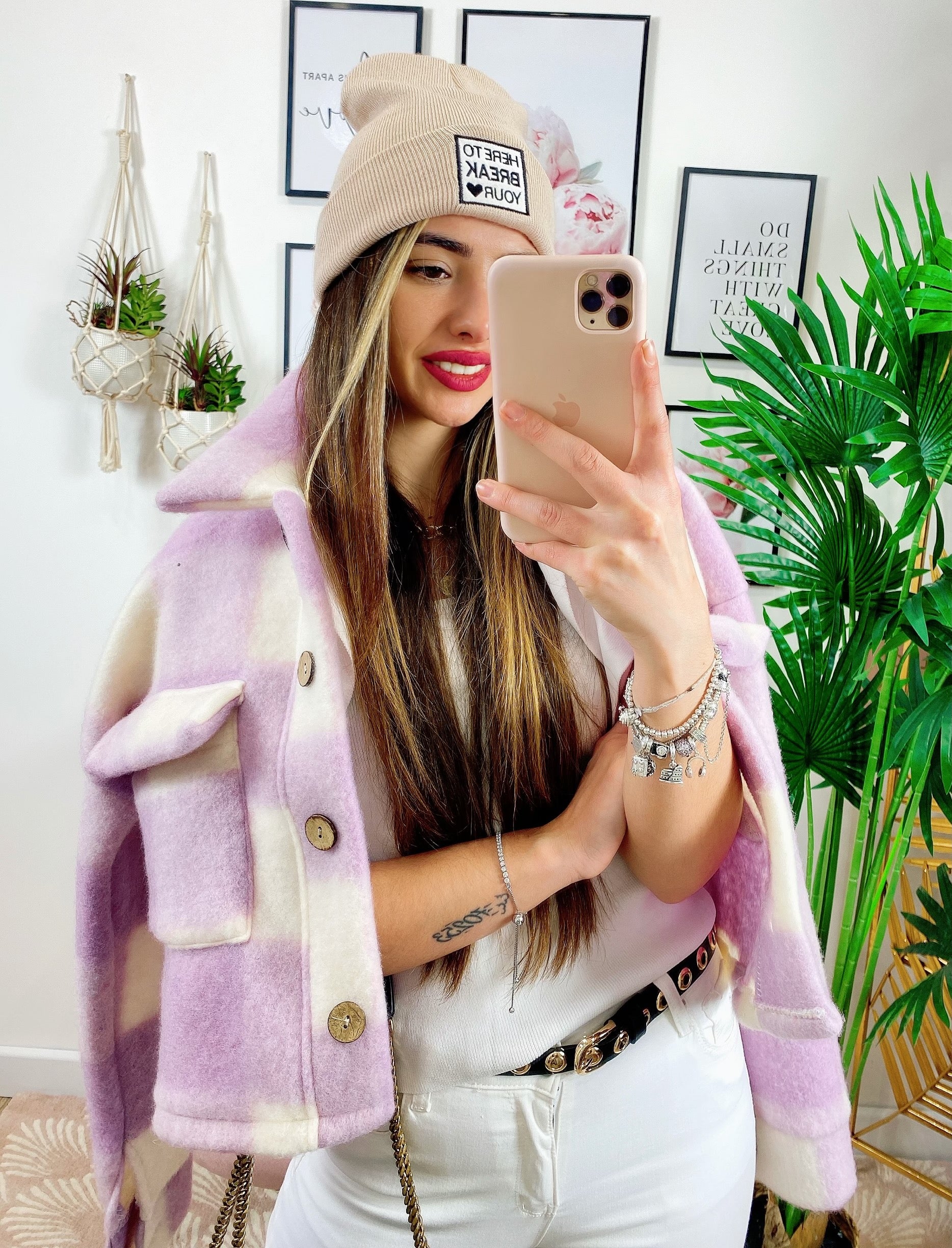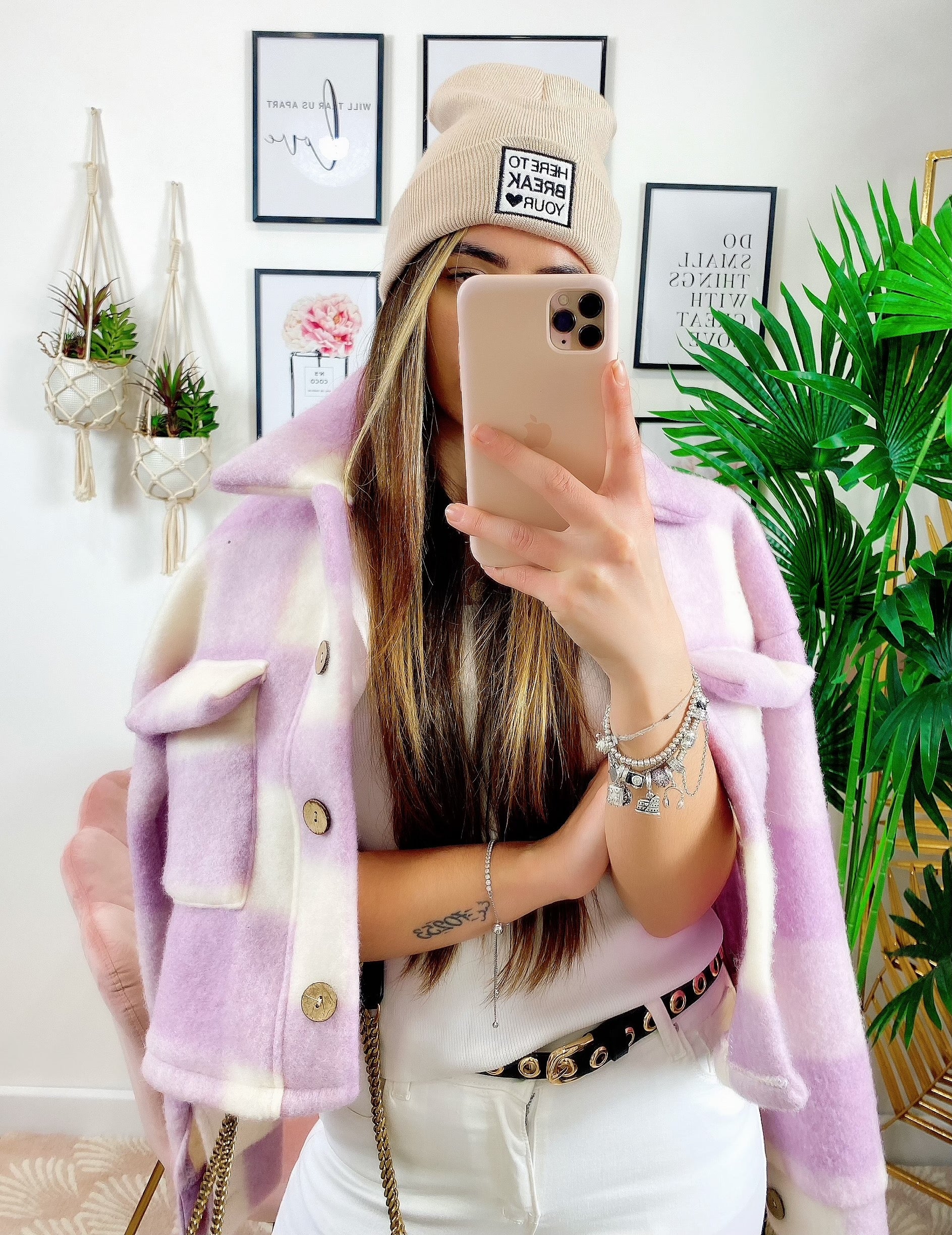 Giacca a quadri lilla corta Con bottoni e tasche davanti.