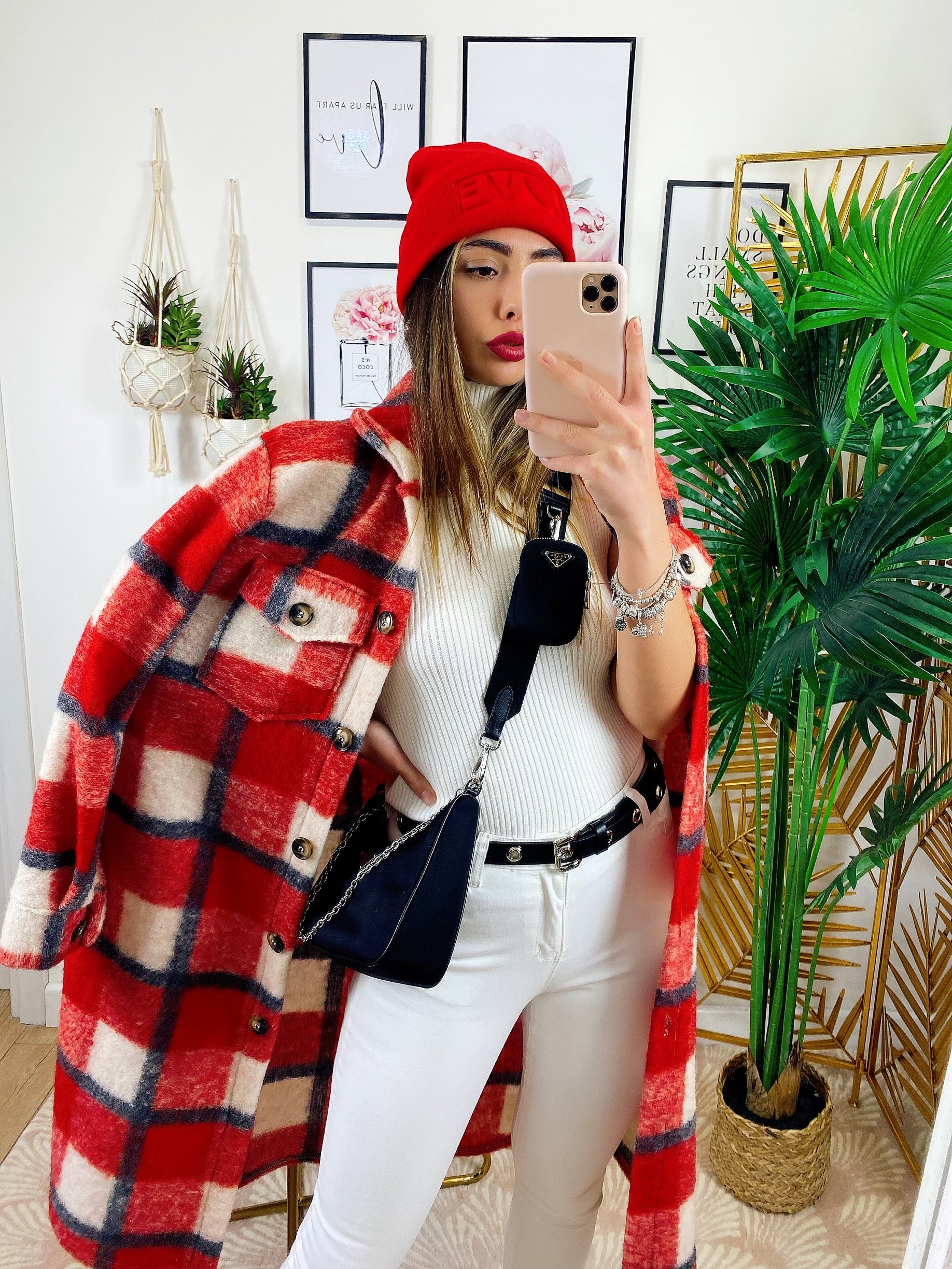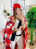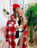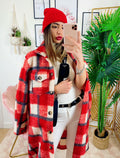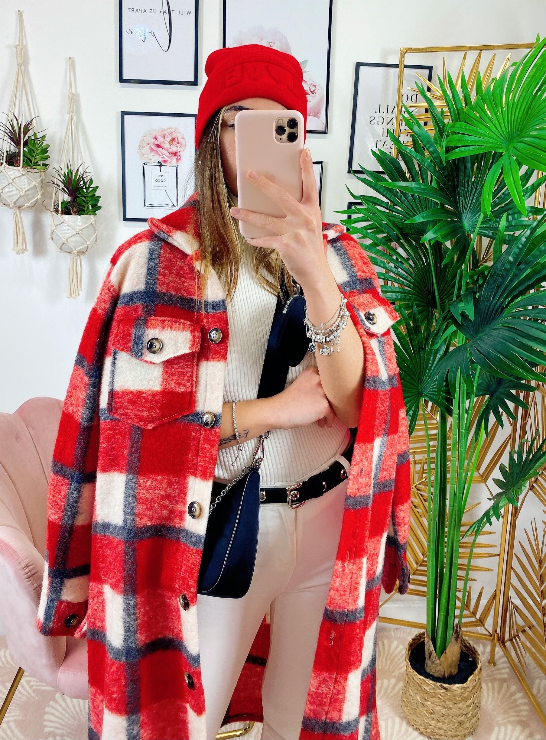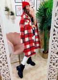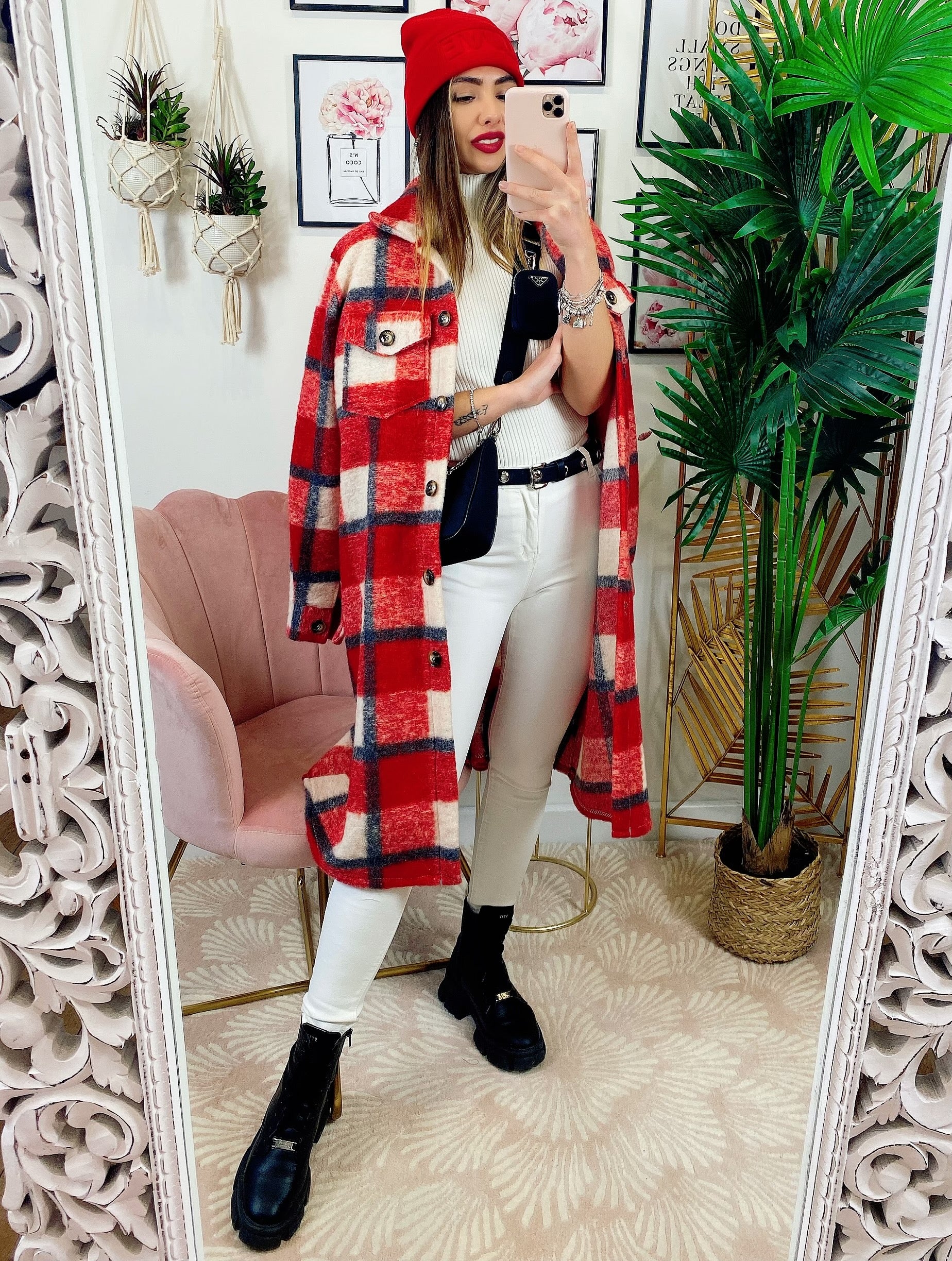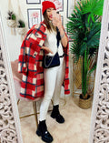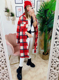 Giacca a quadri lunga Rossa Con bottoni e tasche davanti.
