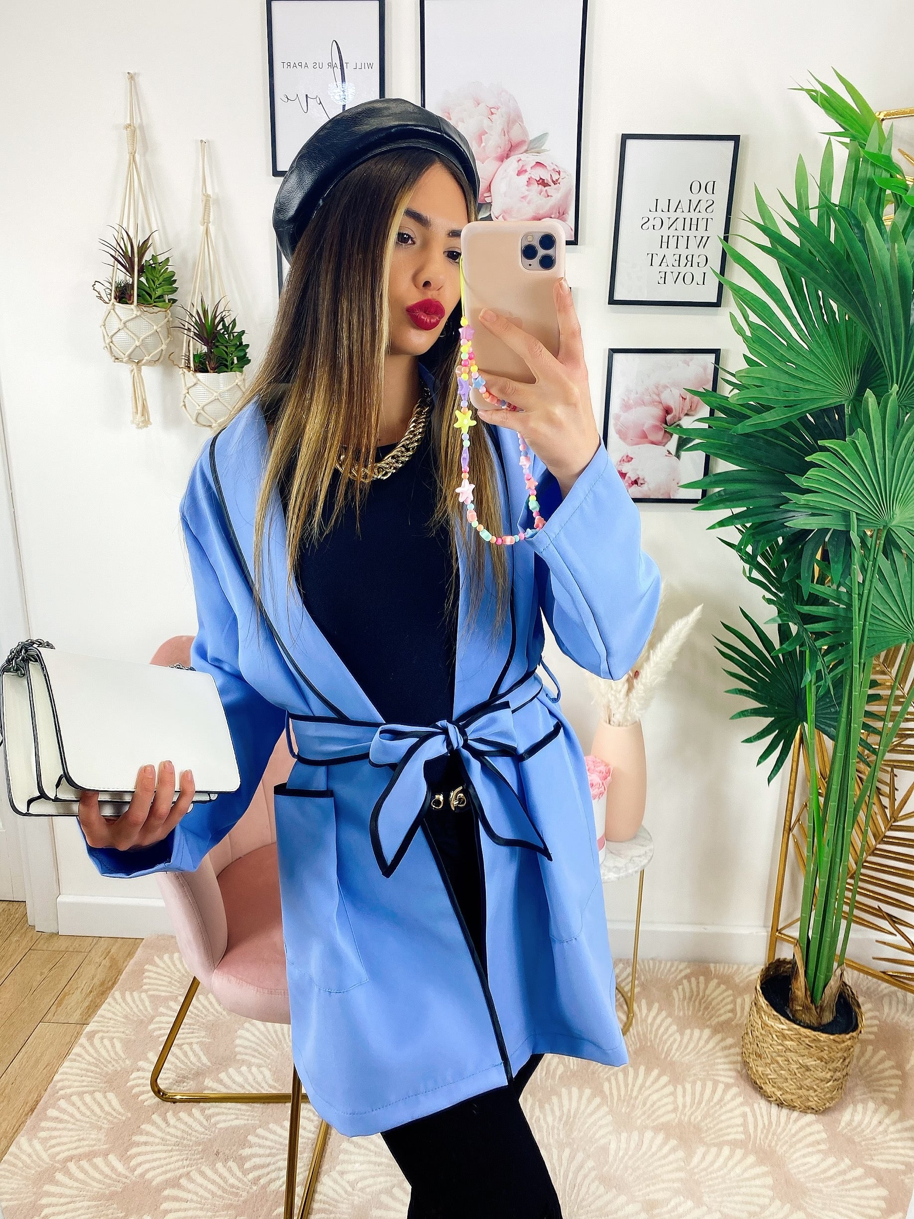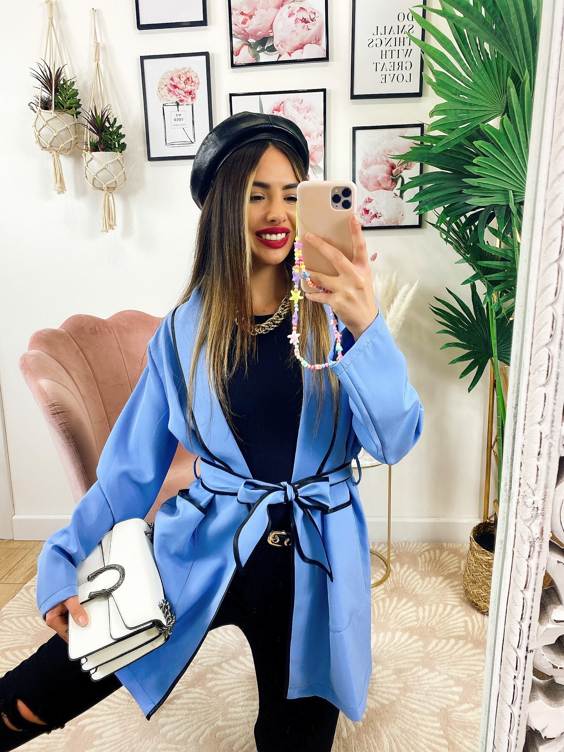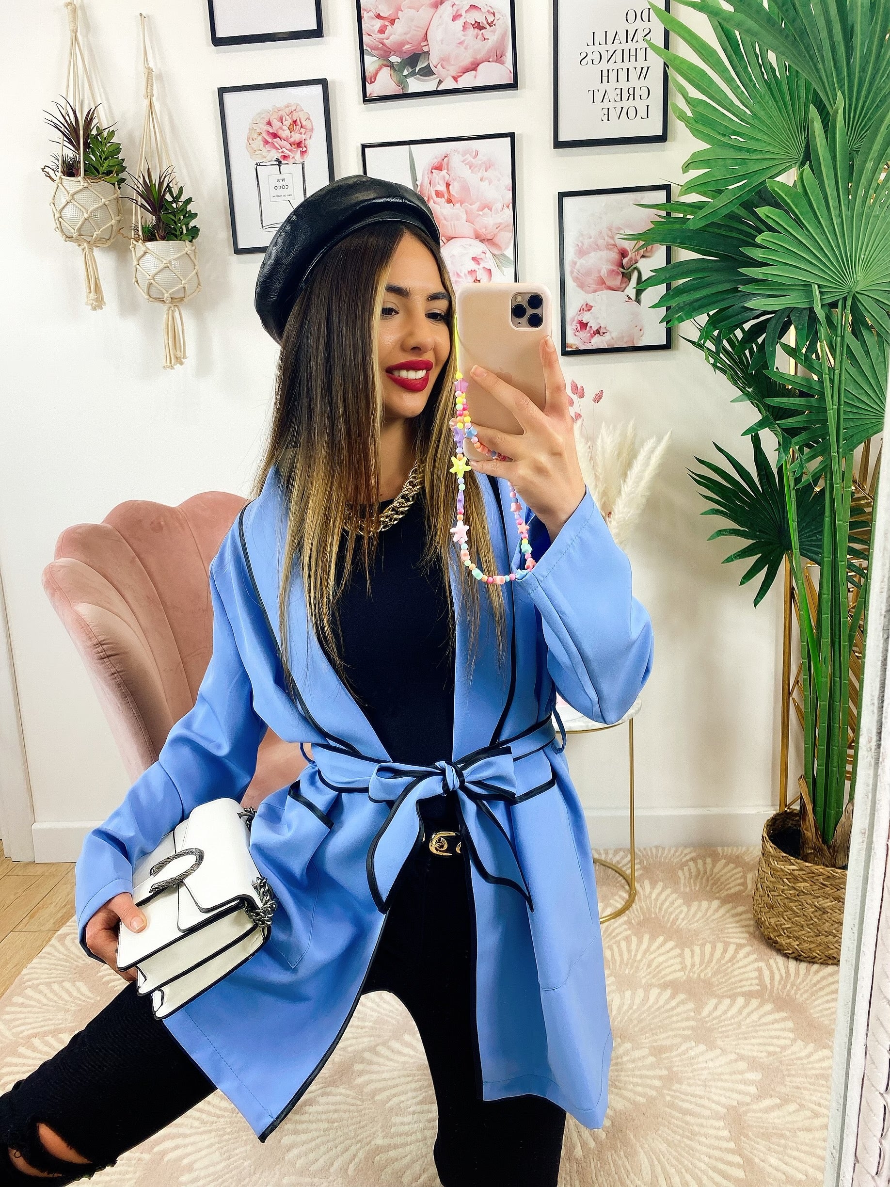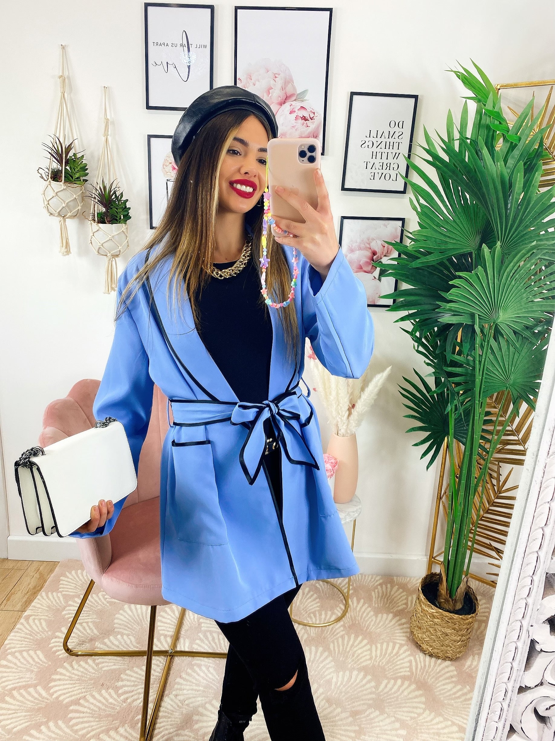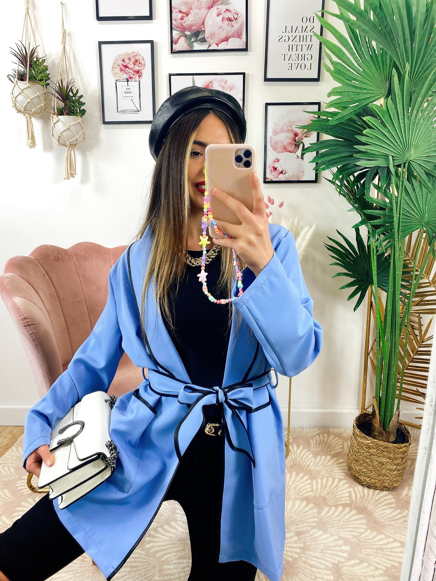 Giacca con cintura in vita celeste con dettaglio nero, ottima vestibilità, Tessuto primaverile.
