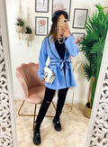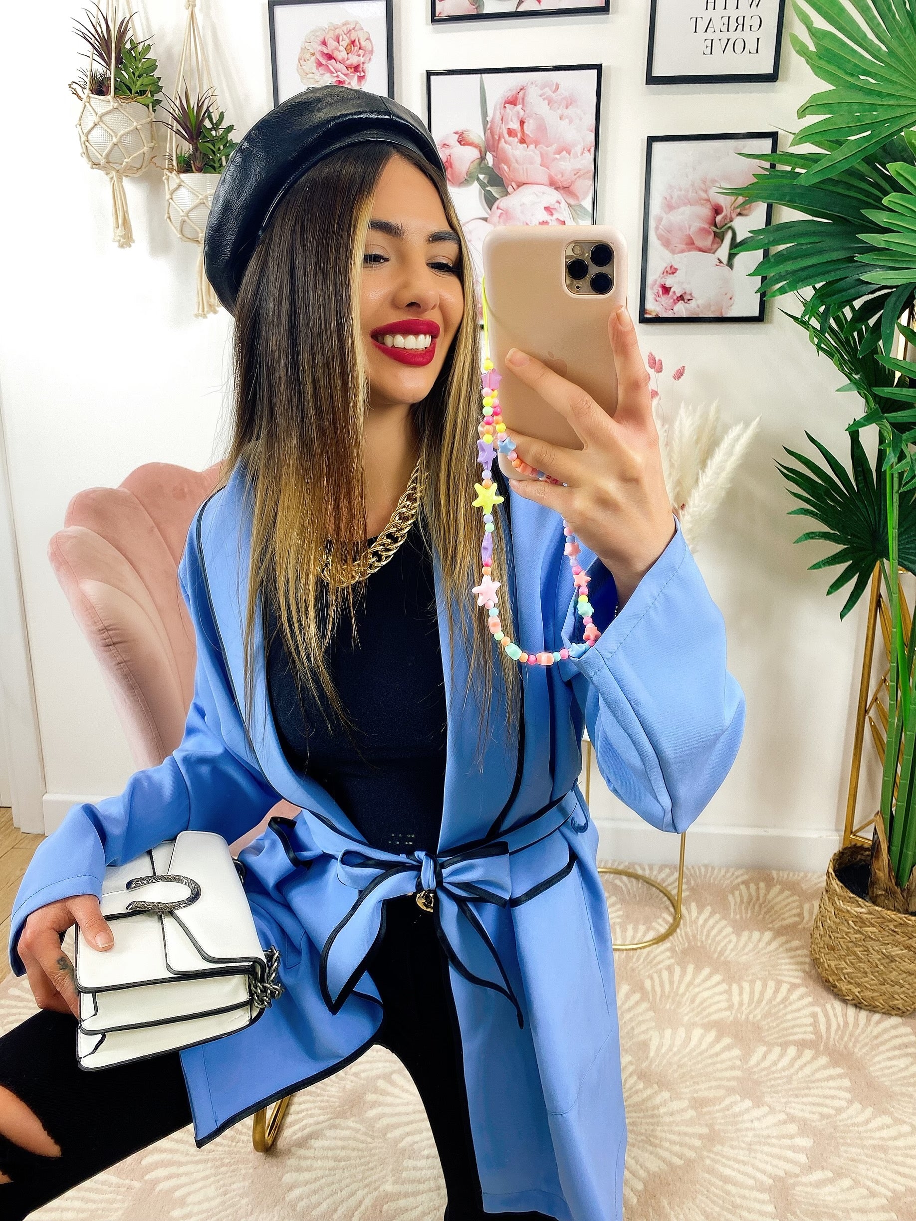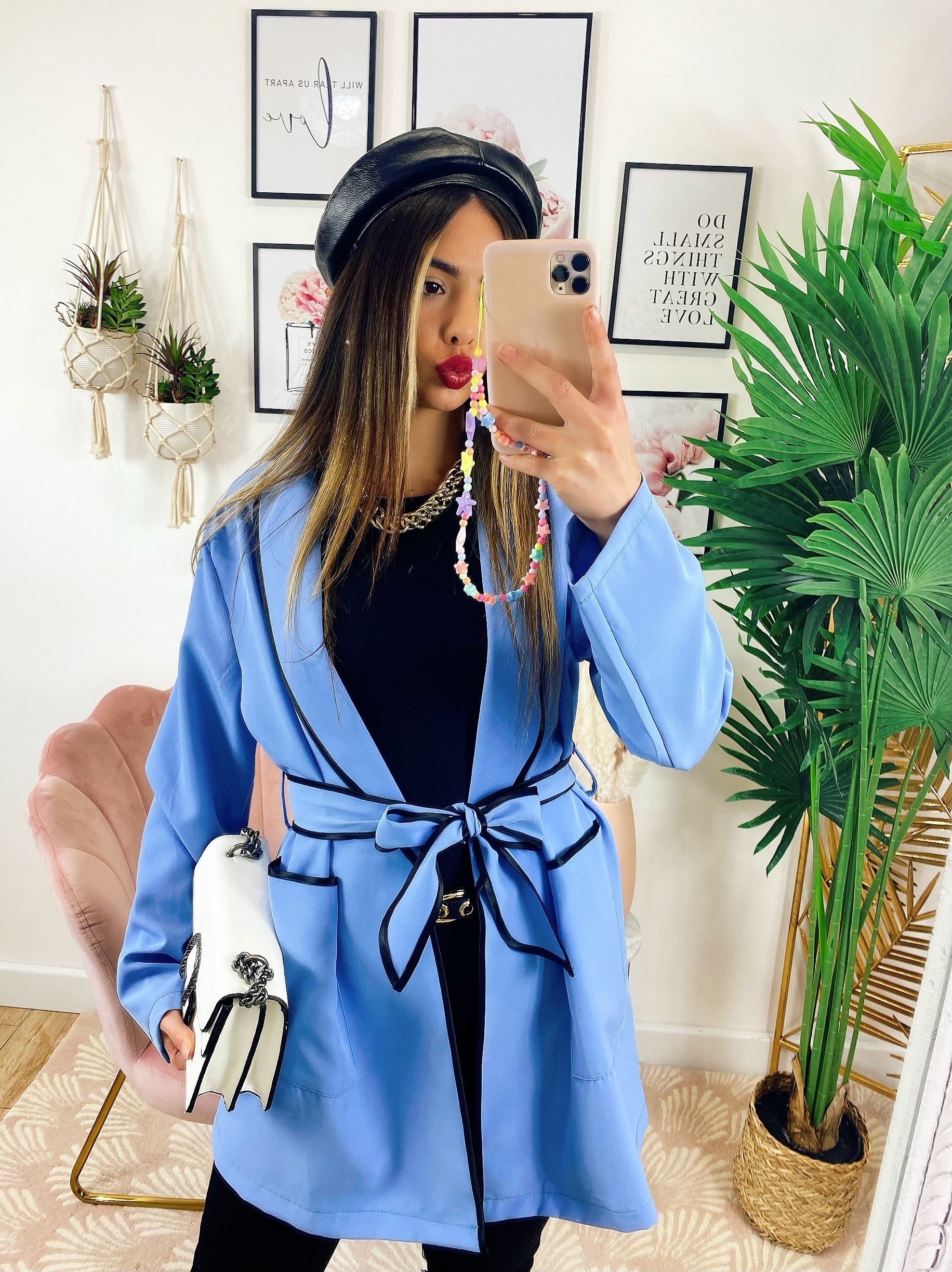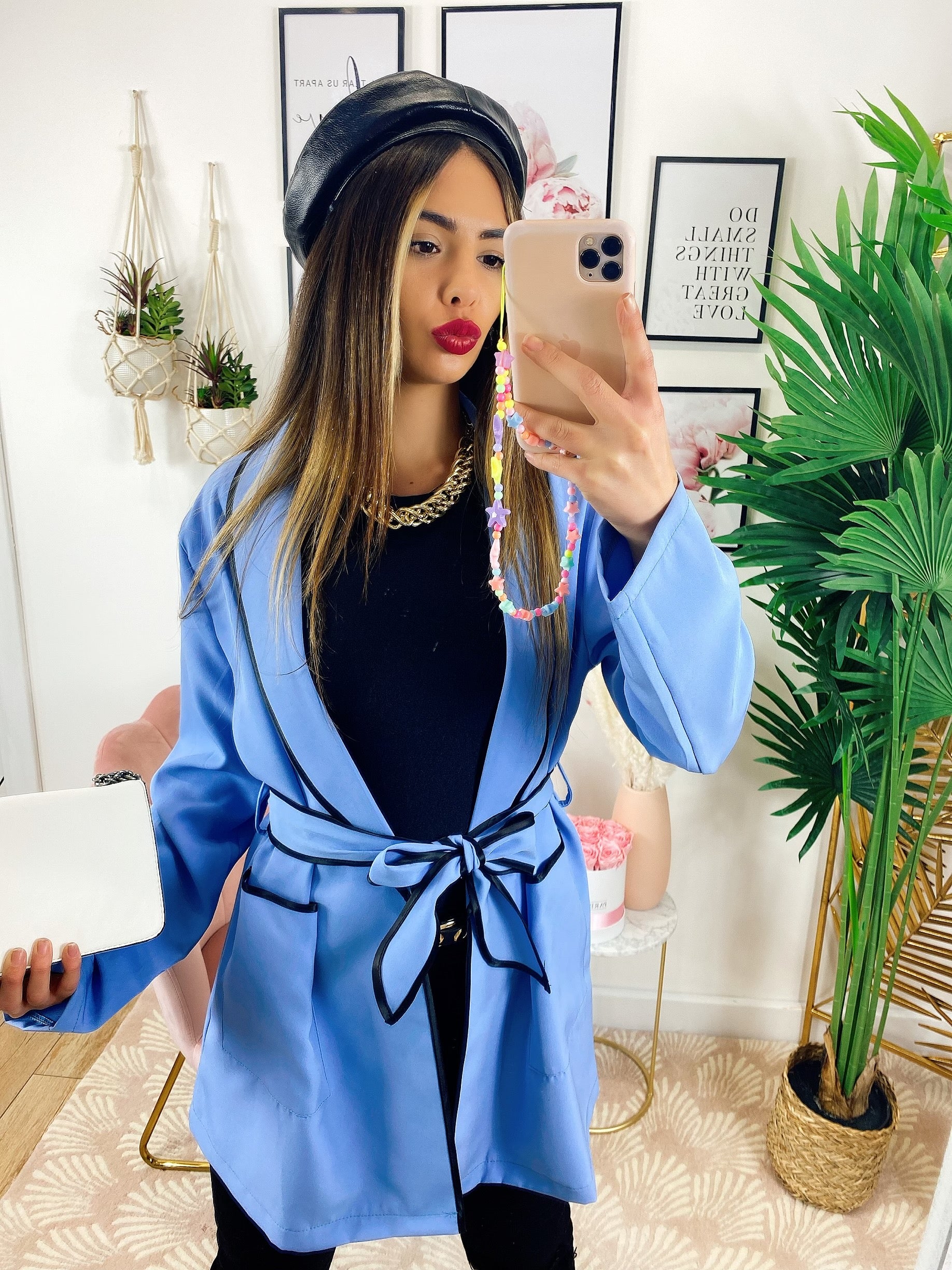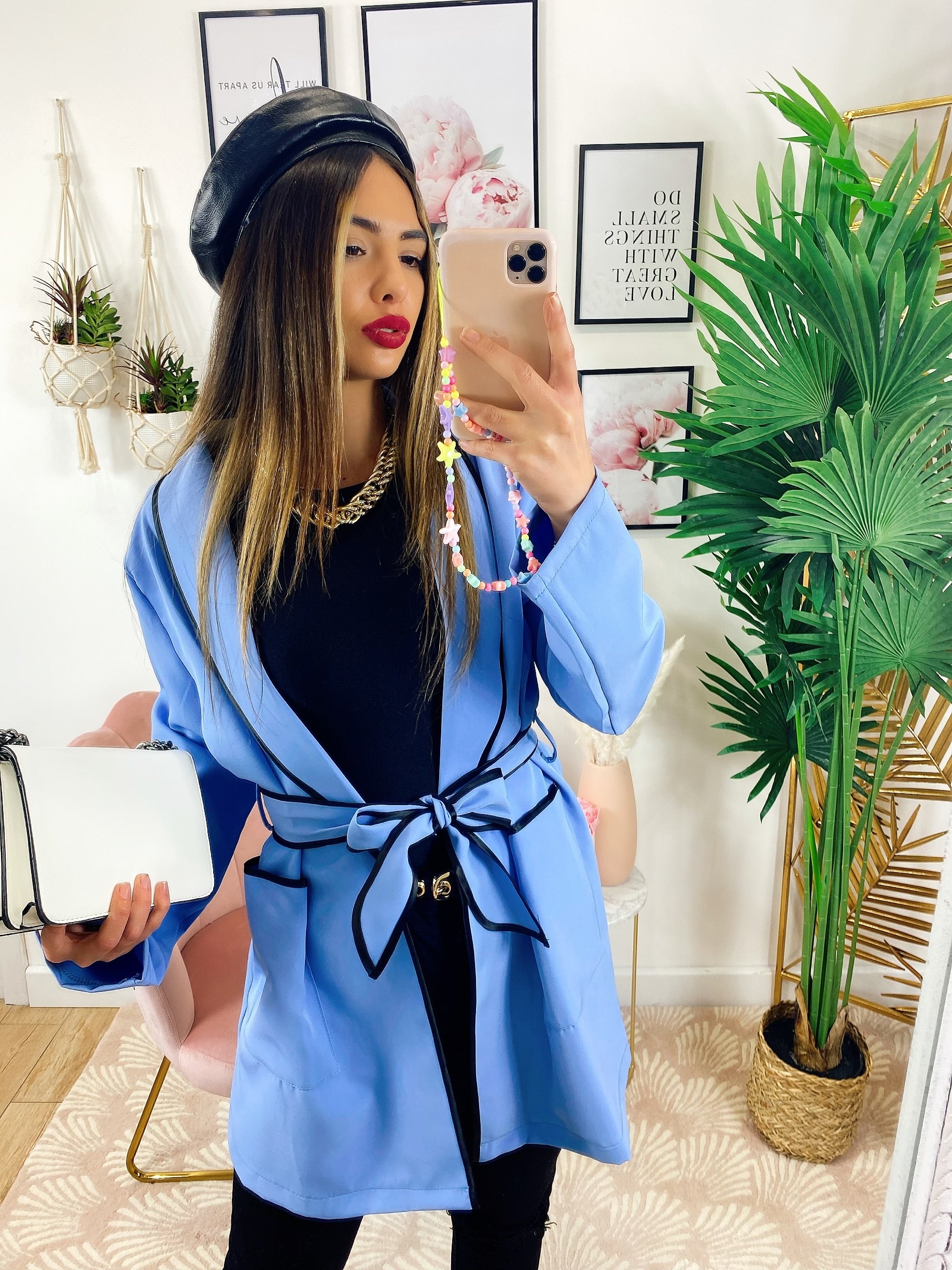 Giacca con cintura in vita celeste con dettaglio nero, ottima vestibilità, Tessuto primaverile.