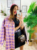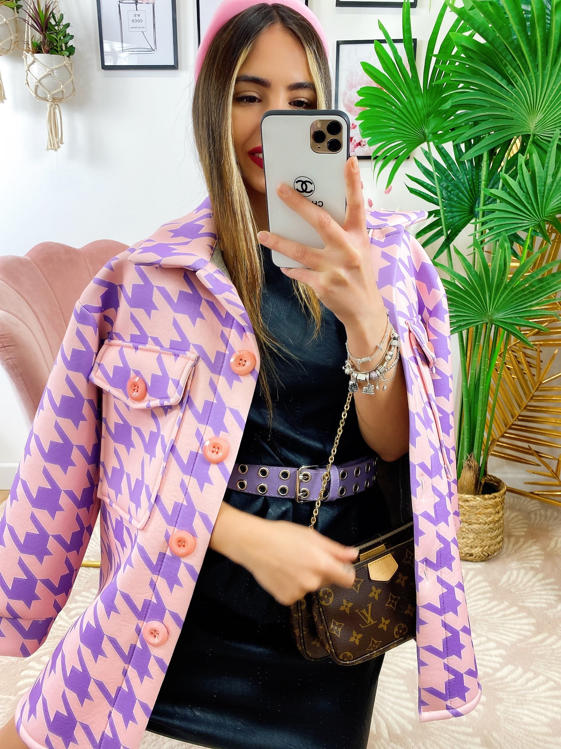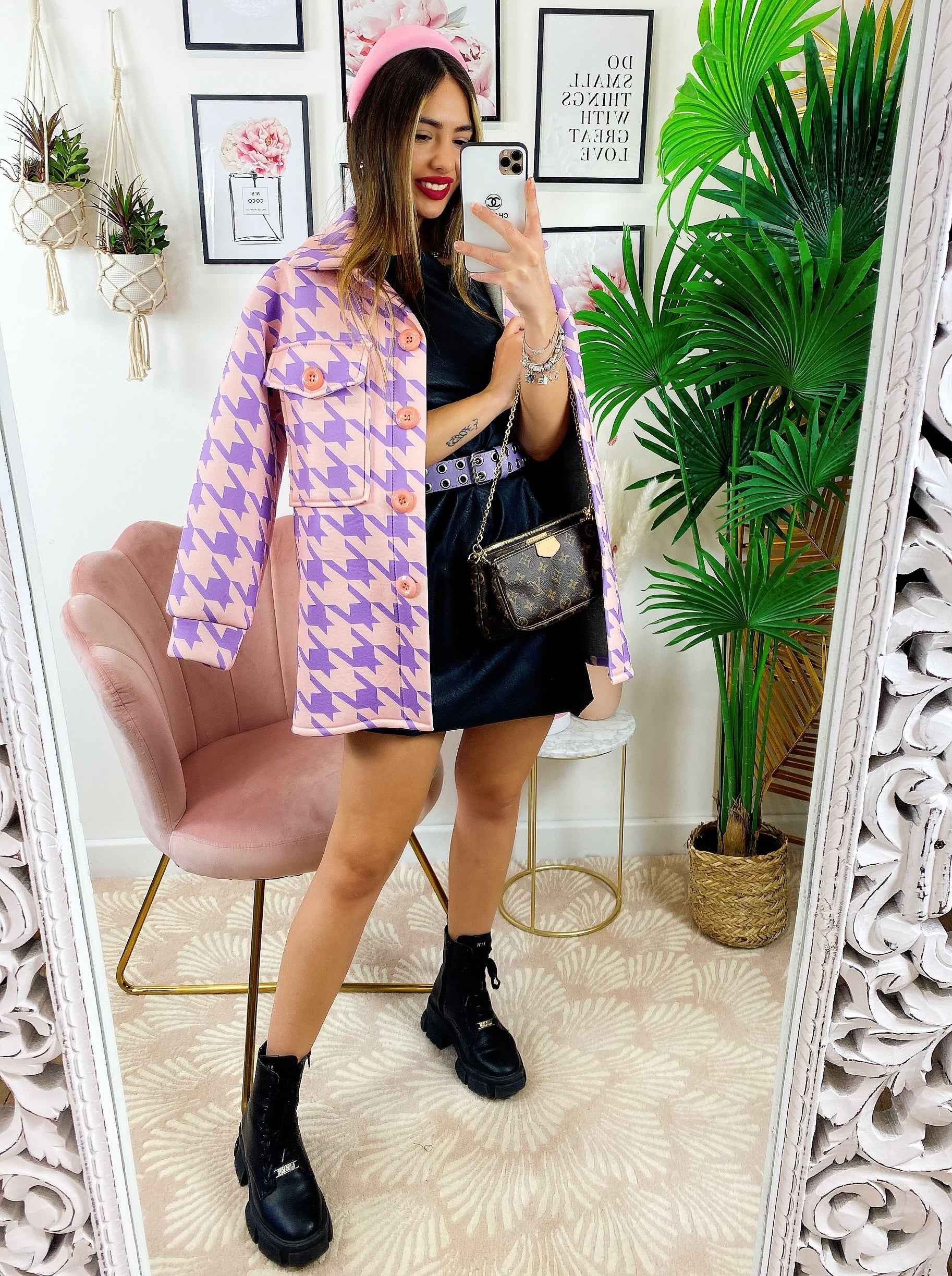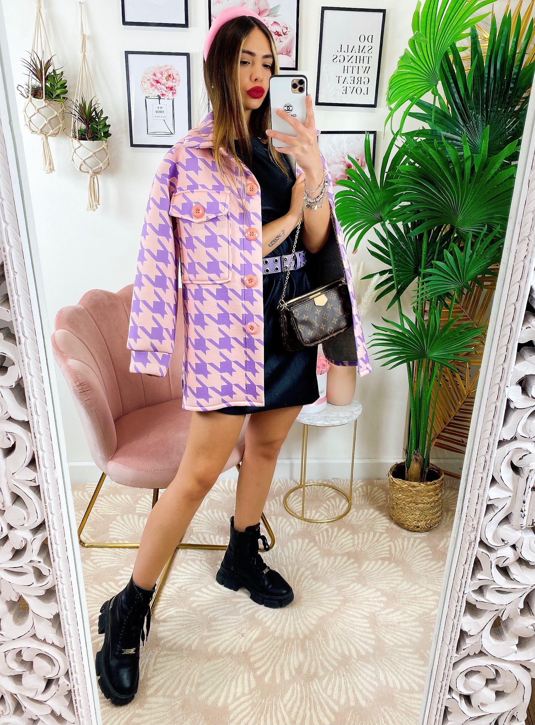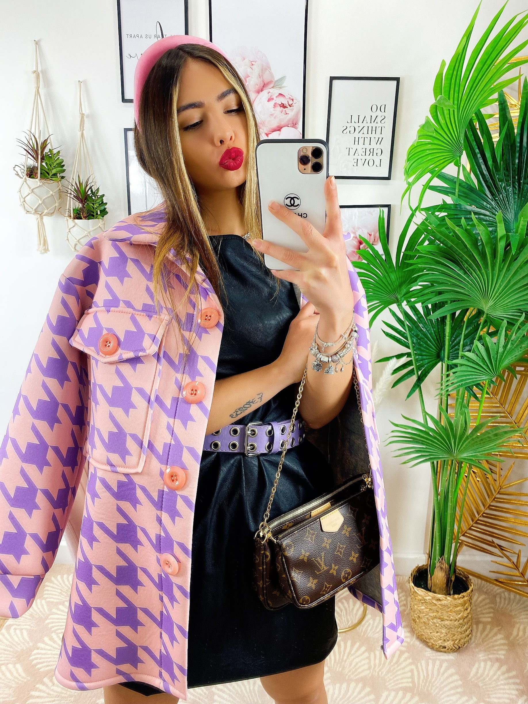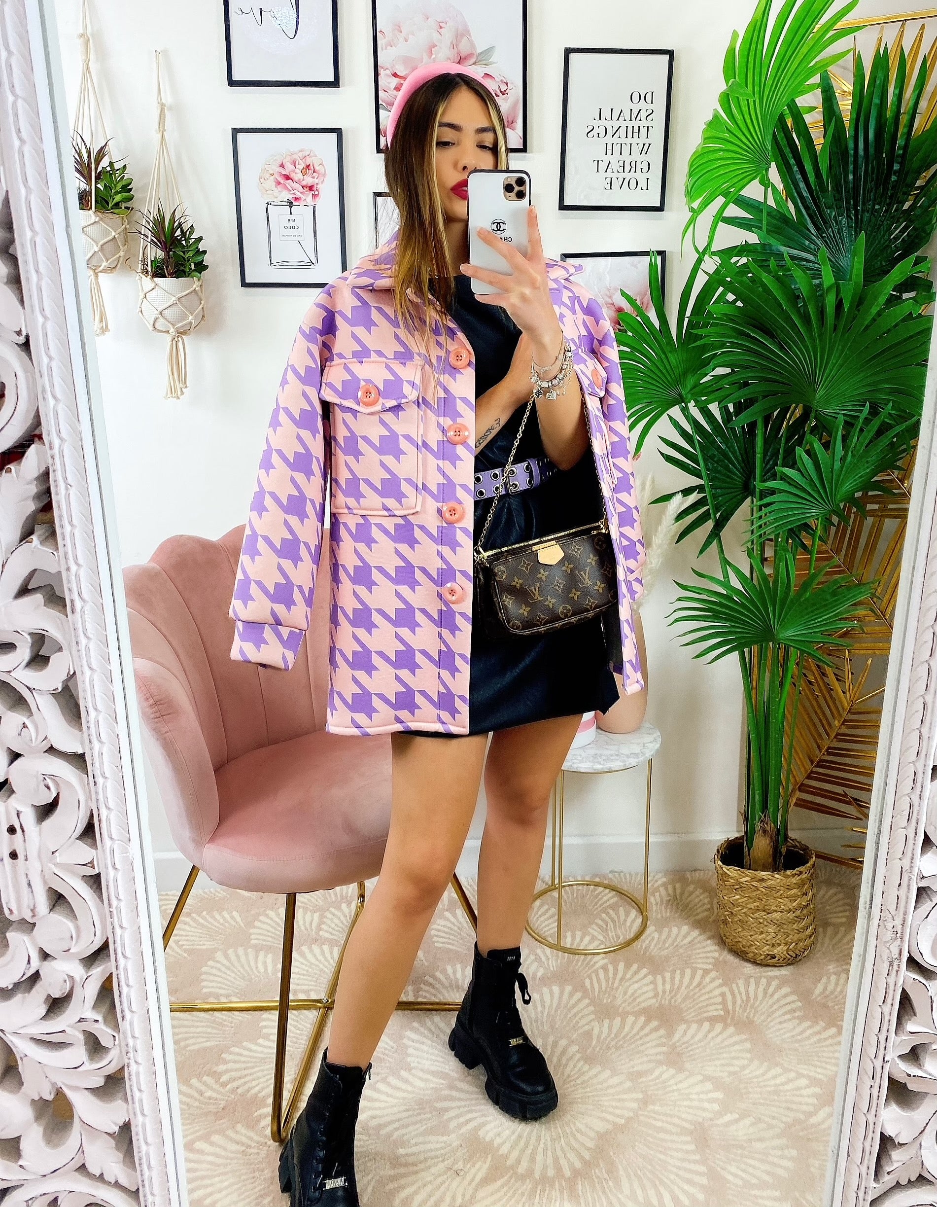 Giaccone trama pied de poule Rosa modello leggermente over, adatto sia alla primavera che all’autunno.