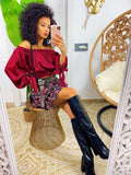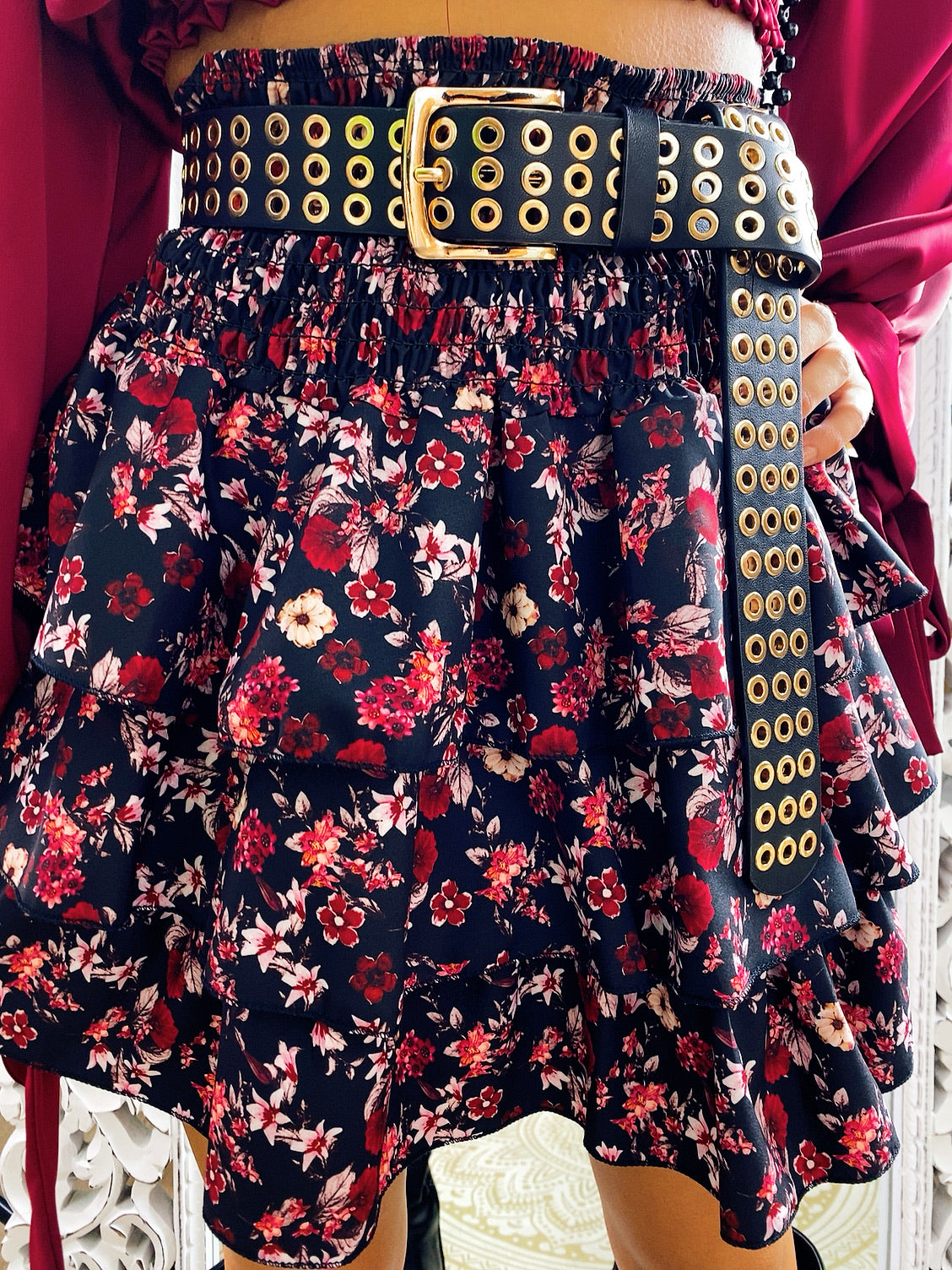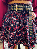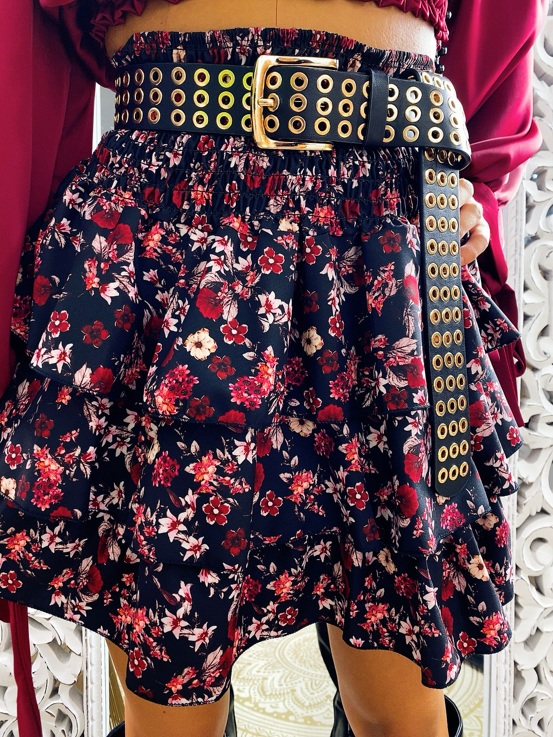 Gonna a fiorellini Bordeaux con elastico . La gonna è dotata di un elastico in vita molto largo così da renderla adattabile a tutte le taglie.