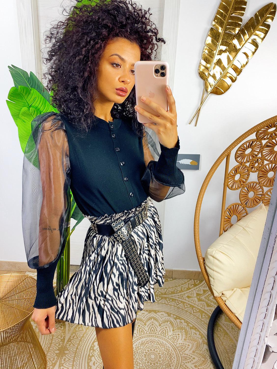 Gonna a pieghine in tessuto zebrata. La gonna è dotata di un elastico in vita così da renderla adattabile a tutte le taglie. La gonna è foderata e con pantaloncino nello stesso tessuto