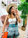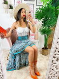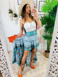 Gonna asimmetrica celeste fiorellini bianchi