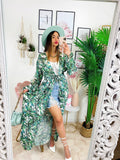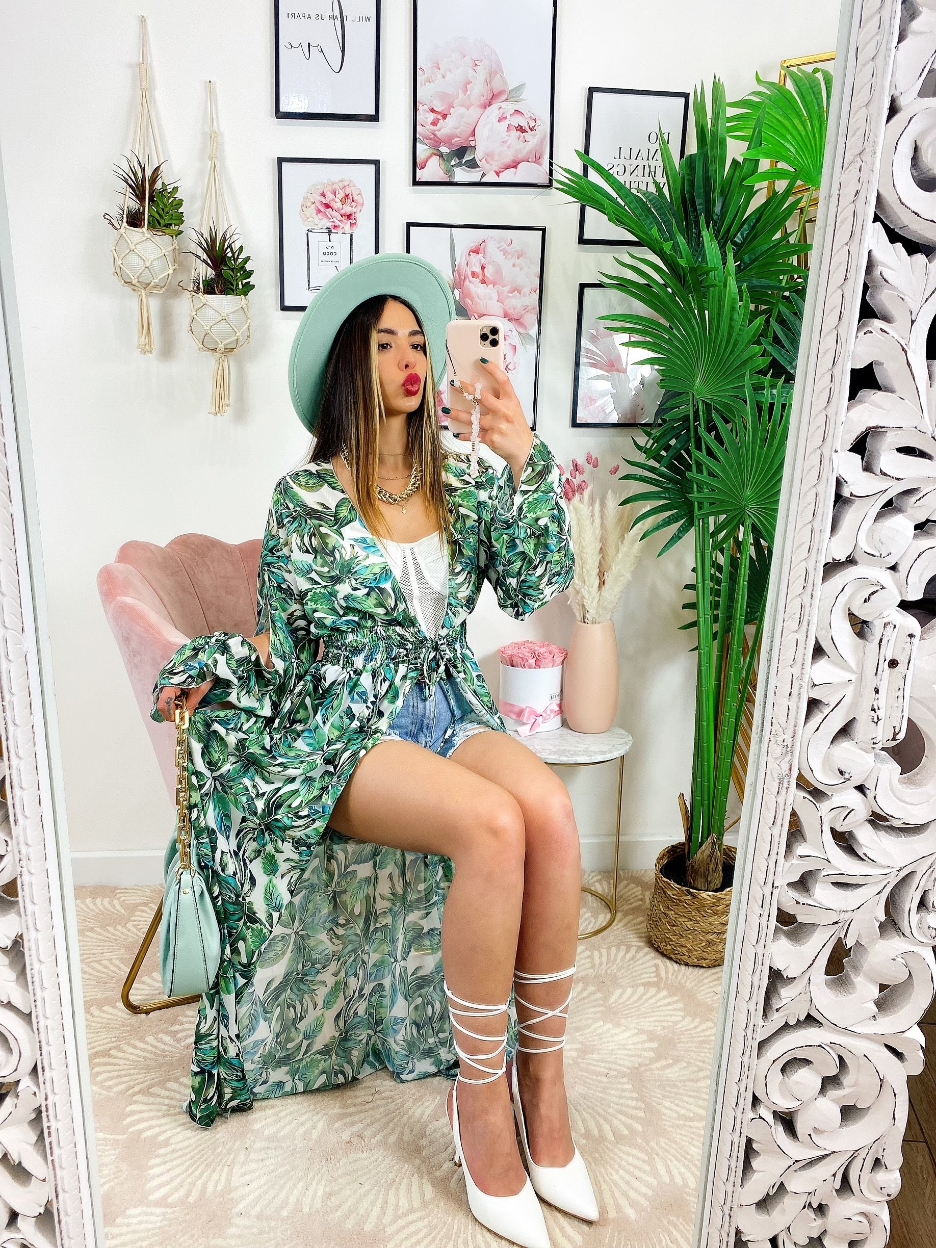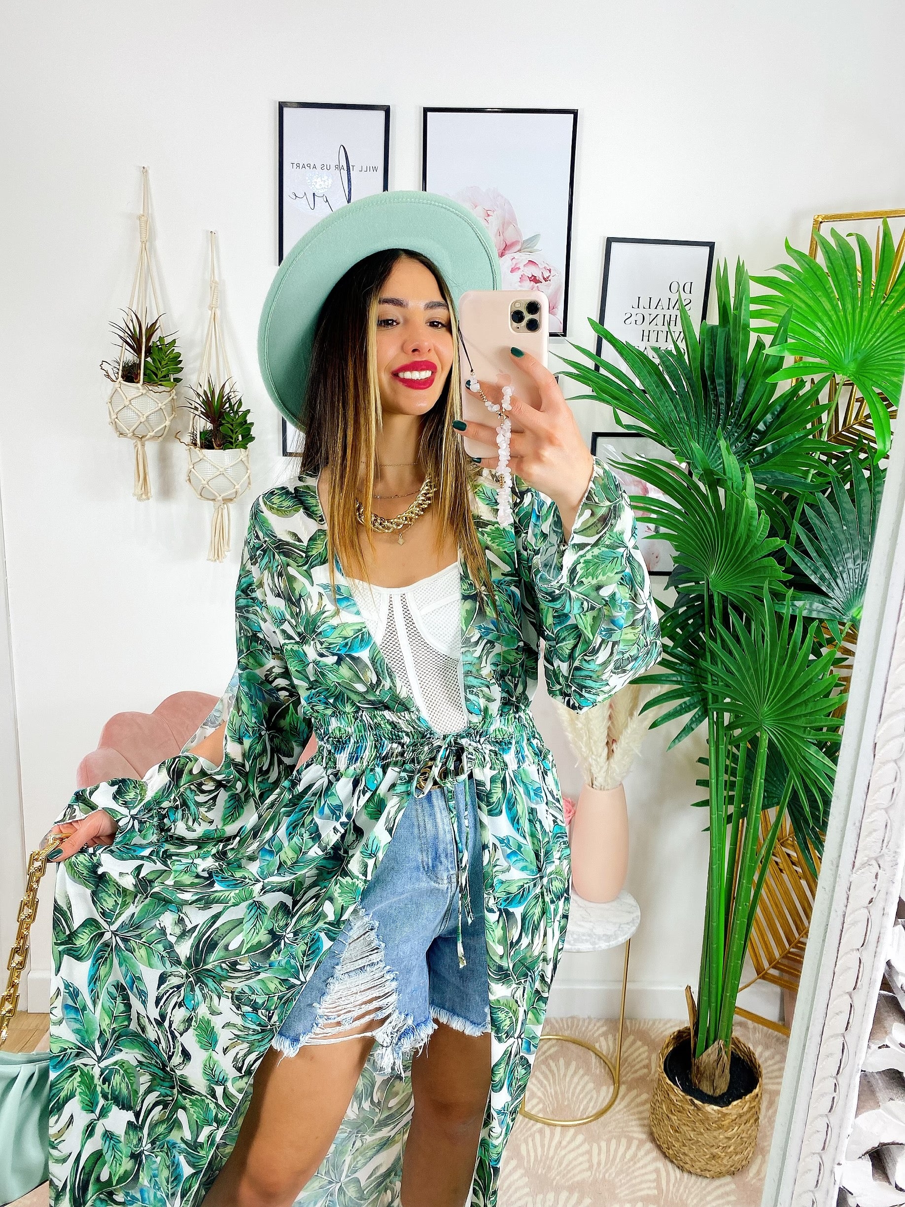 Maxi kimono lungo estivo dal tessuto morbido con elastico e in vita e sul polso.