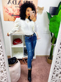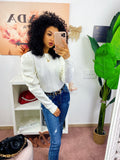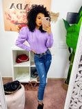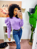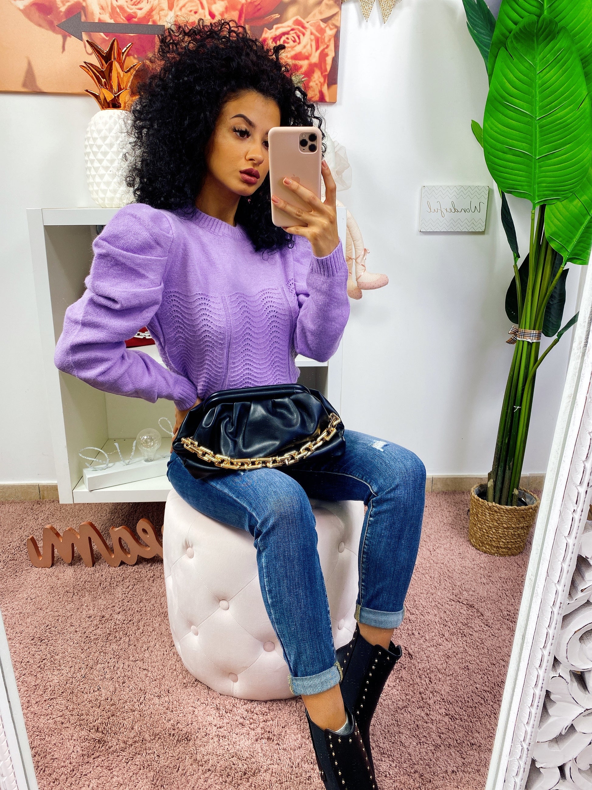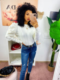Maglioncino in tessuto medio pesante con manica bombata arricciata. Taglia unica tessuto elasticizzato.
