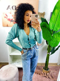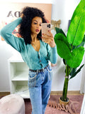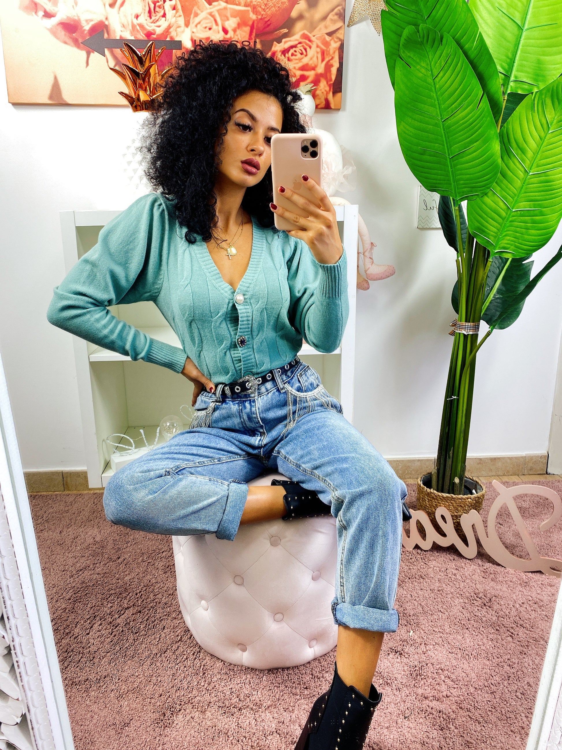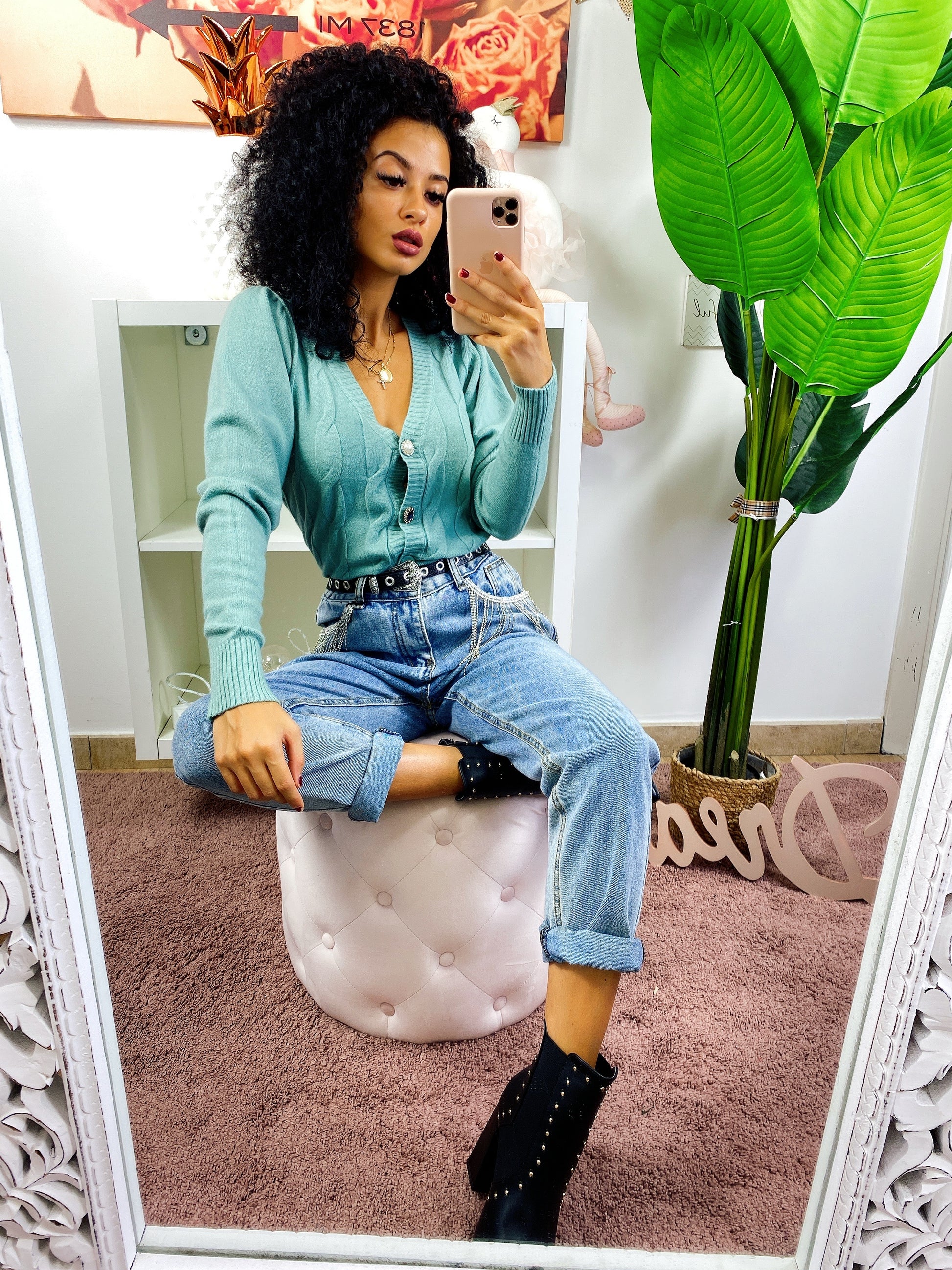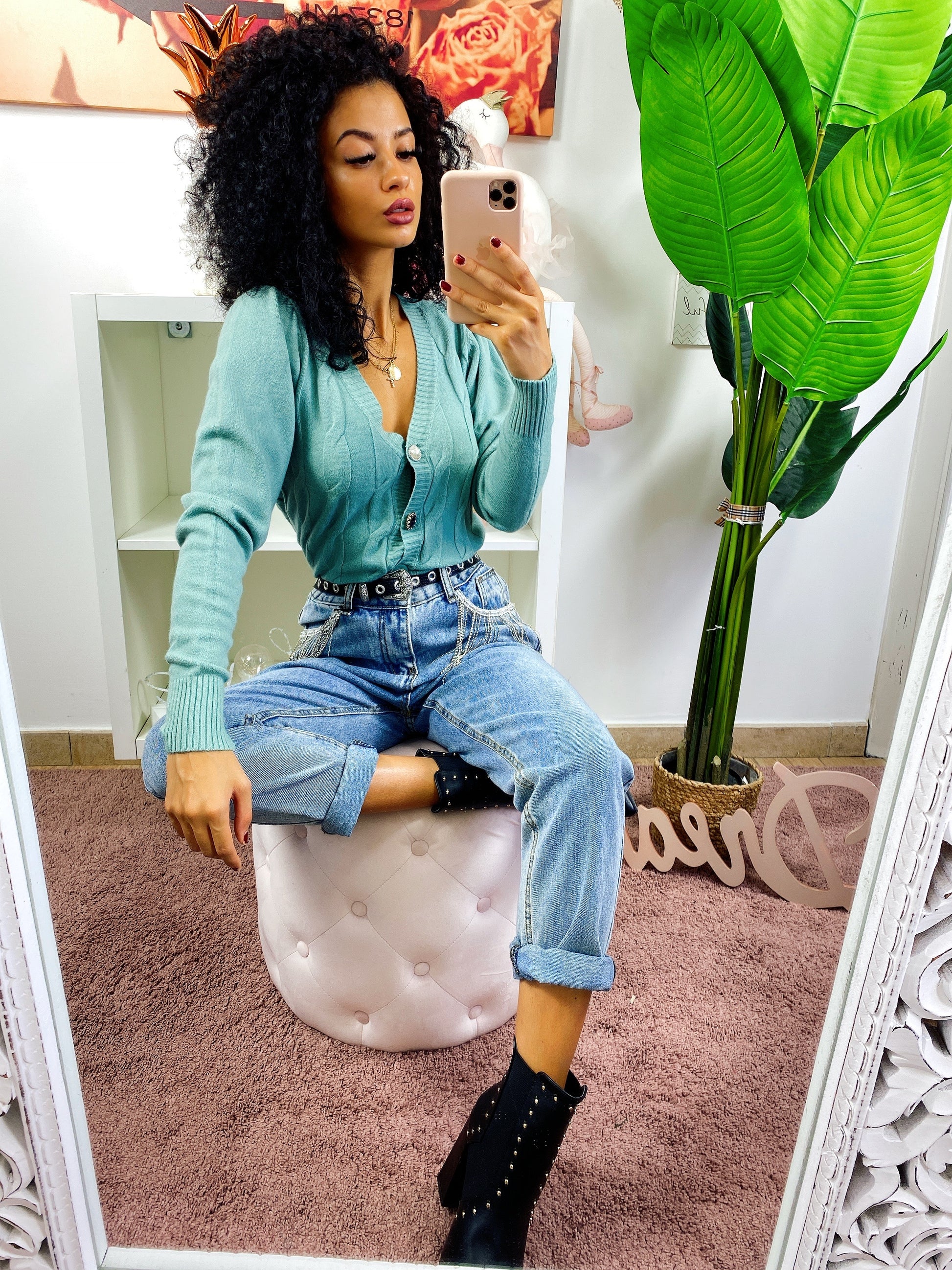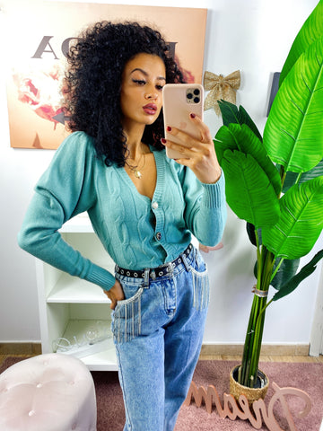 Maglioncino o cardigan con bottoni oro. Trama a trecce e scollo a V. Taglia unica