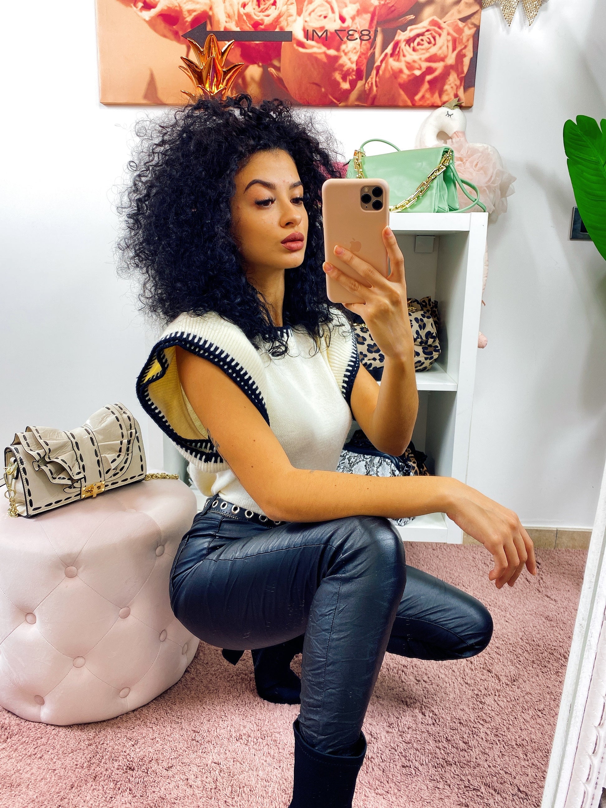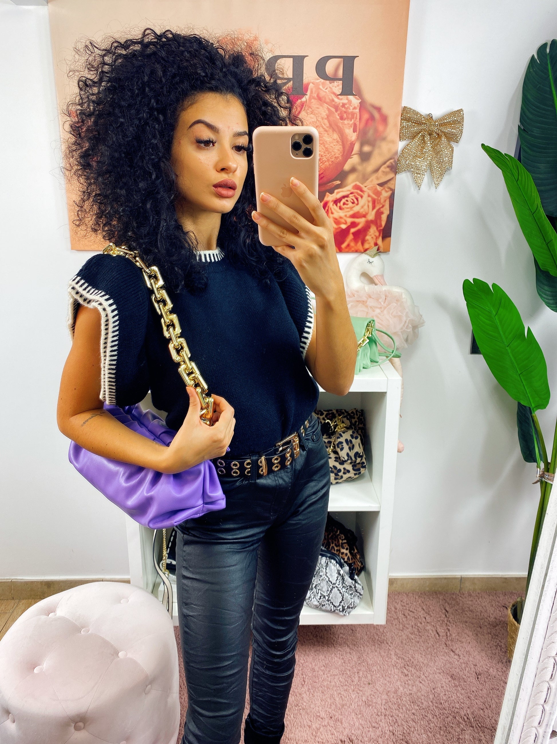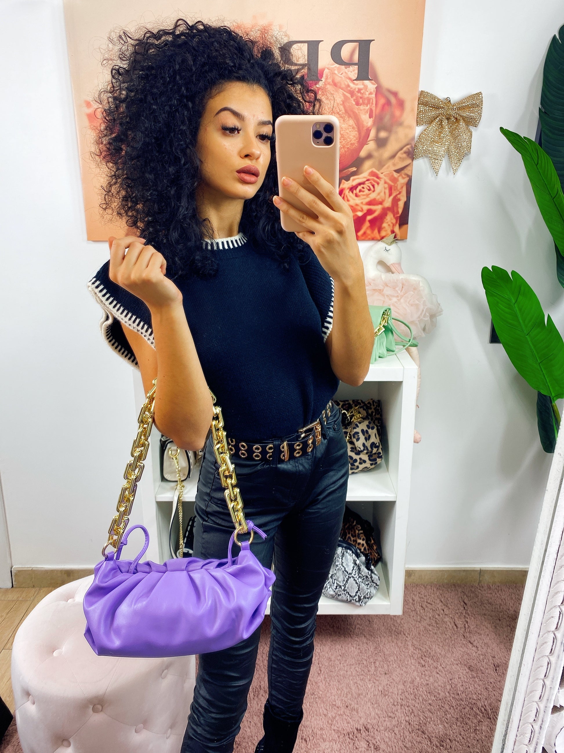 Maglioncino particolarissimo bicolore con manica molto ampia, in un morbidissimo tessuto caldo e pesante.