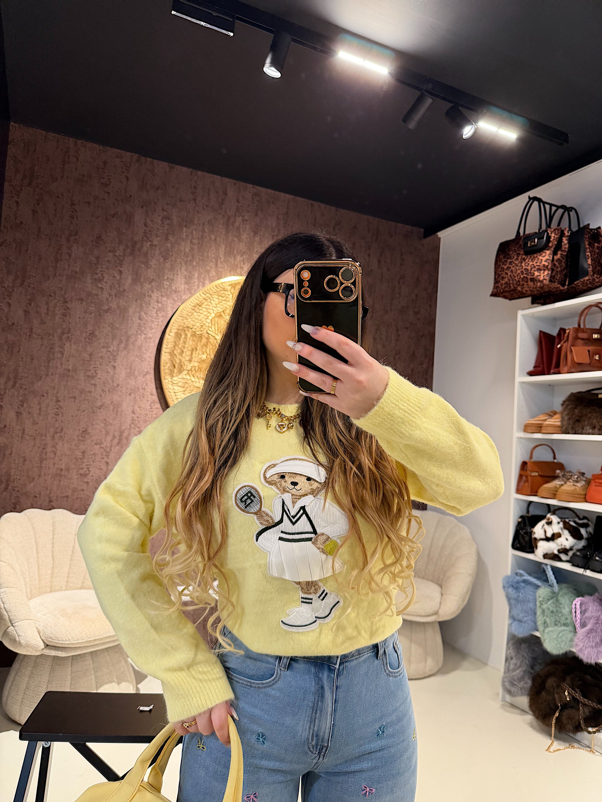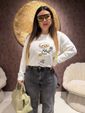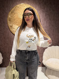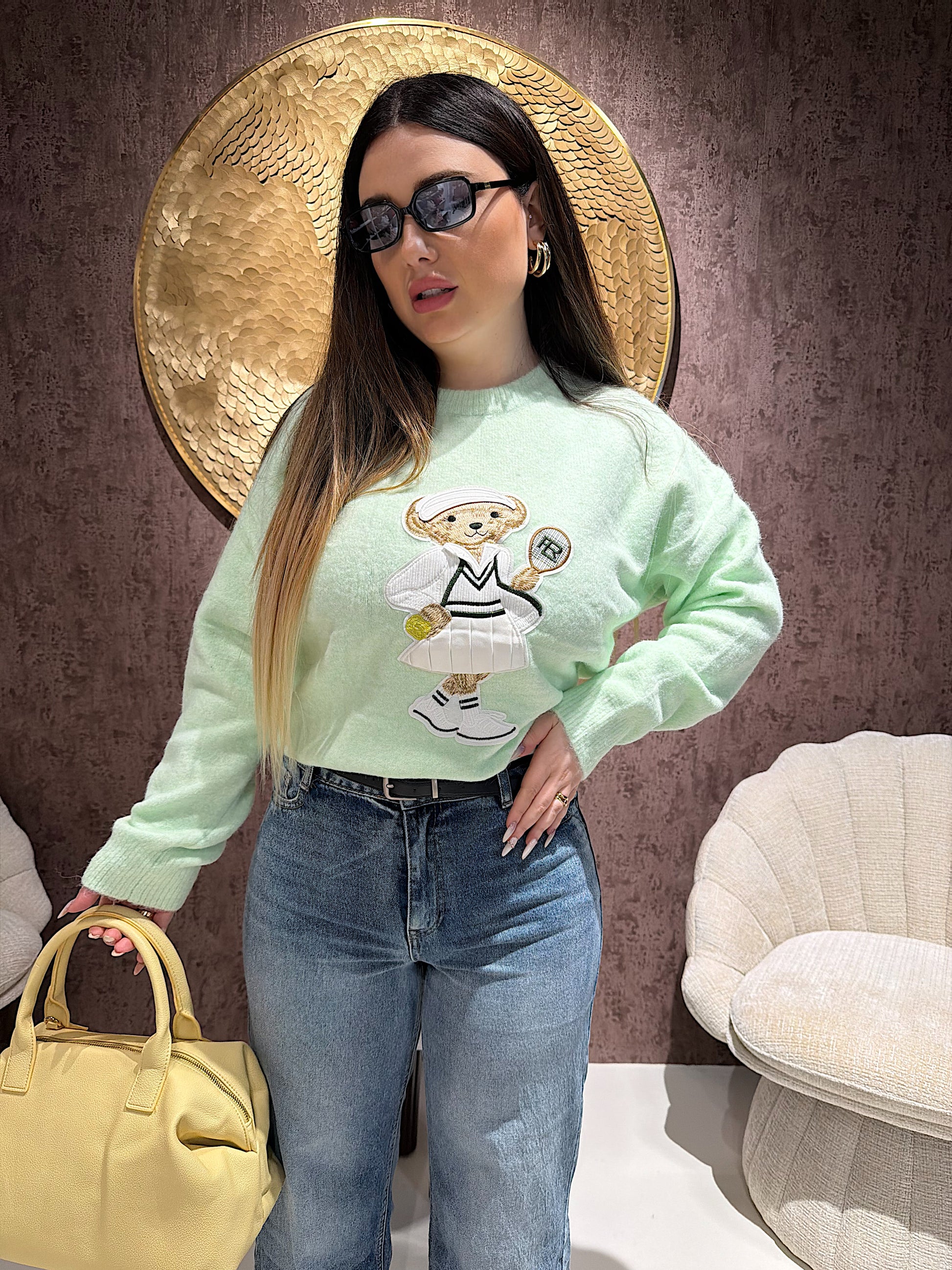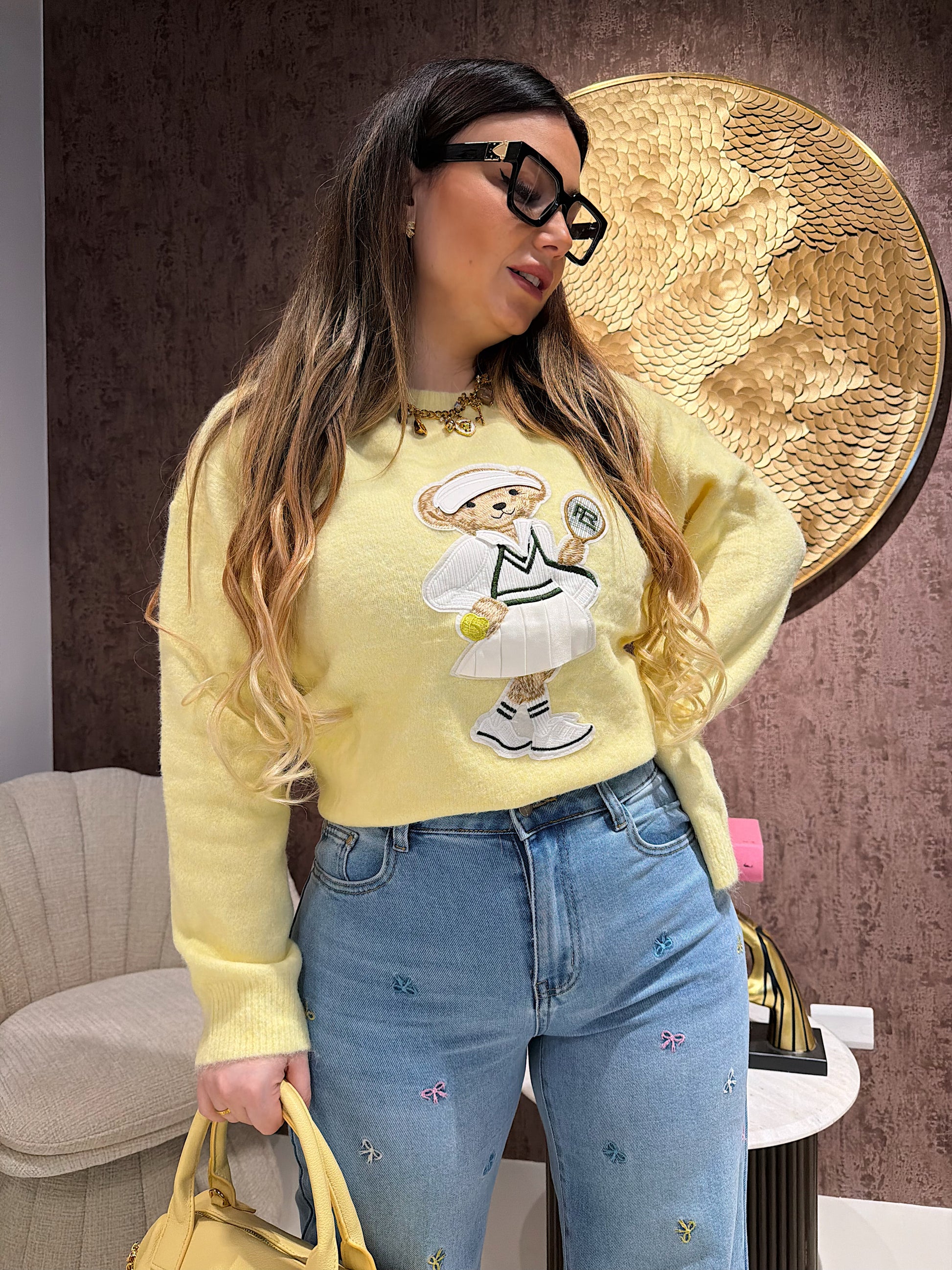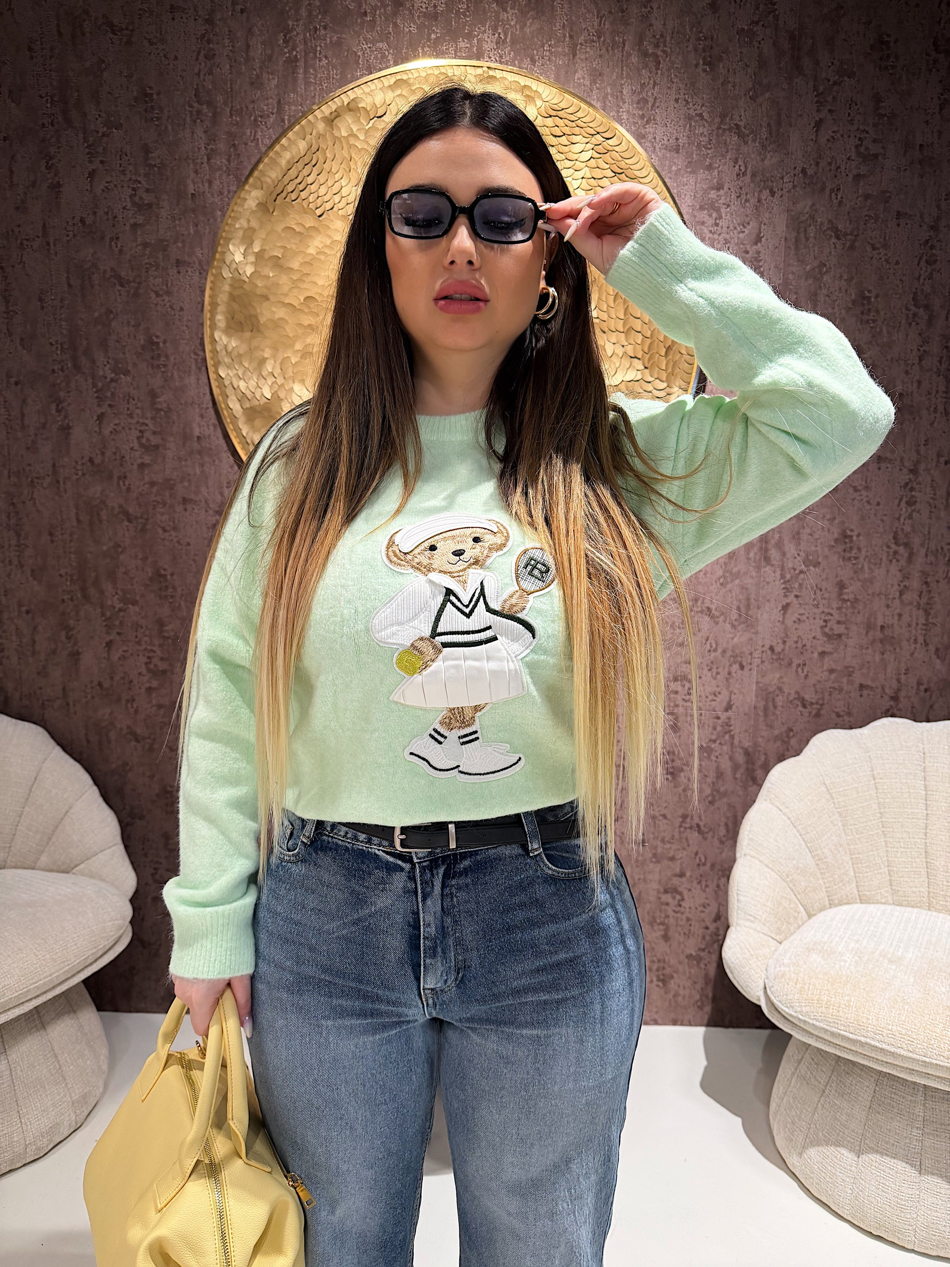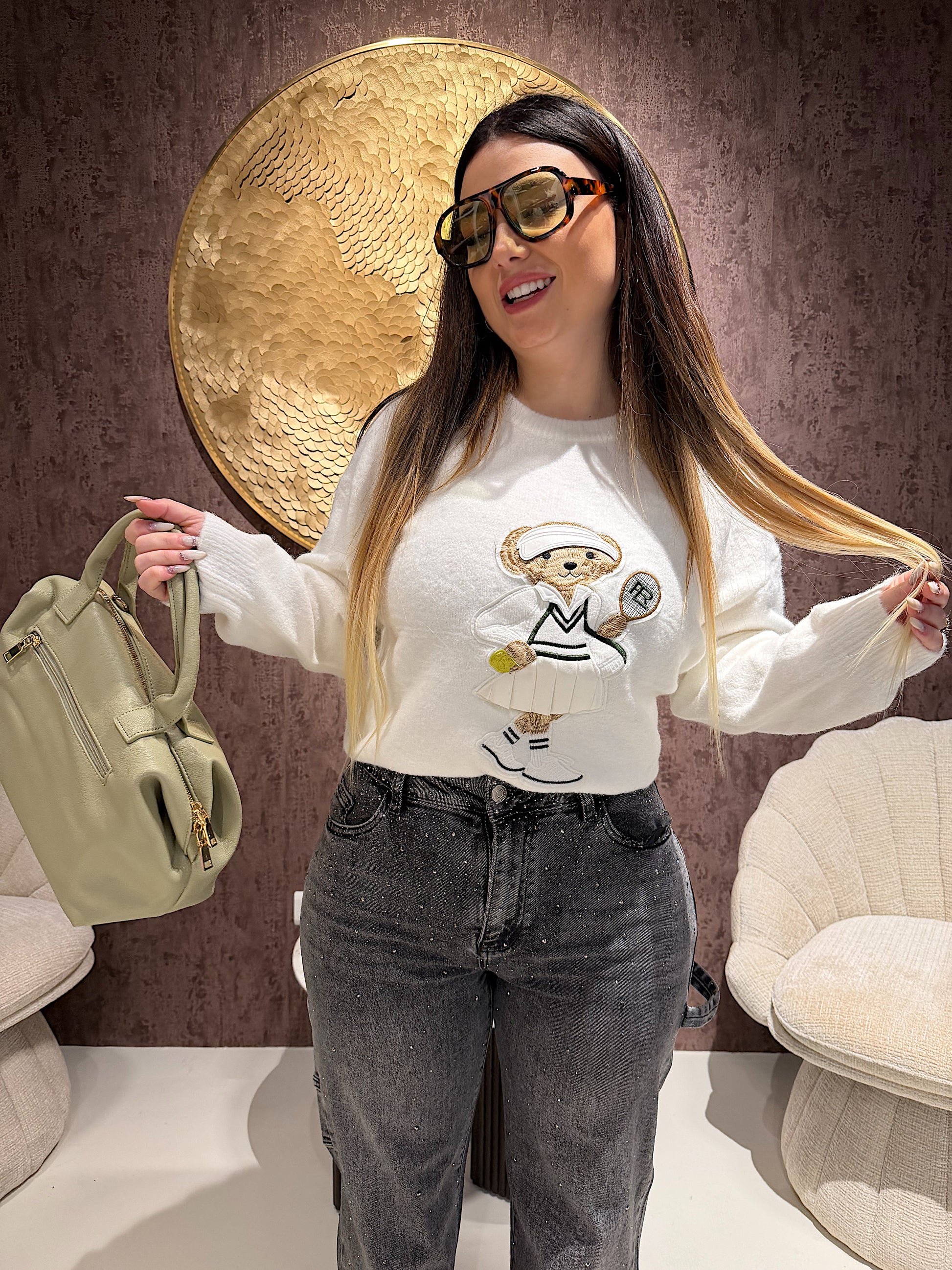 Maglioncino morbido e avvolgente, realizzato in filato soffice dal tocco delicato sulla pelle. Il protagonista è il ricamo Teddy in versione tennis, un dettaglio giocoso e super trendy che rende il capo unico e irresistibile.