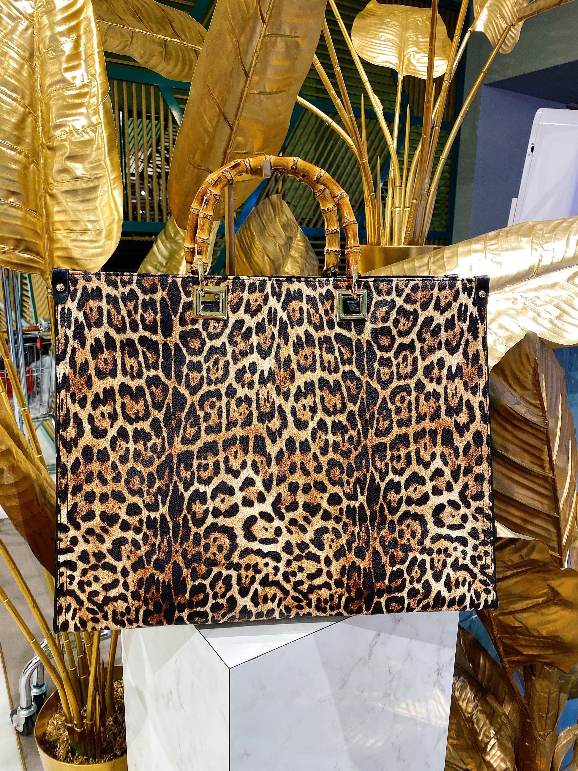 Maxi bag maculata con manico in legno