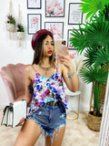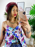 Maxi maglia floreale con catena, corta davanti e lunga dietro.