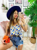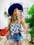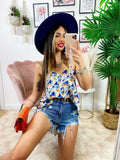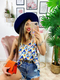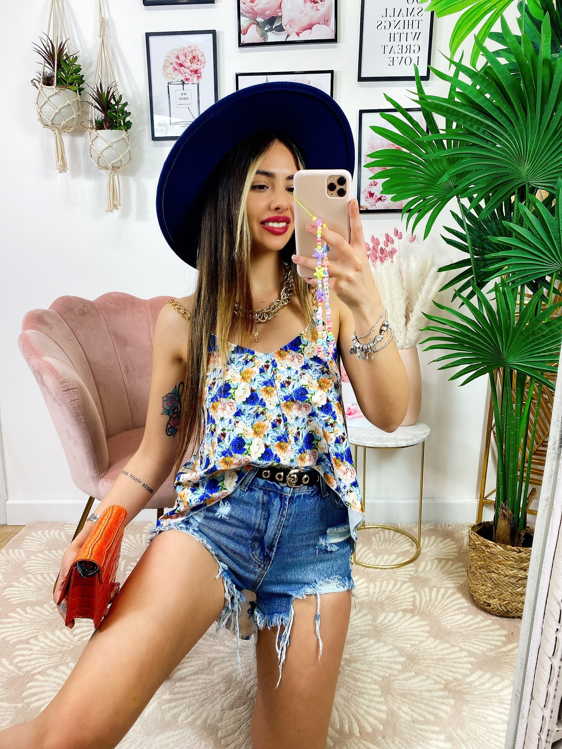 Maxi maglia floreale con catena, corta davanti e lunga dietro.