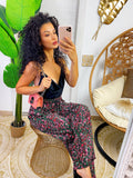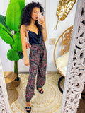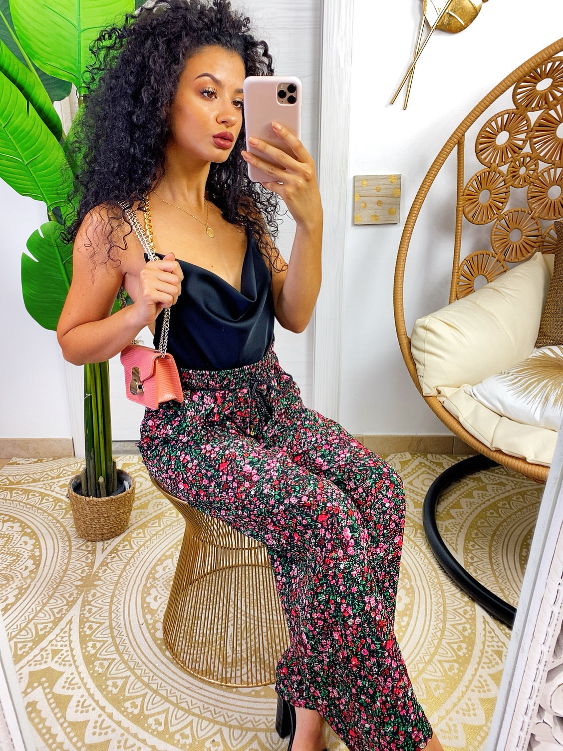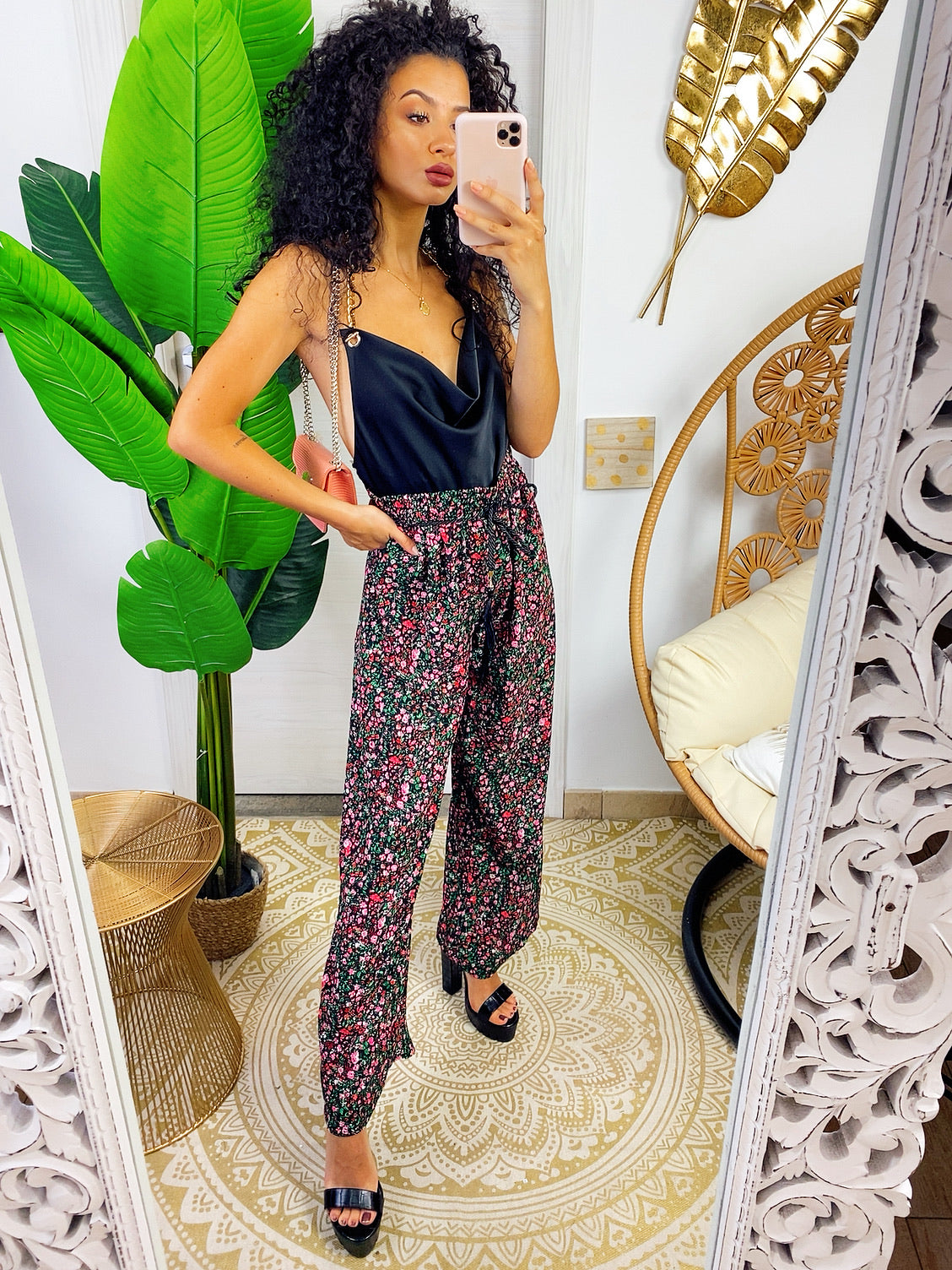 Pantalone a vita alta arricciato e elasticizzato , tessuto leggero e fresco con stampa a fiori. Cinturino in vita