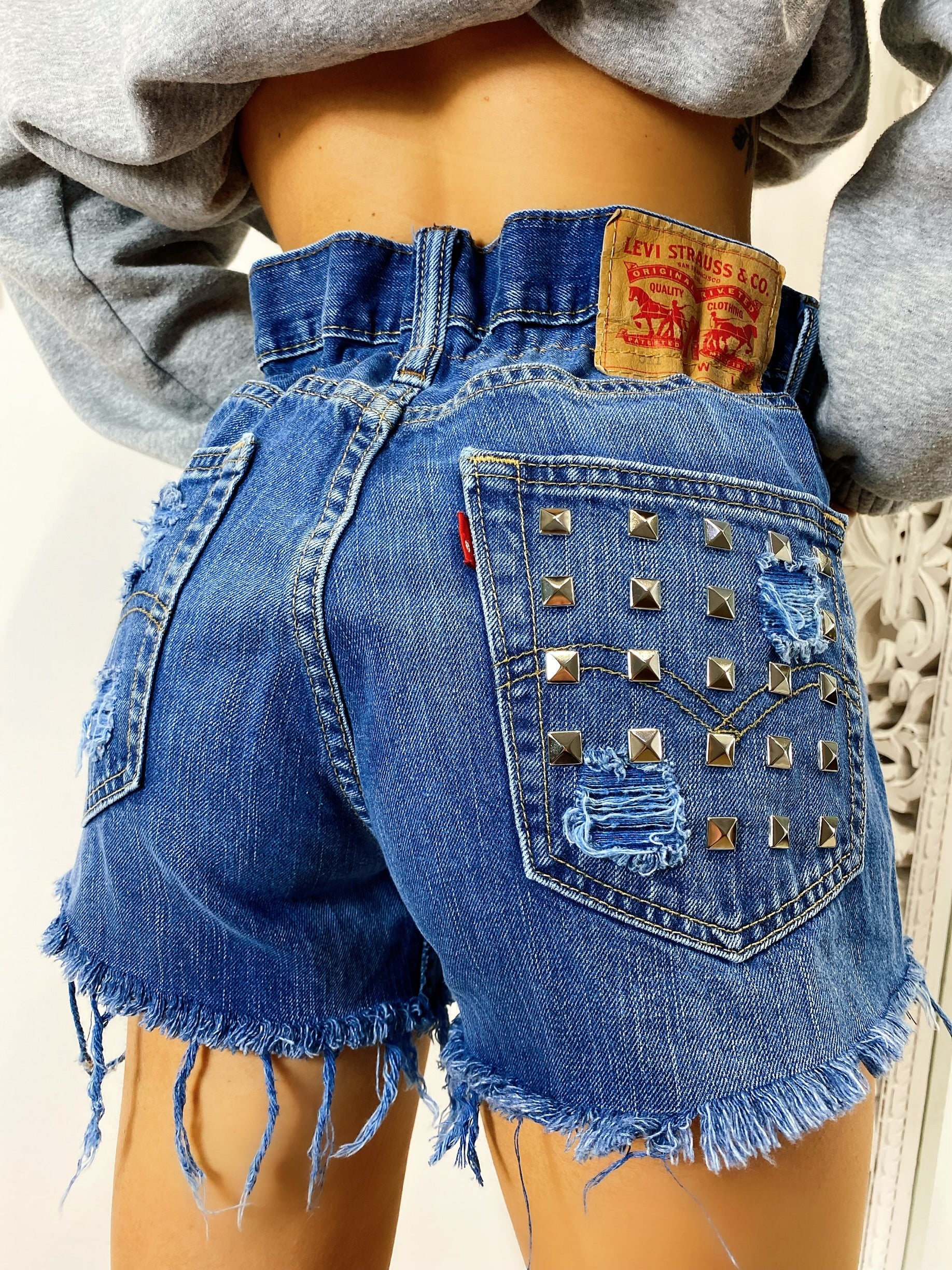 Short Vintage Levi’s alta qualità. Jeans vintage lavorati a mano Considerati pezzi unici poichè interamente Personalizzati. Lievi differenze rispetto alla foto ne denotano l'unicità e la sua completa lavorazione handmade.