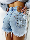 Short Vintage Levi’s alta qualità con strappi e borchie. Jeans vintage lavorati a mano Considerati pezzi unici poichè interamente Personalizzati. Lievi differenze rispetto alla foto ne denotano l'unicità e la sua completa lavorazione handmade.