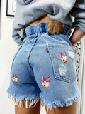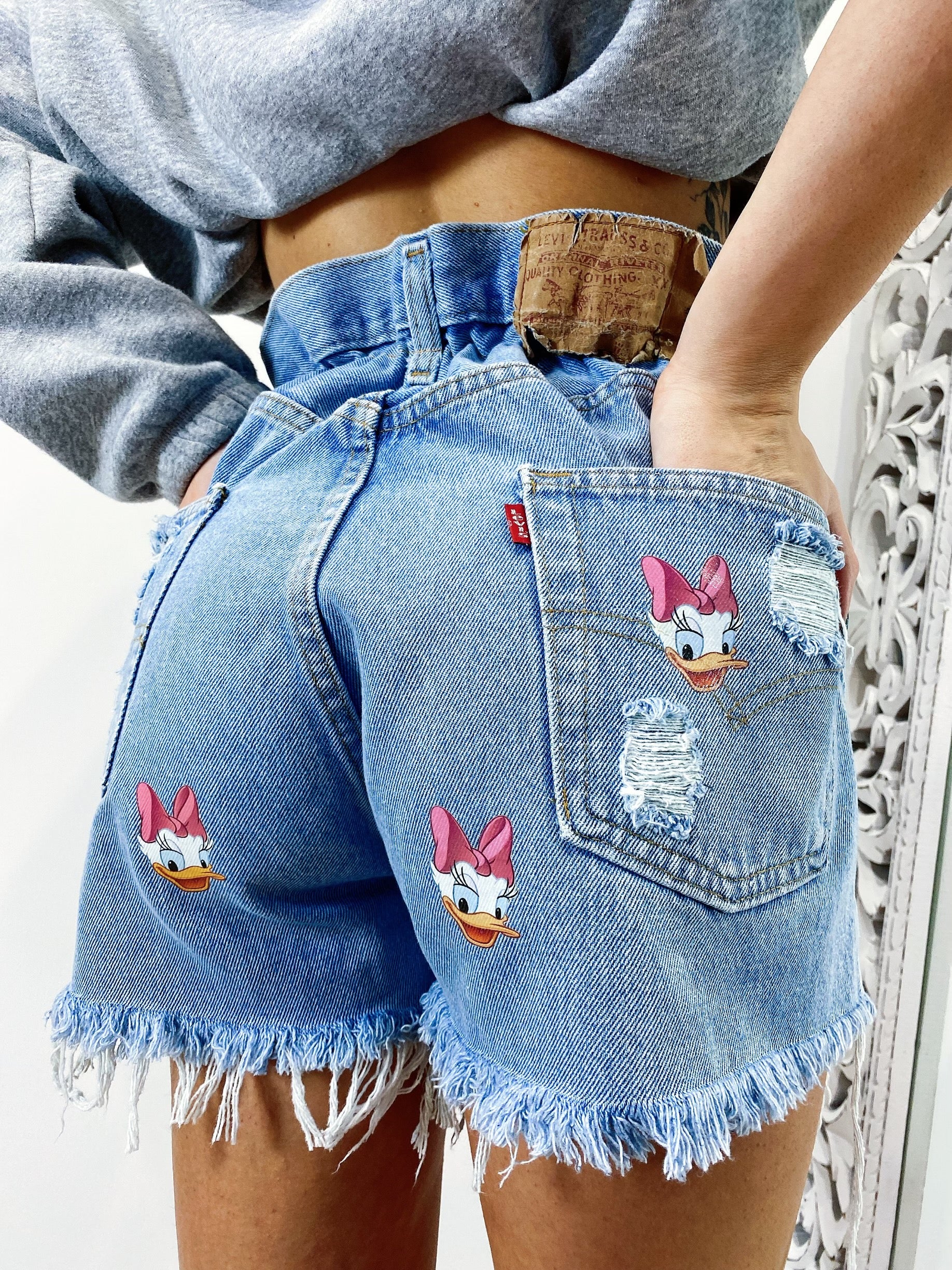 Short Vintage Levi’s alta qualità con strappi e stampa paperina.