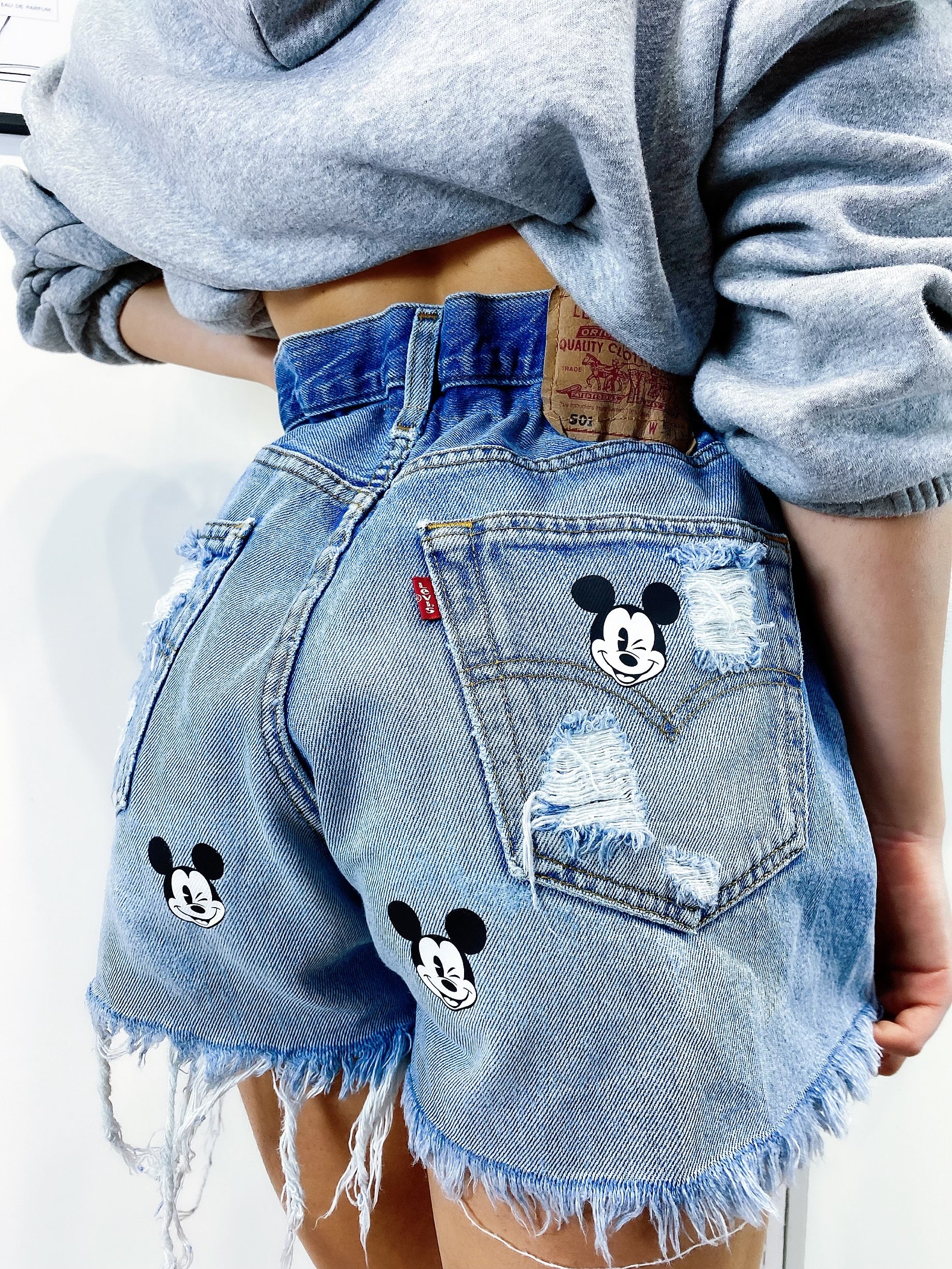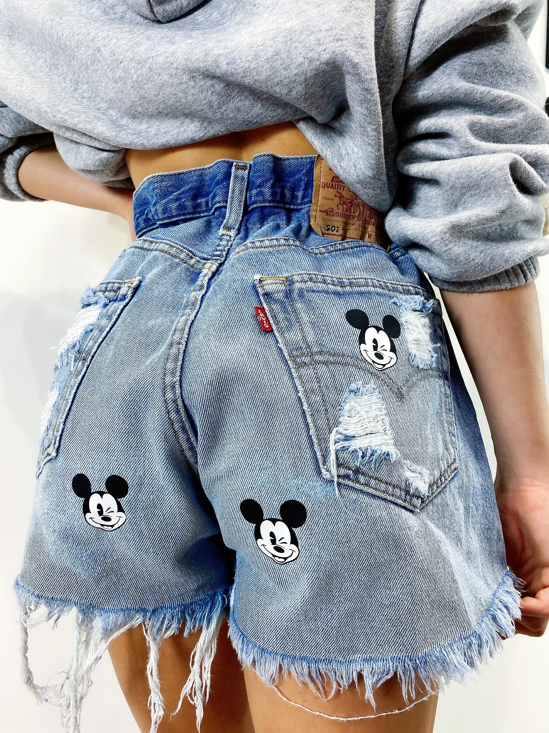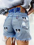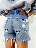 Short Vintage Levi’s alta qualità con strappi davanti e leggermente dietro, stampa topolino bagno colore medio.