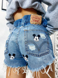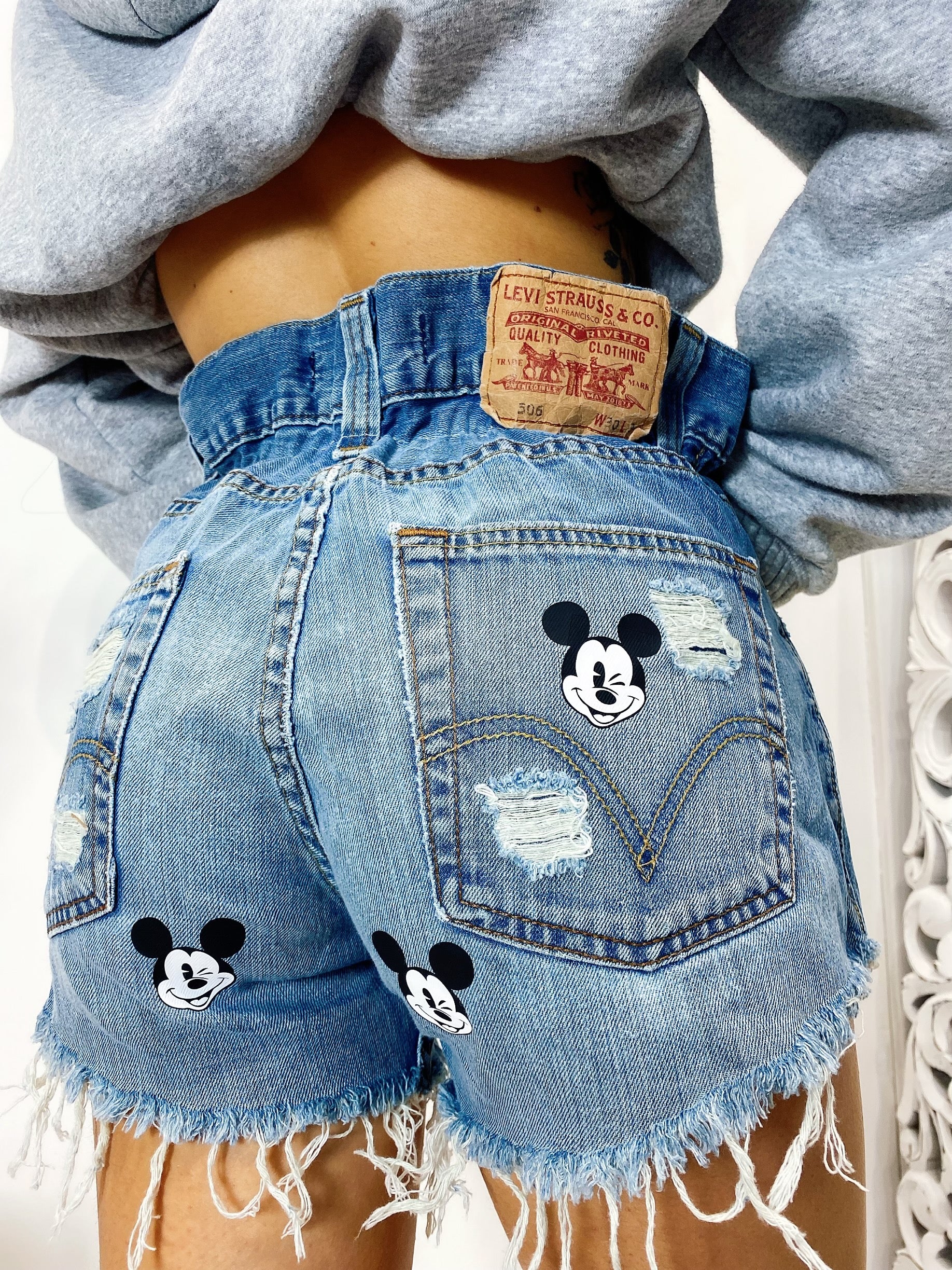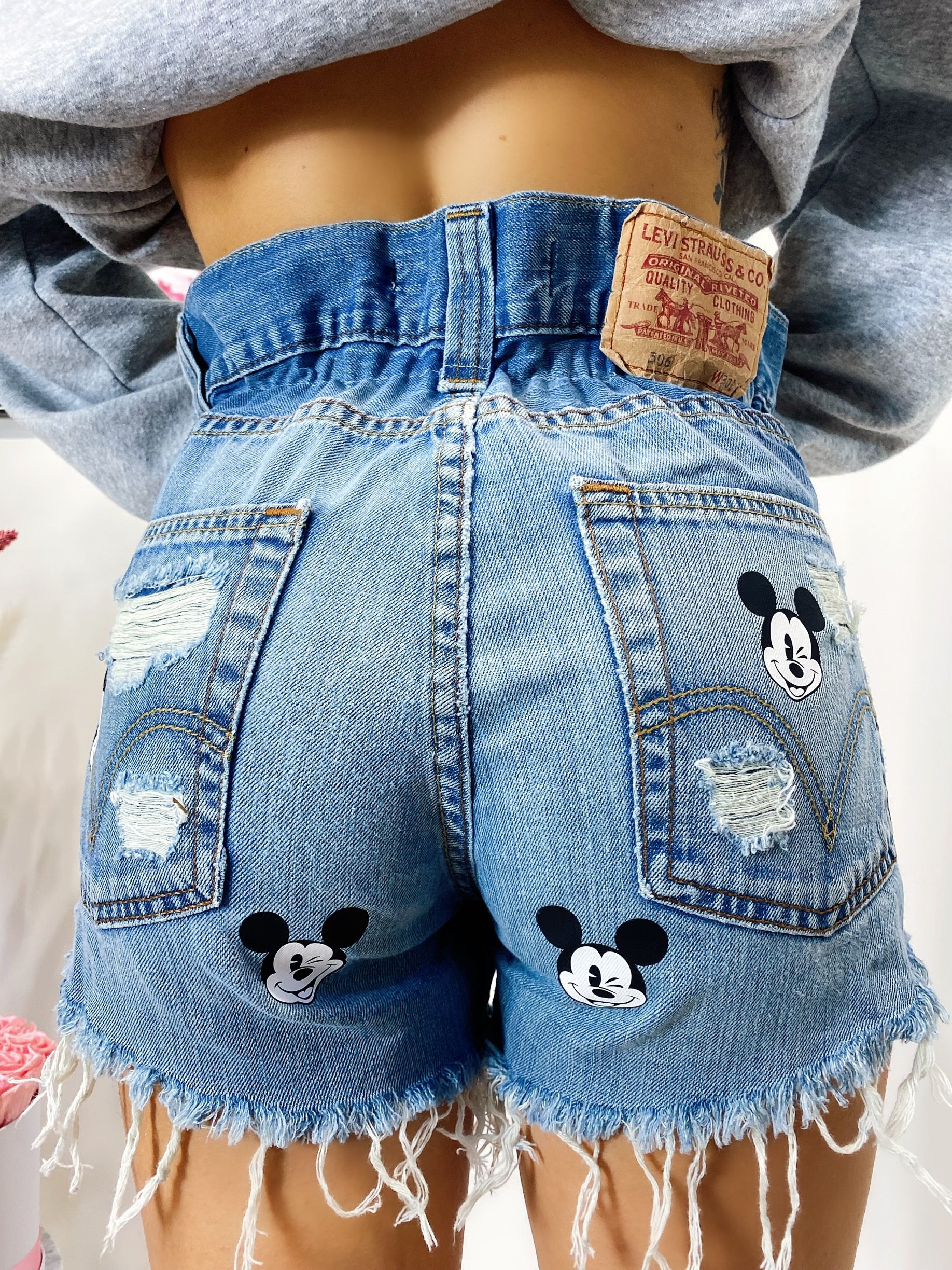 Short Vintage Levi’s alta qualità con strappi e stampa topolino bagno colore medio.