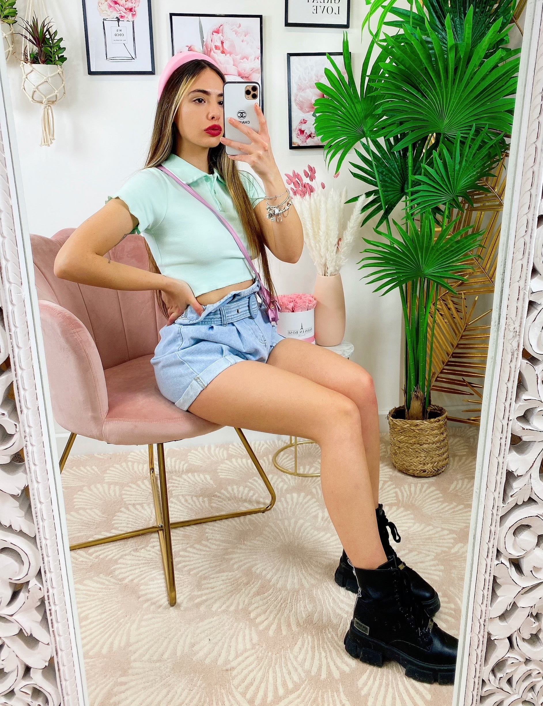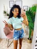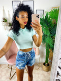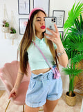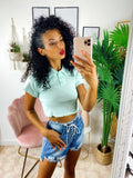 Top crop Verdeacqua a camicetta con manica leggermente arricciata. Blusa corta da tutti i giorni.