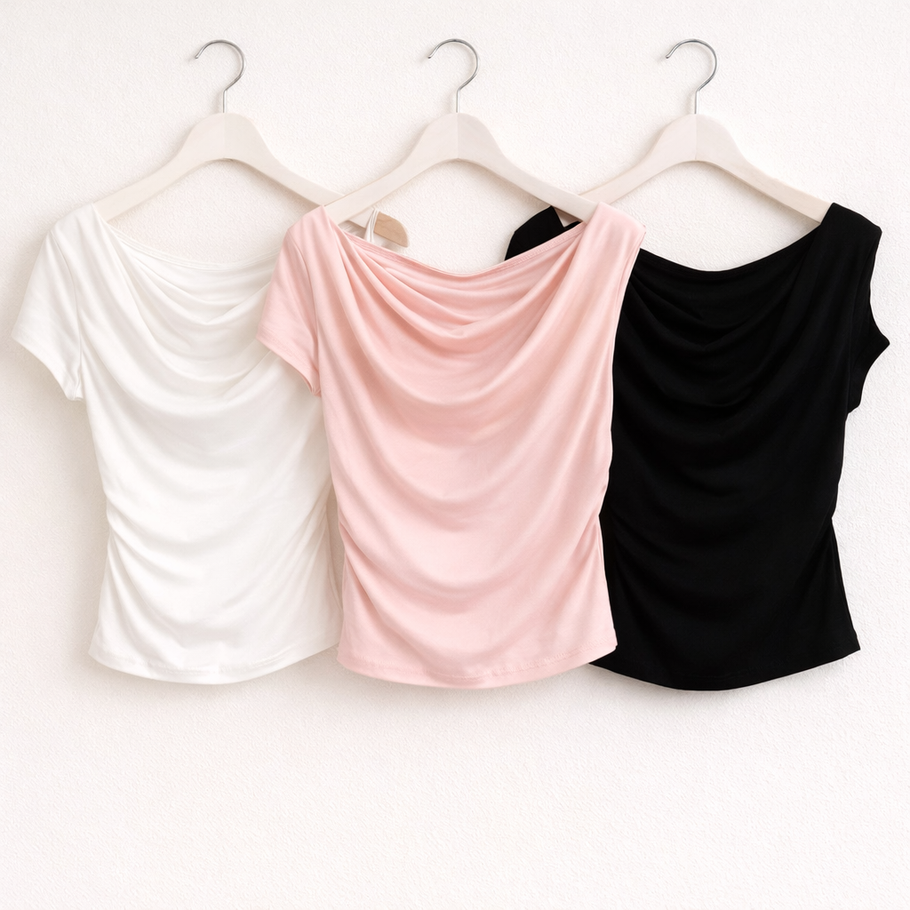 Top elegante con drappeggio frontale che valorizza il décolleté e dona un effetto super femminile e raffinato. Il tessuto morbido ed elasticizzato avvolge la silhouette adattandosi perfettamente al corpo.