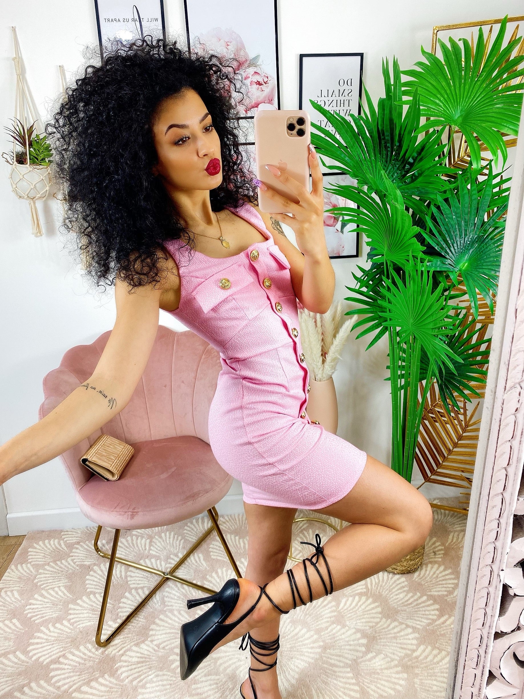Abito aderente con chiusura con zip sulla schiena. Bottoni oro e taschino.