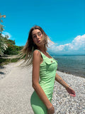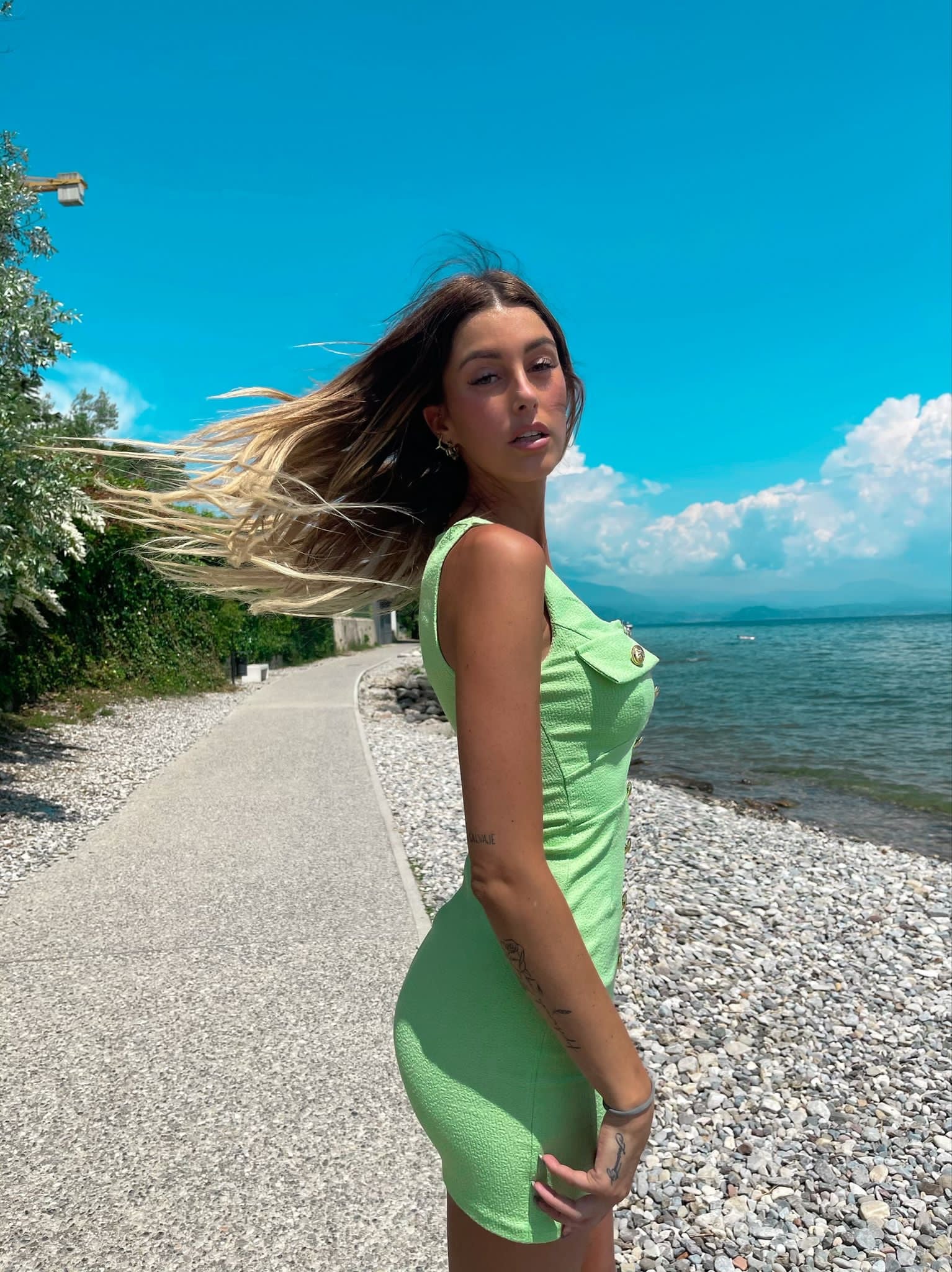 Abito aderente con chiusura con zip sulla schiena. Bottoni oro e taschino.