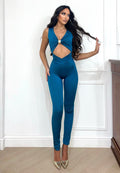 Tuta in lycra con coppe e zip nel dietro, pancia aperta e incrocio