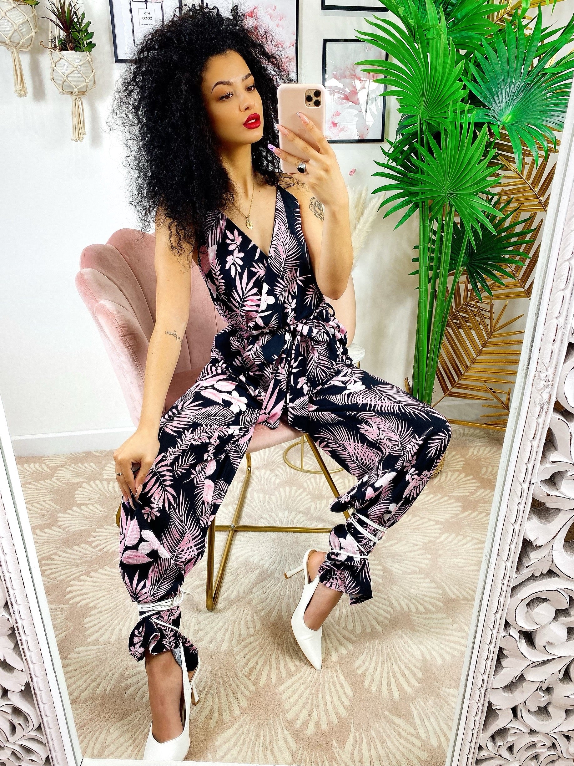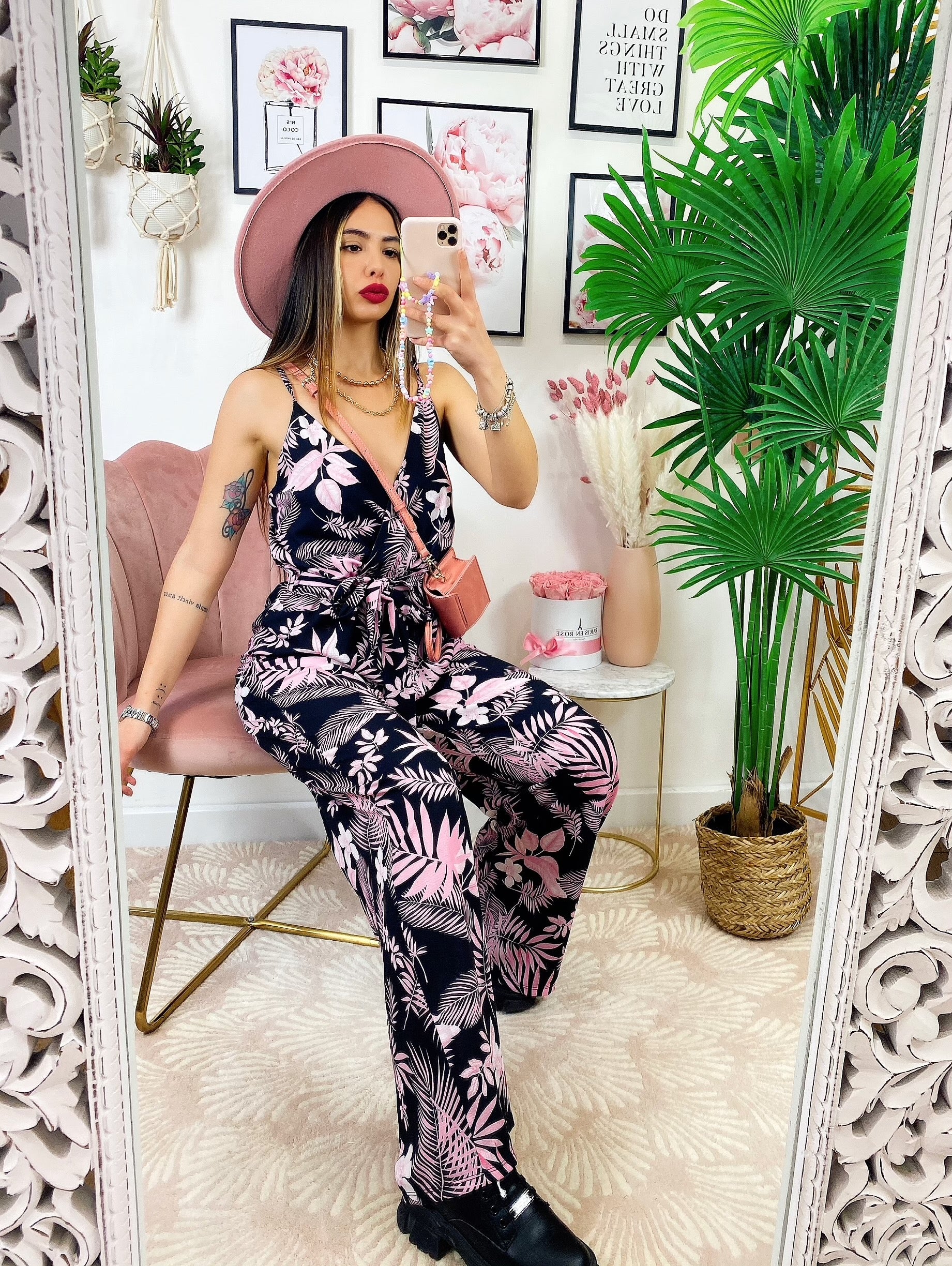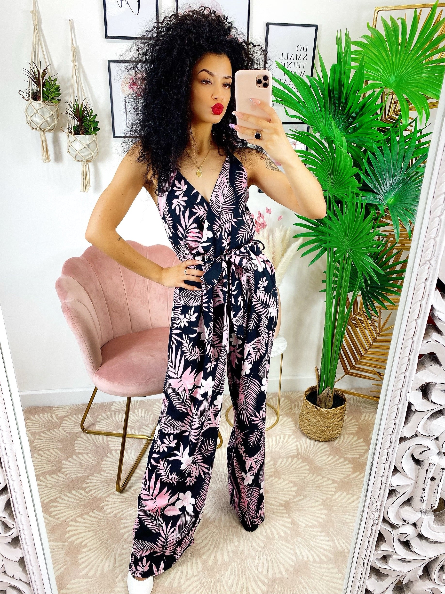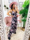 tuta floreale base nera fiorì Rosa Con spalline fisse e cintura regolabile.