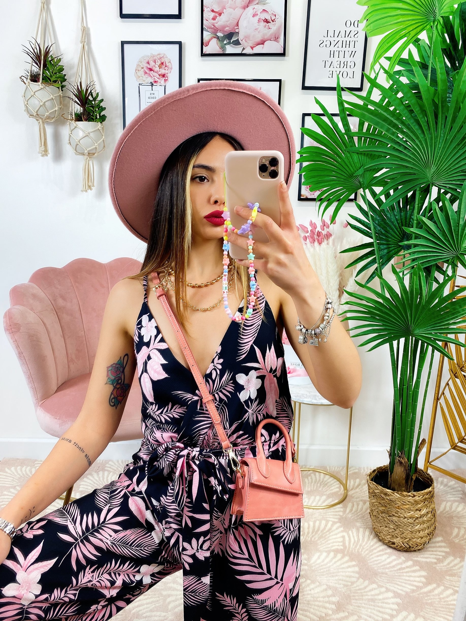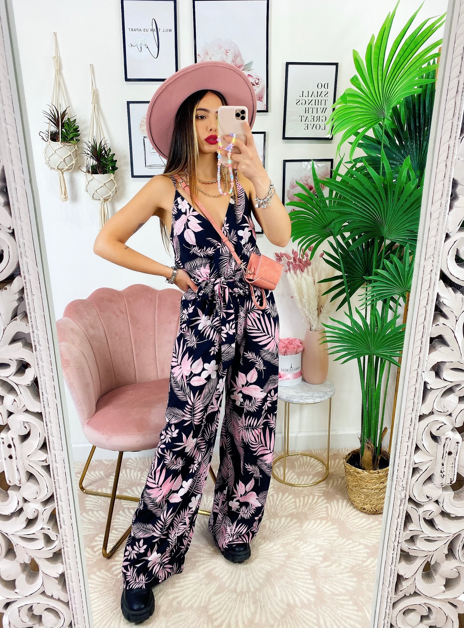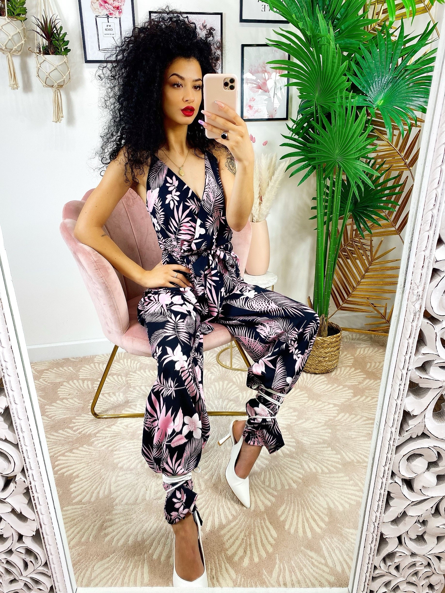 tuta floreale base nera fiorì Rosa Con spalline fisse e cintura regolabile.