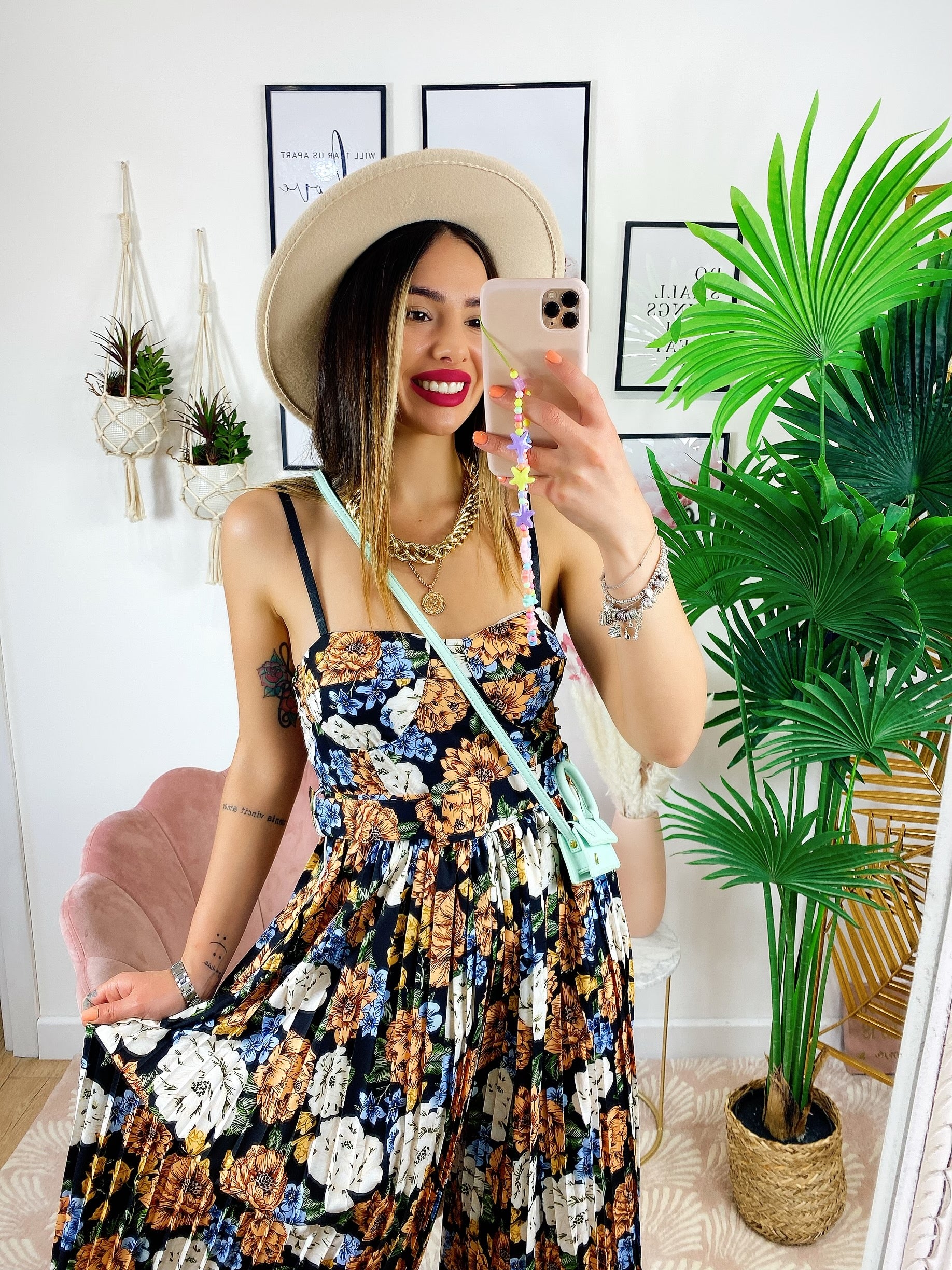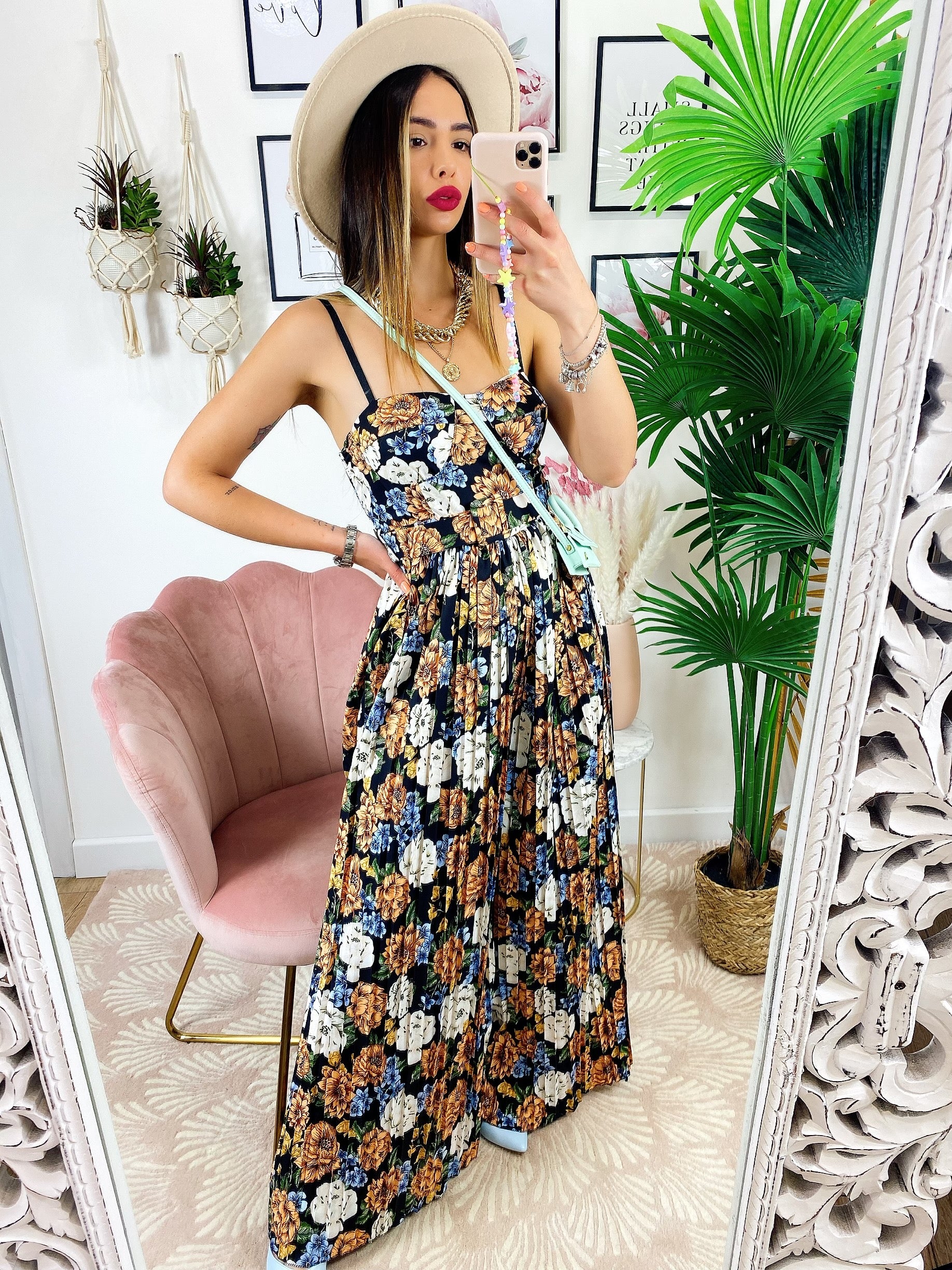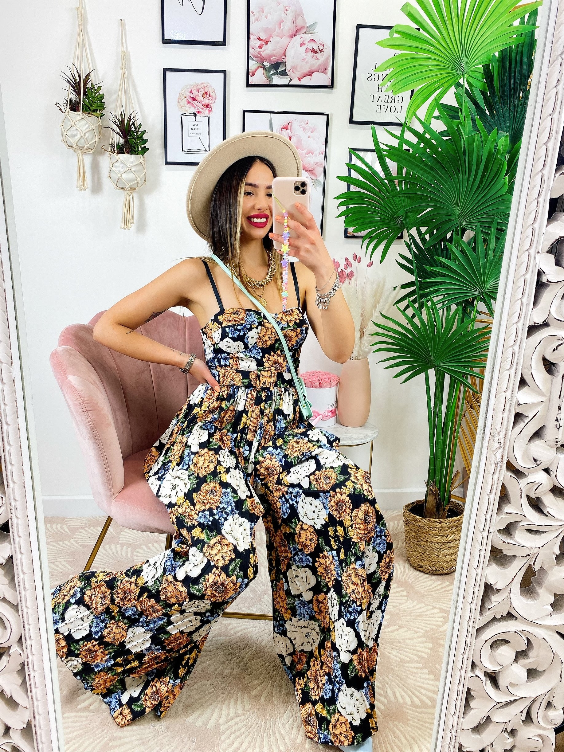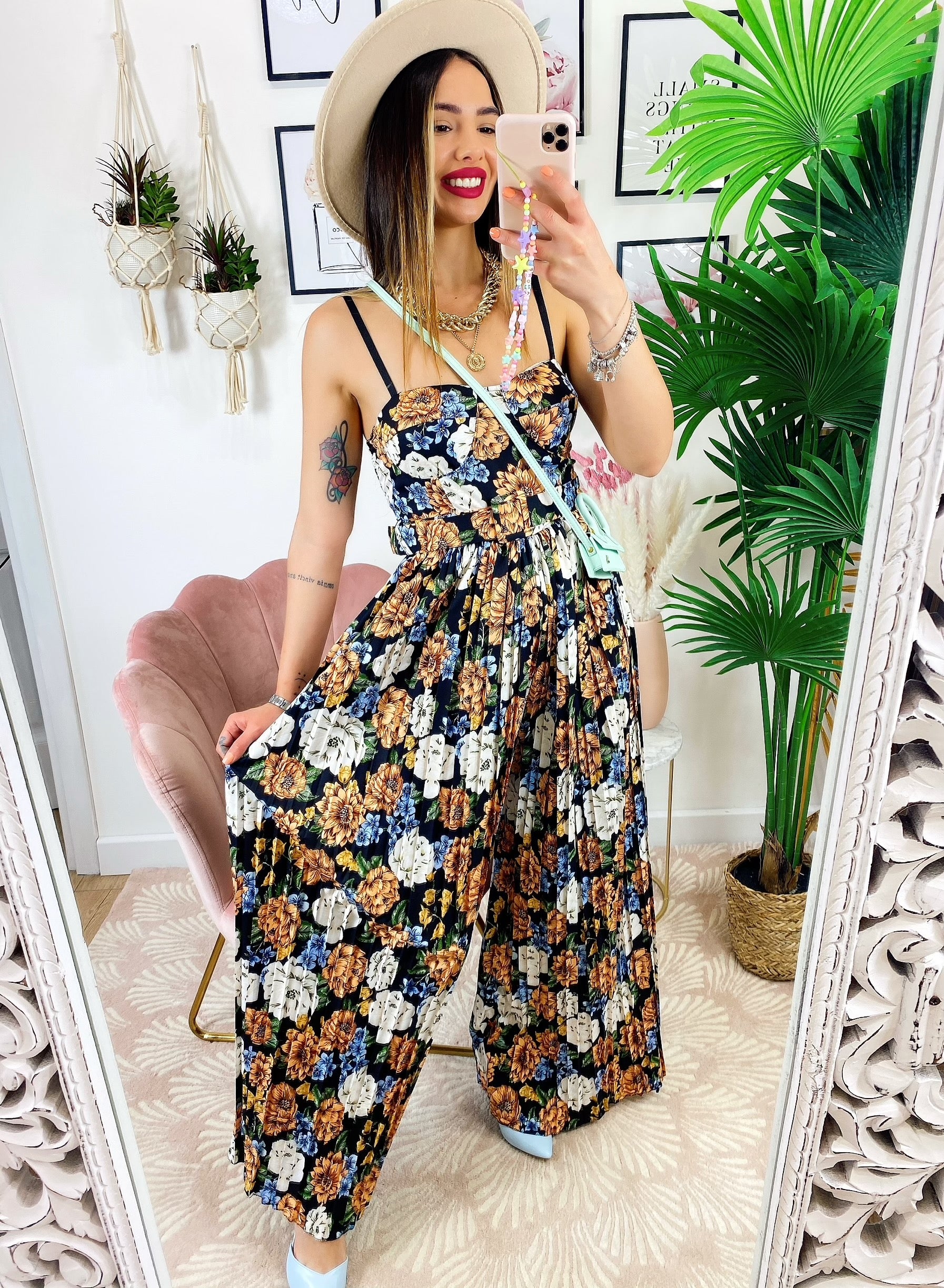 Tuta floreale con pantalone a pieghine Lunga e cintura compresa, scollo a barchetta compreso di coppe.