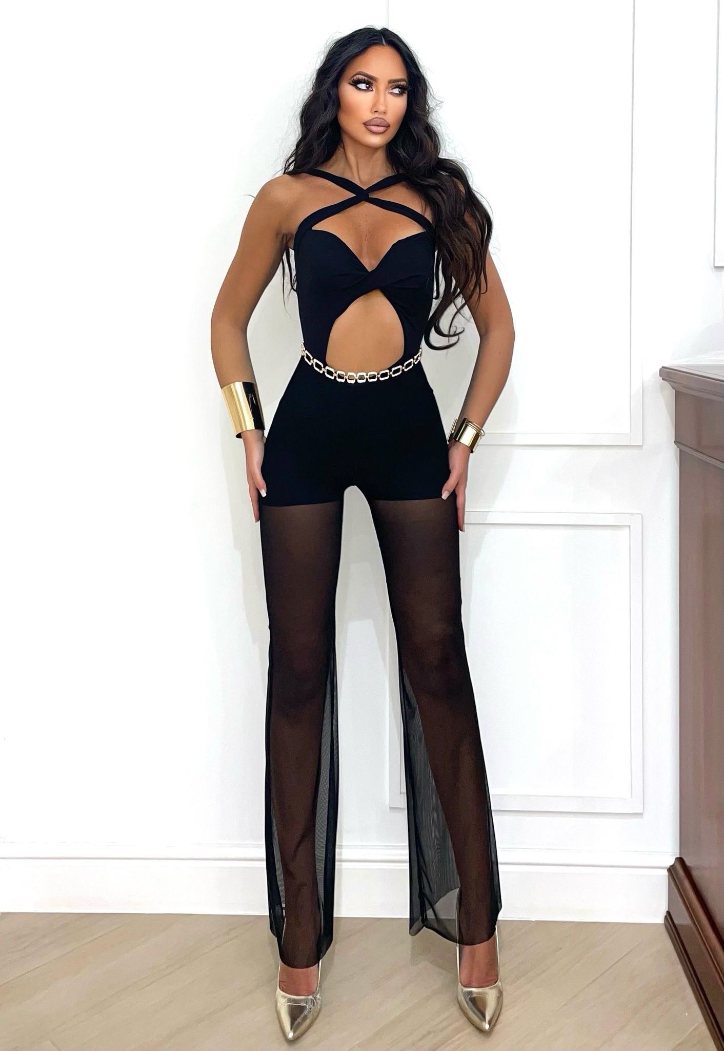 Tuta in lycra aderente e elasticizzata con incroci sul seno e coppe con pantalone e trasparenze