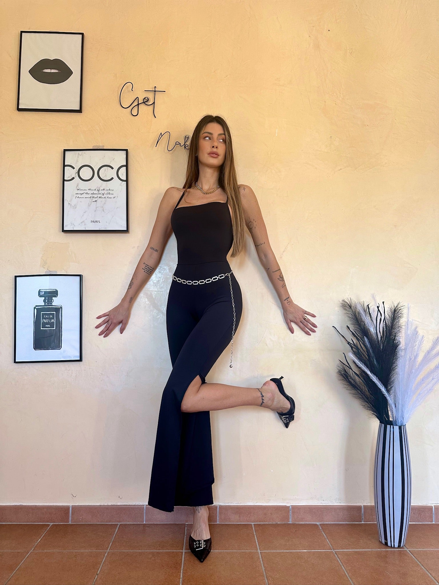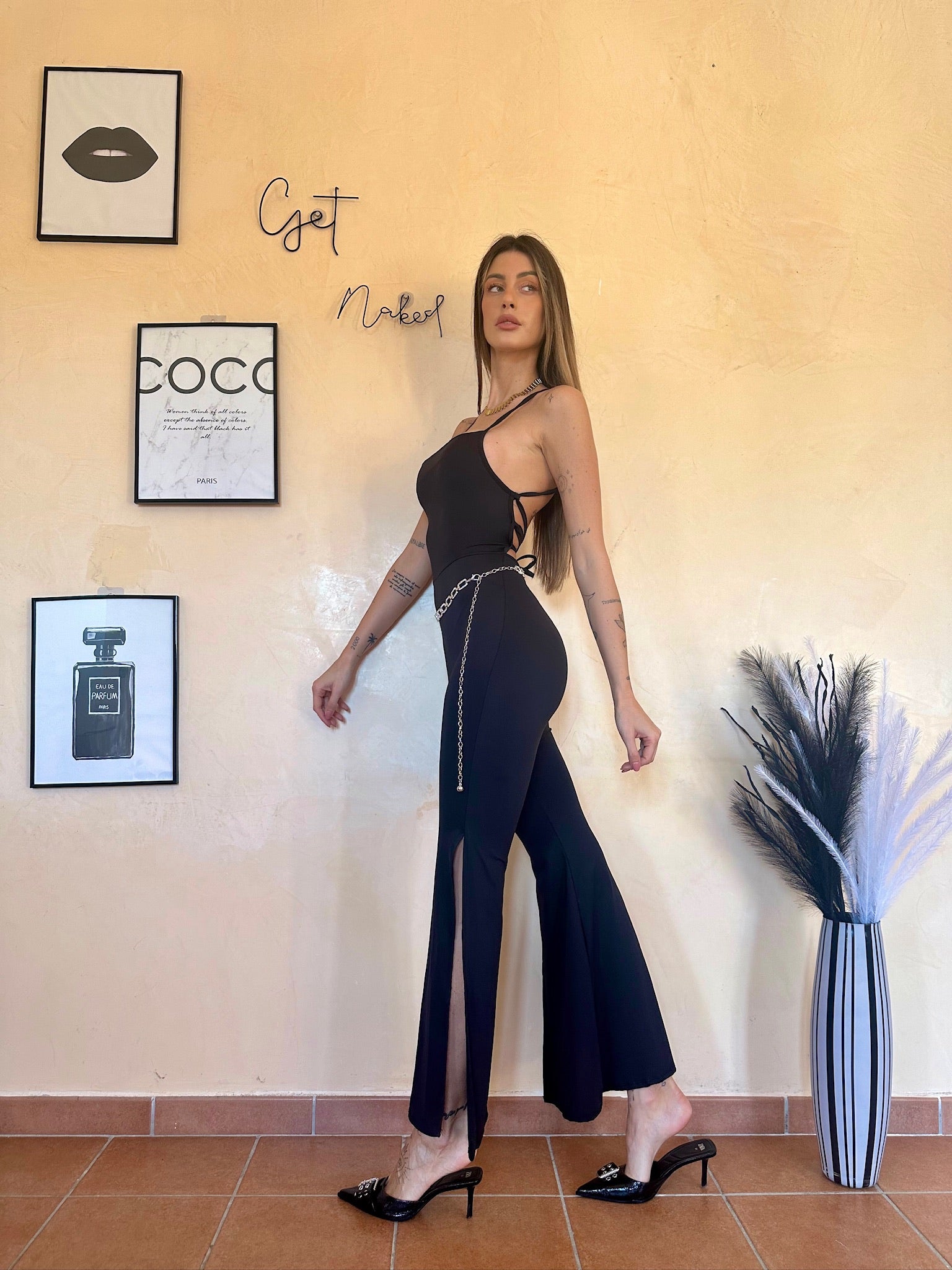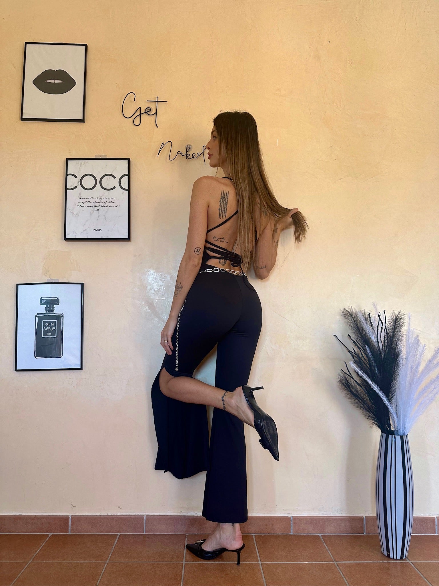 Tuta in lycra senza coppe con schiena incrociata con spacchi sui pantaloni