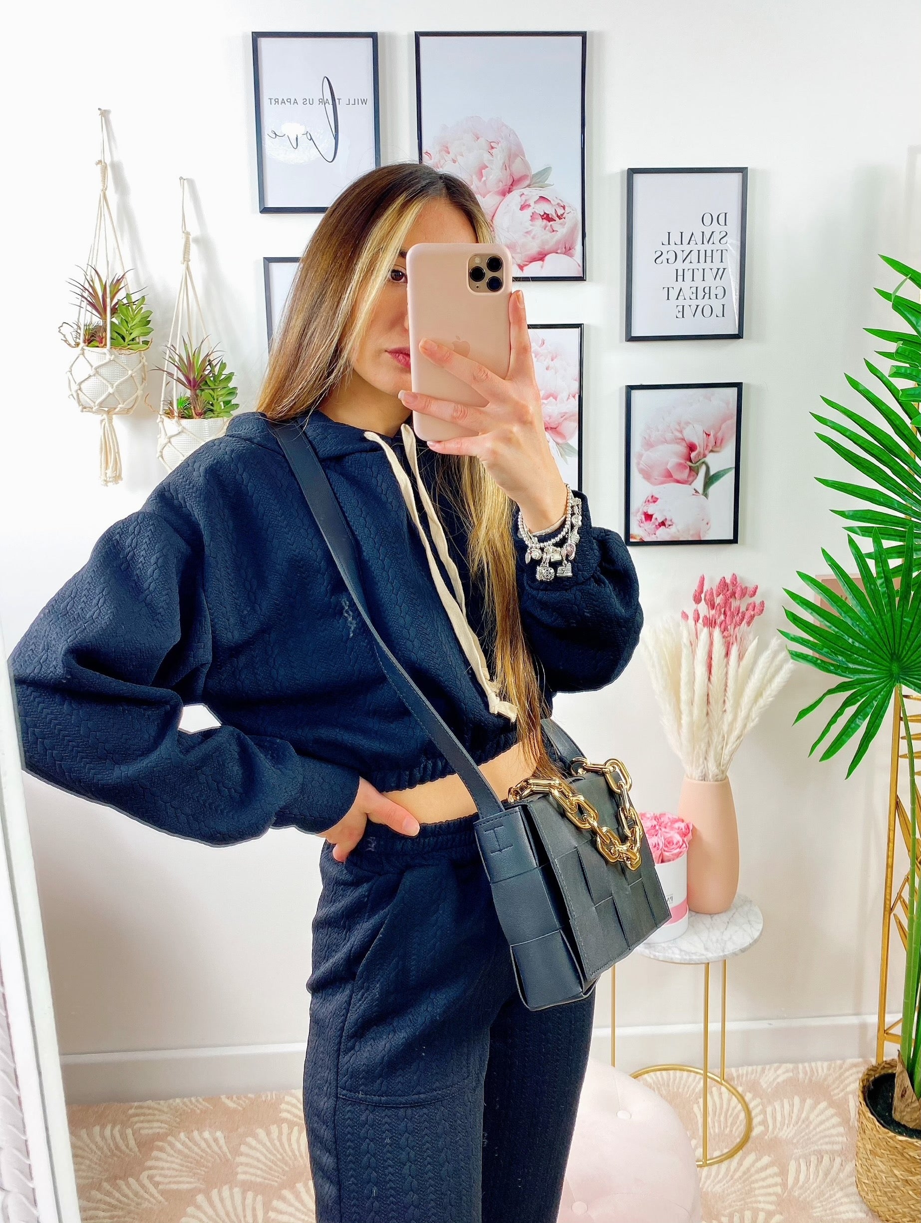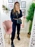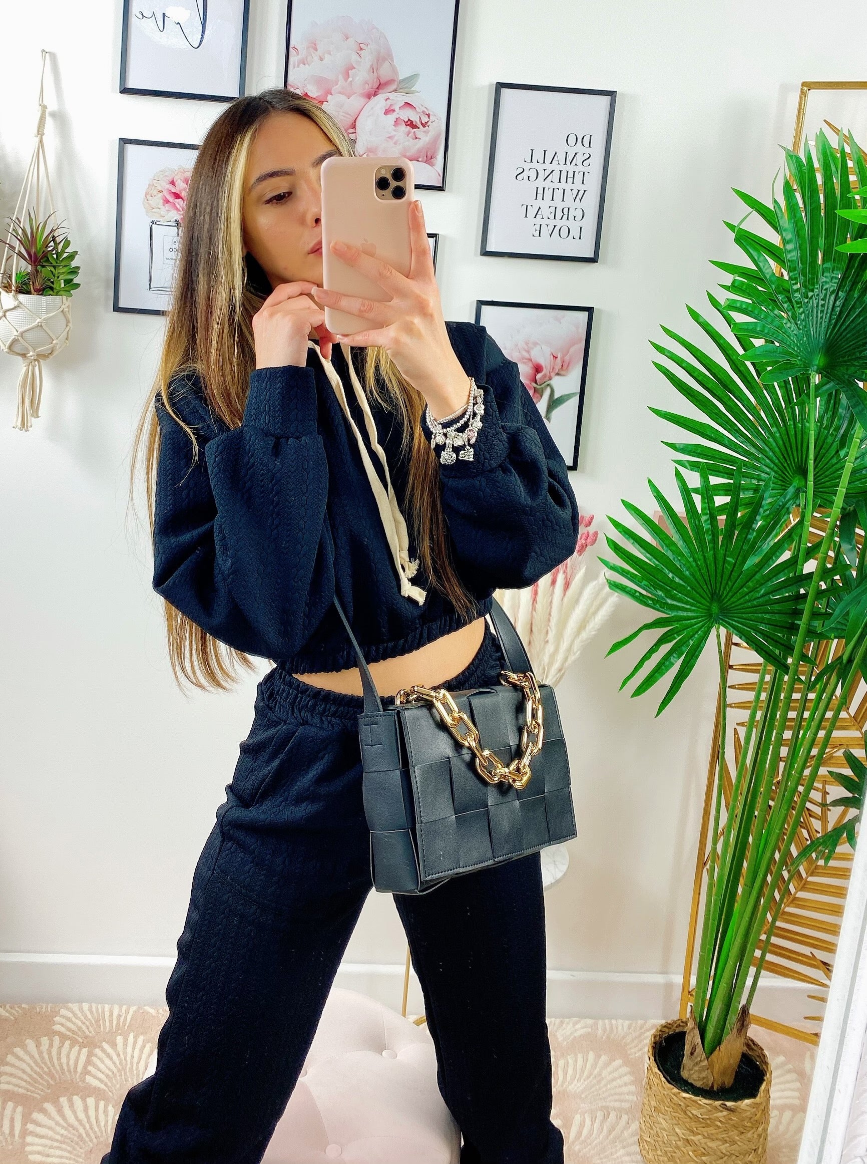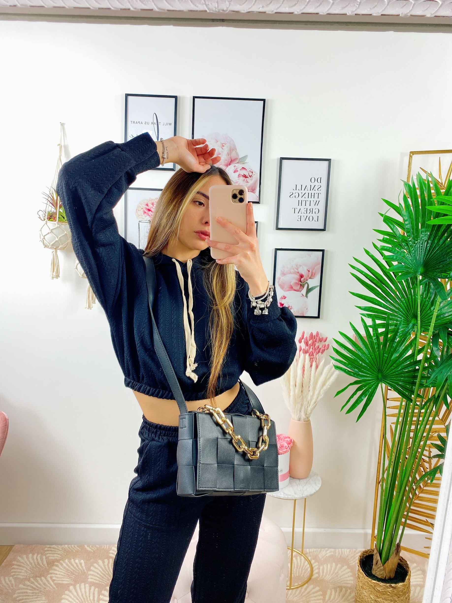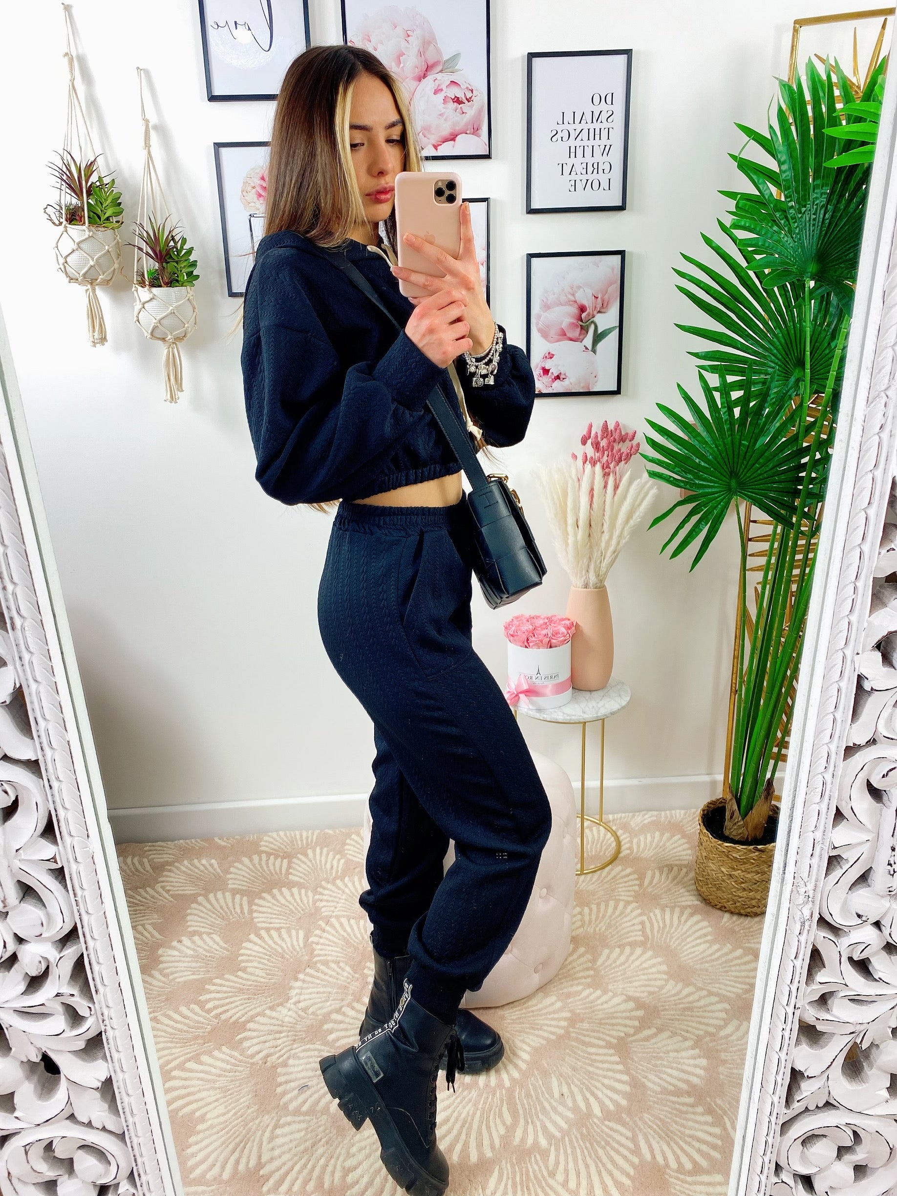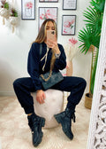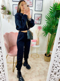 Tuta Sportiva Ricamata Black. Sia maglia che pantalone sono elasticizzati e molto comodi, pantalone con polsino e felpa arricciata sotto con cappuccio.