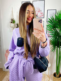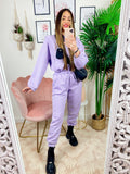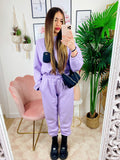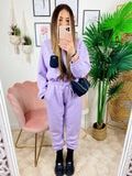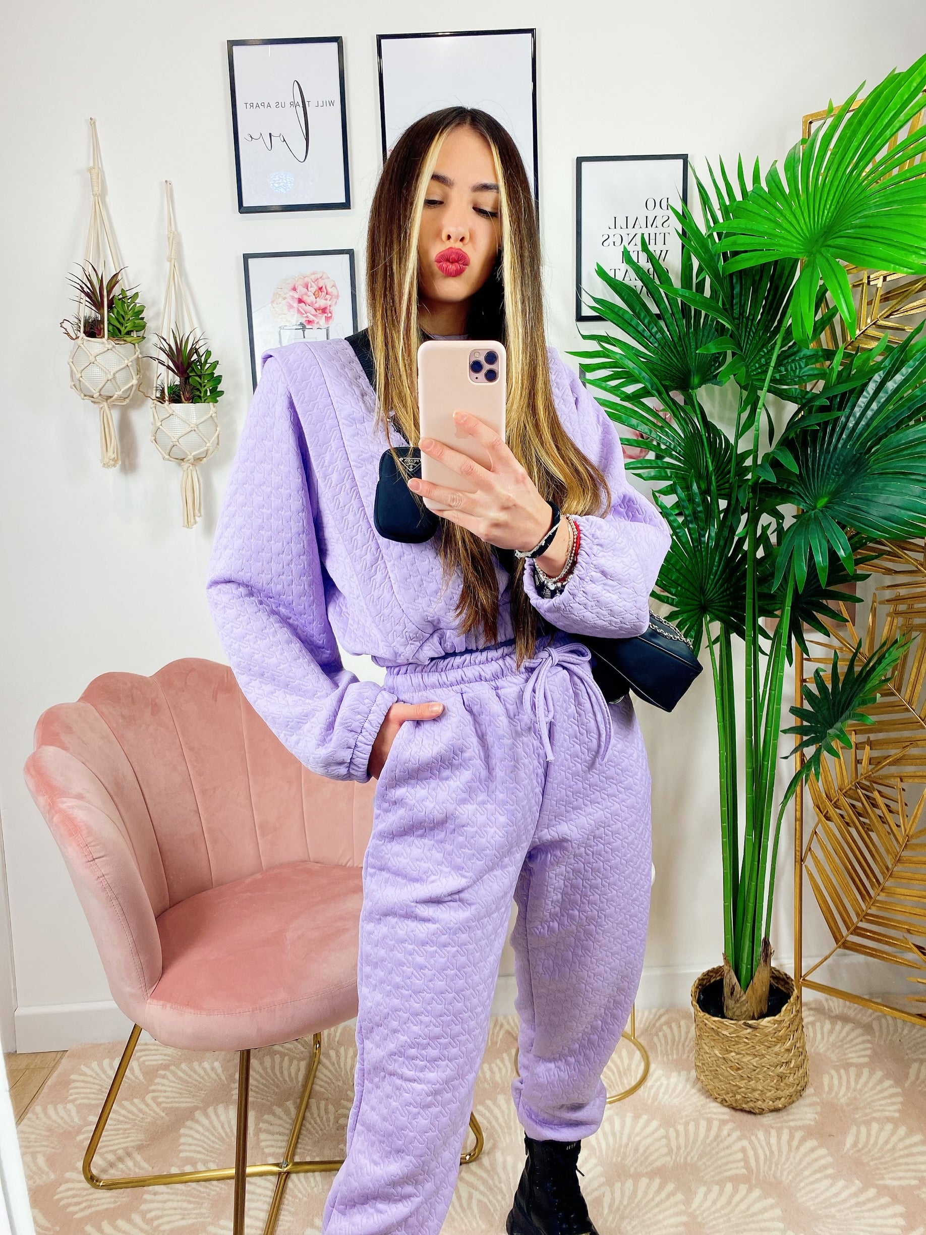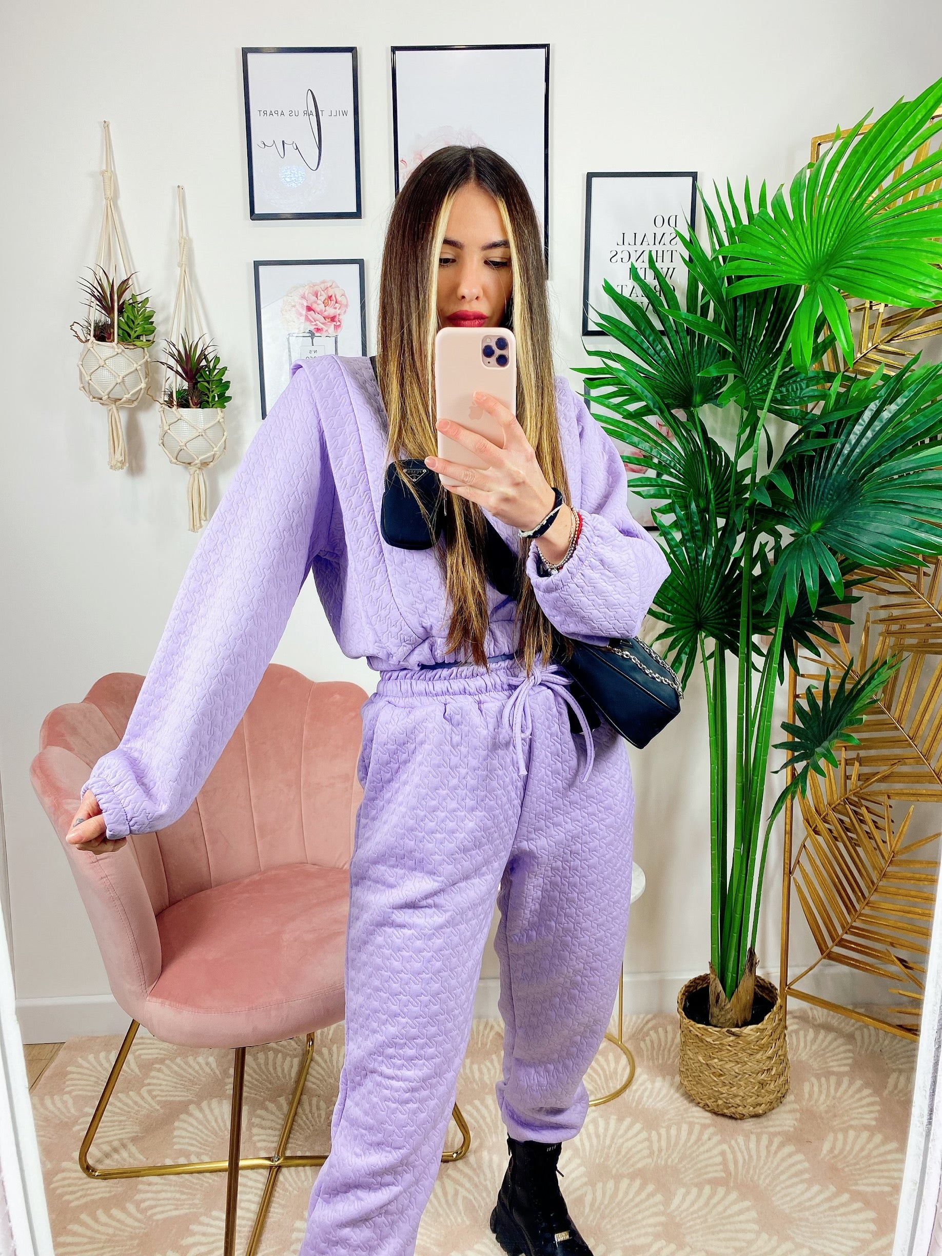 Tuta Sportiva Ricamata Lilla . Sia maglia che pantalone sono elasticizzati e molto comodi, pantalone con polsino e felpa con volant.