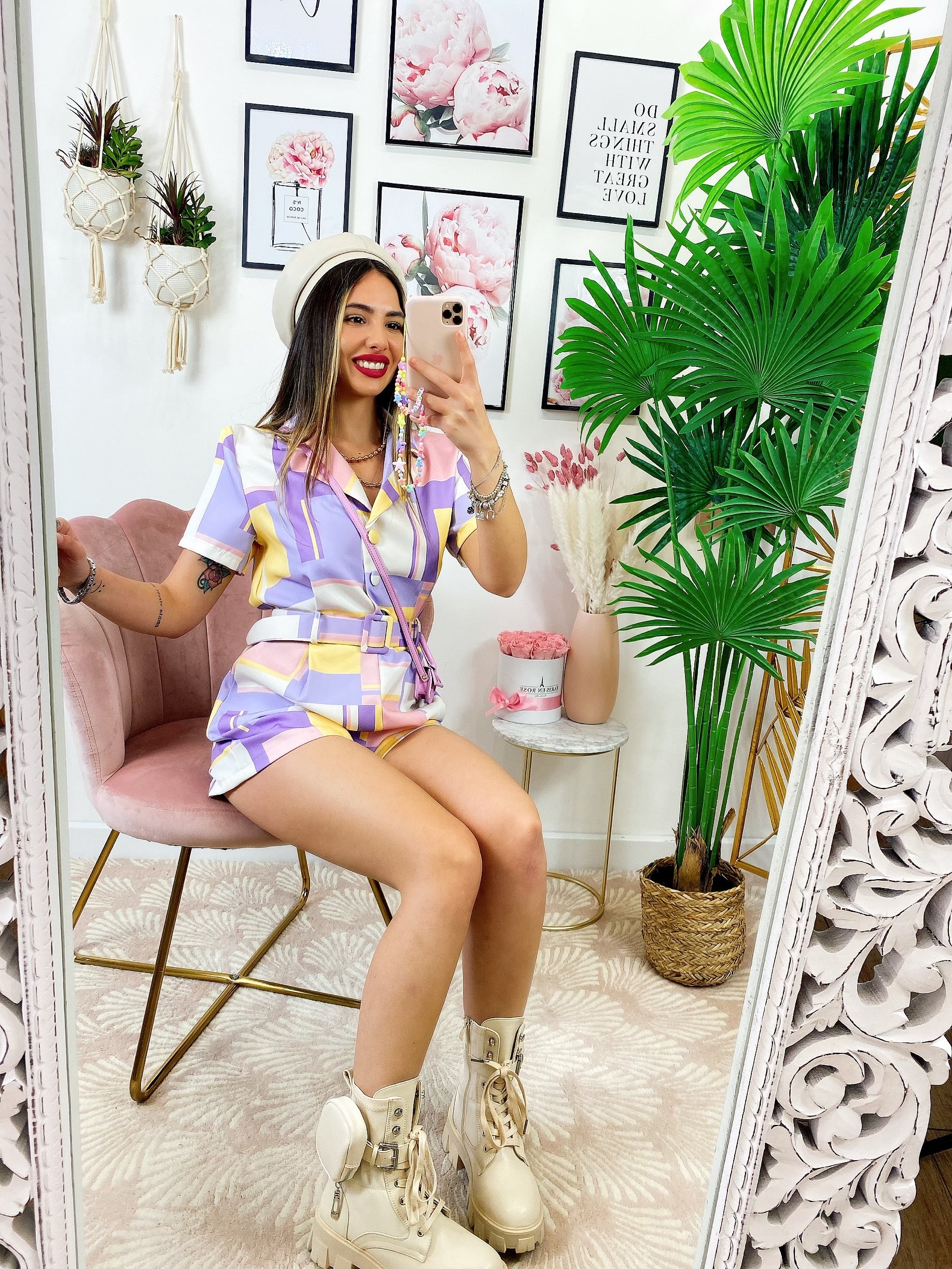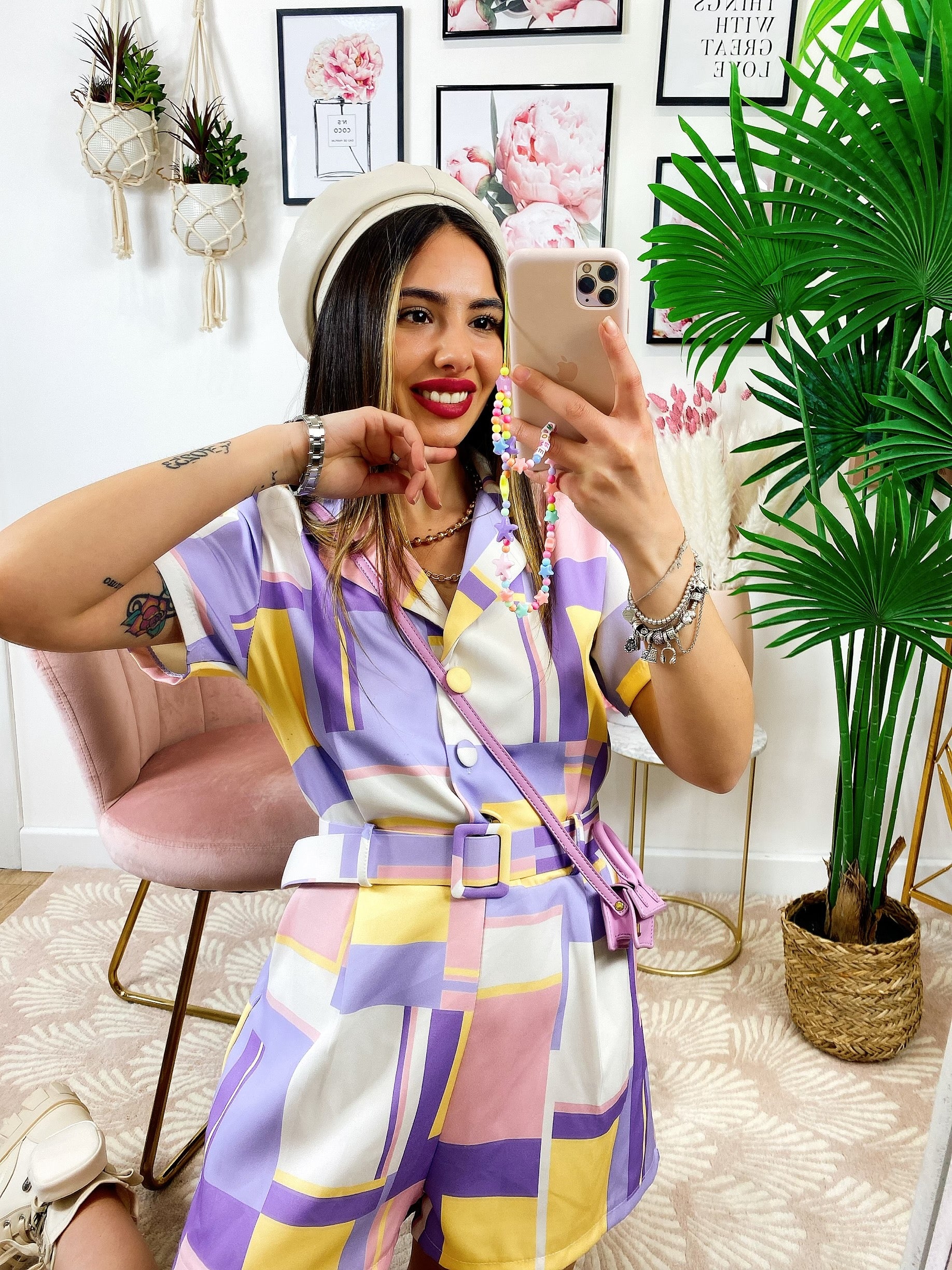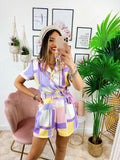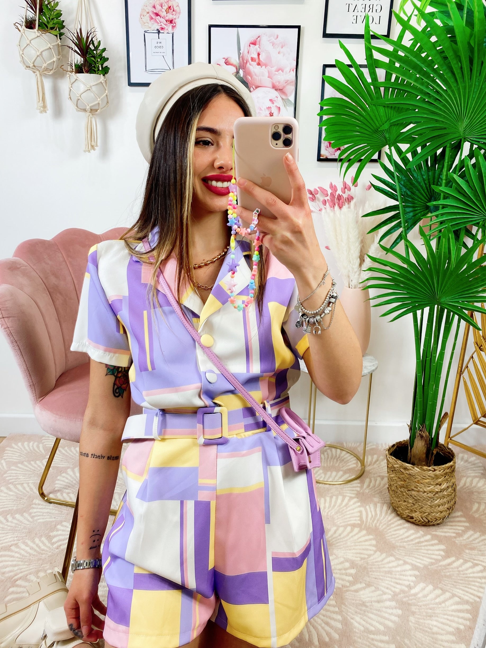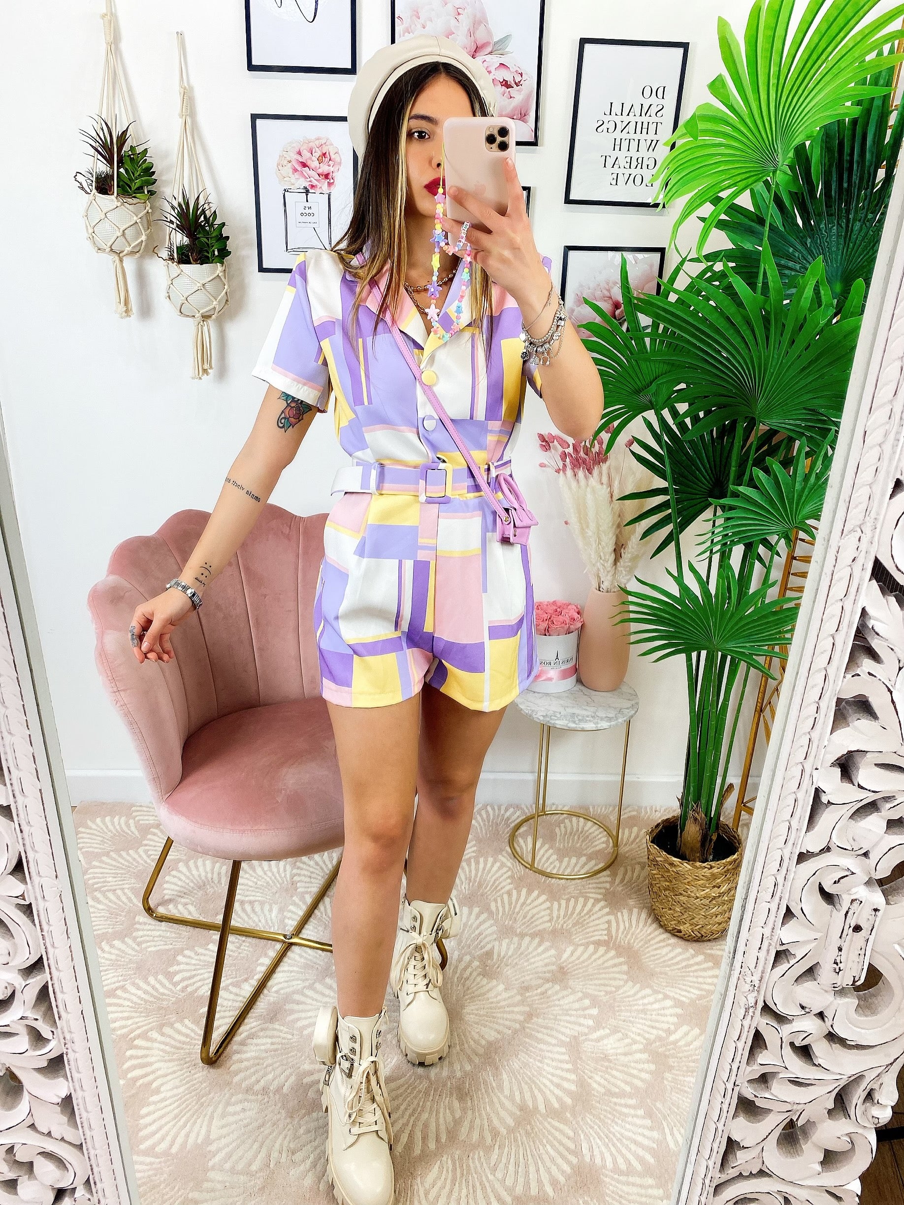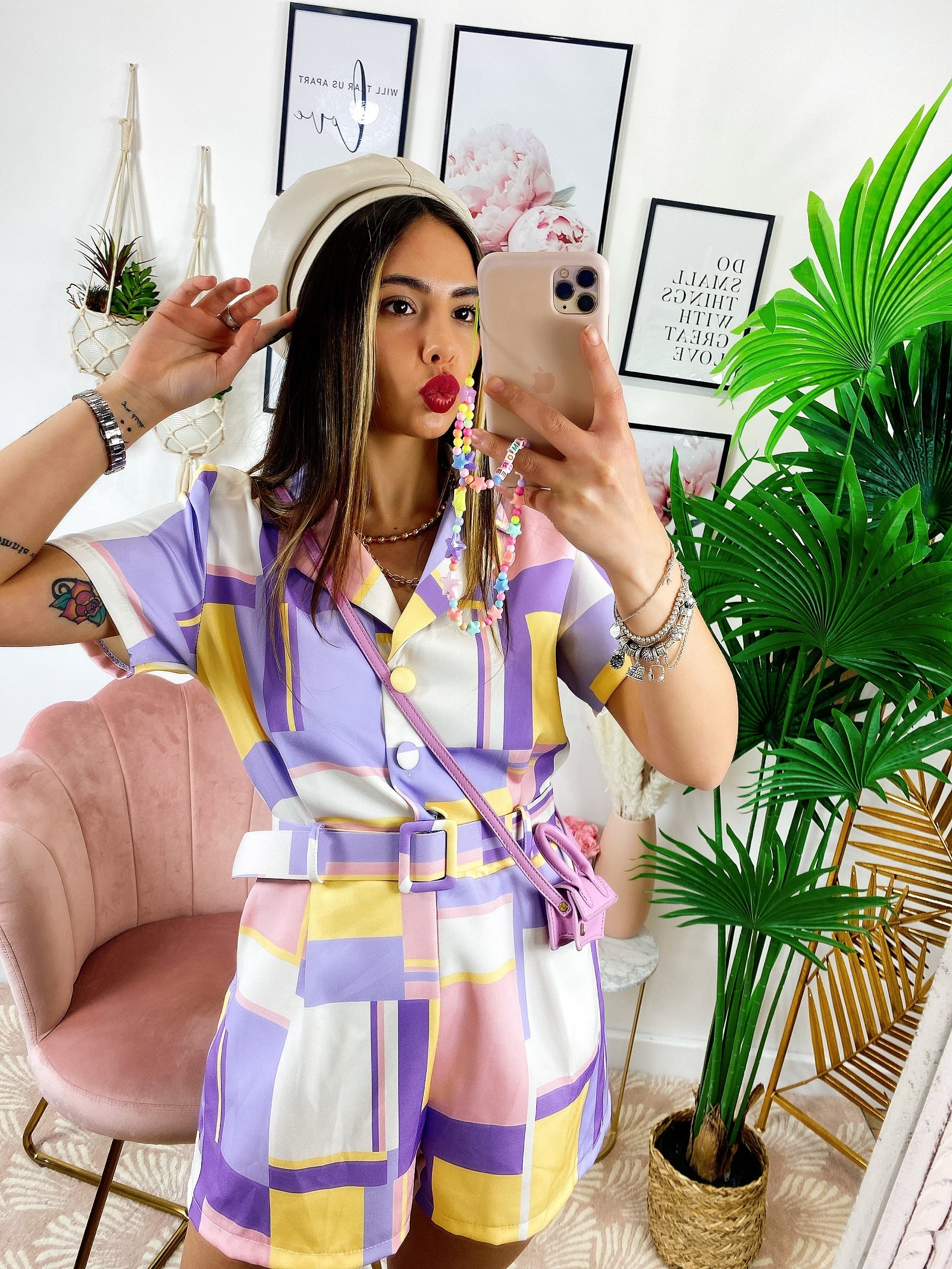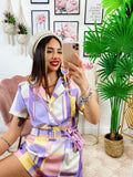 Tutina a quadri con bottoni E cinta base lilla.