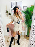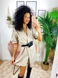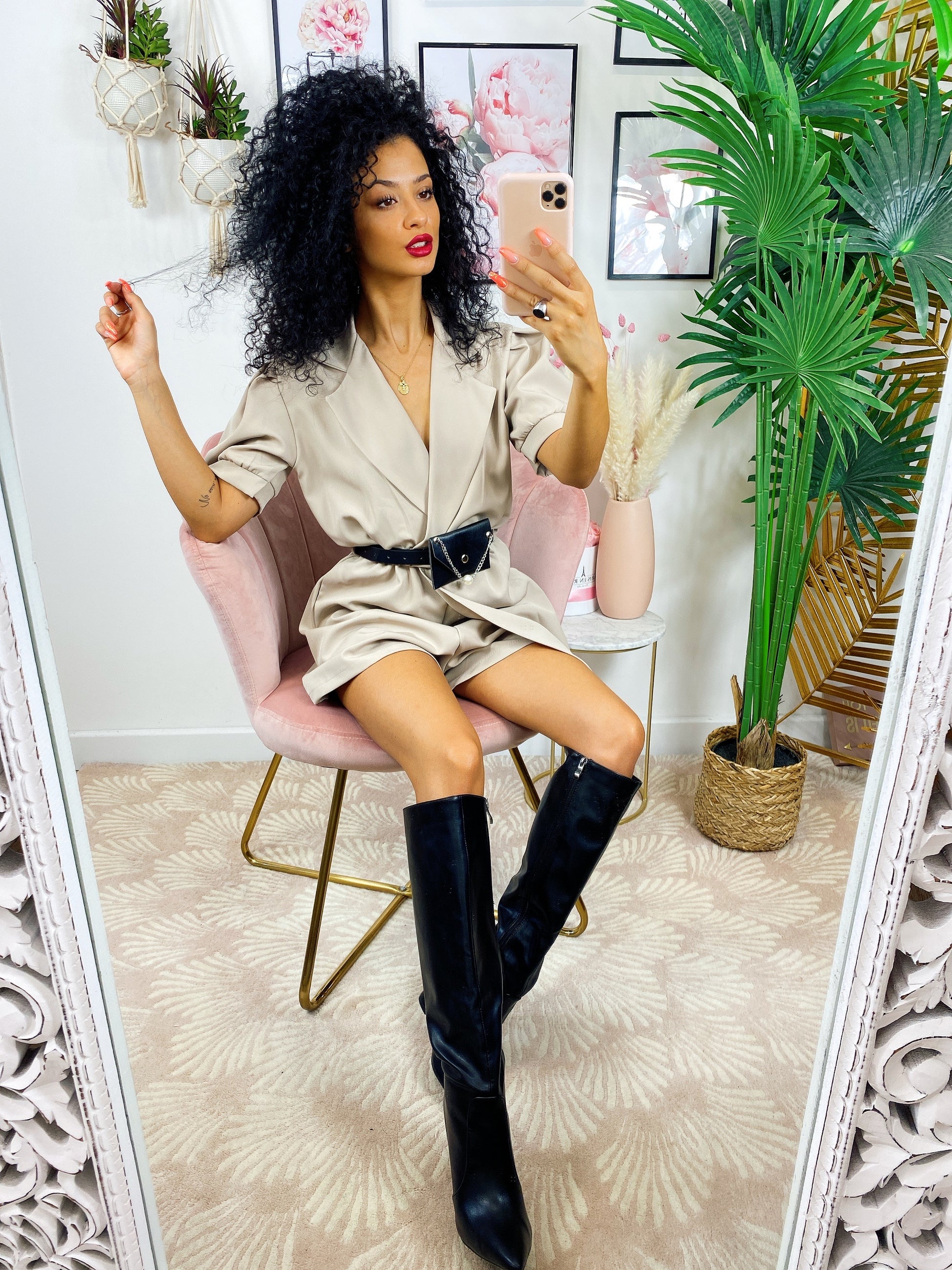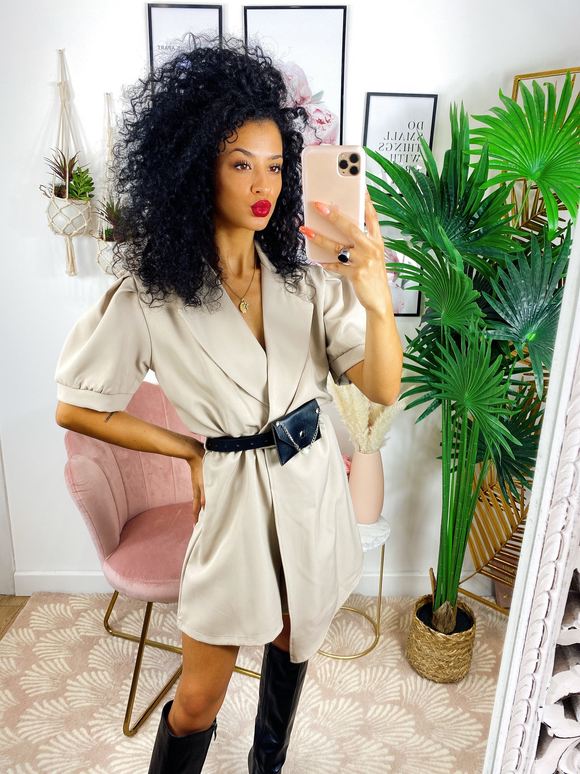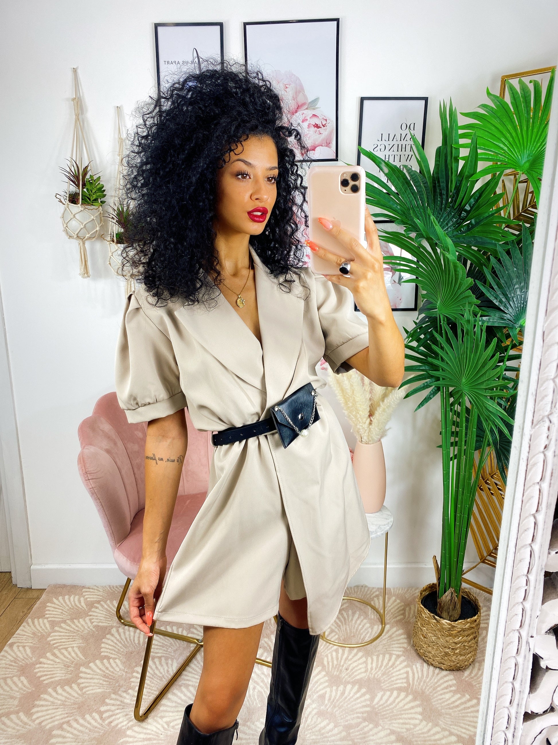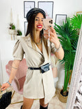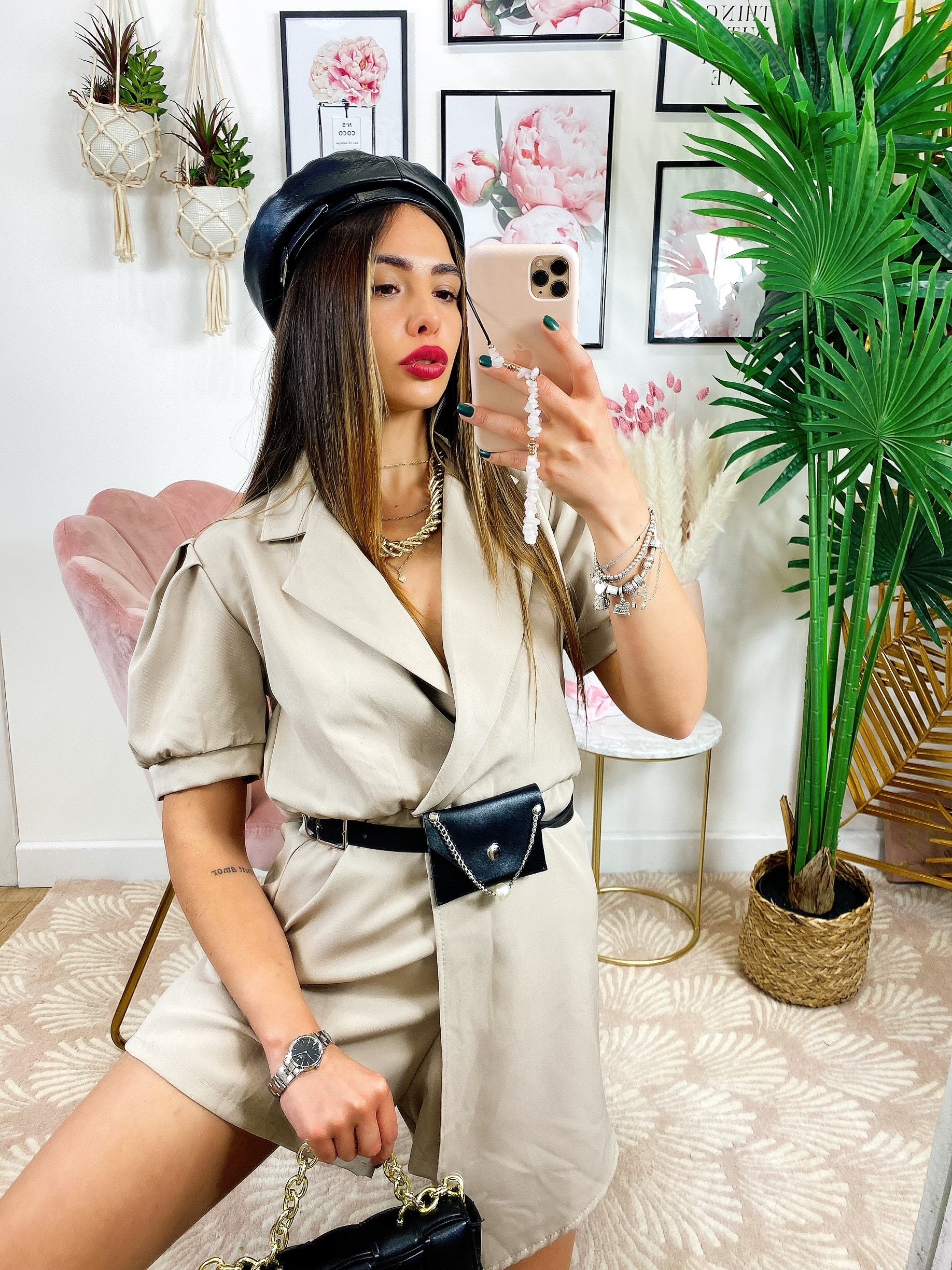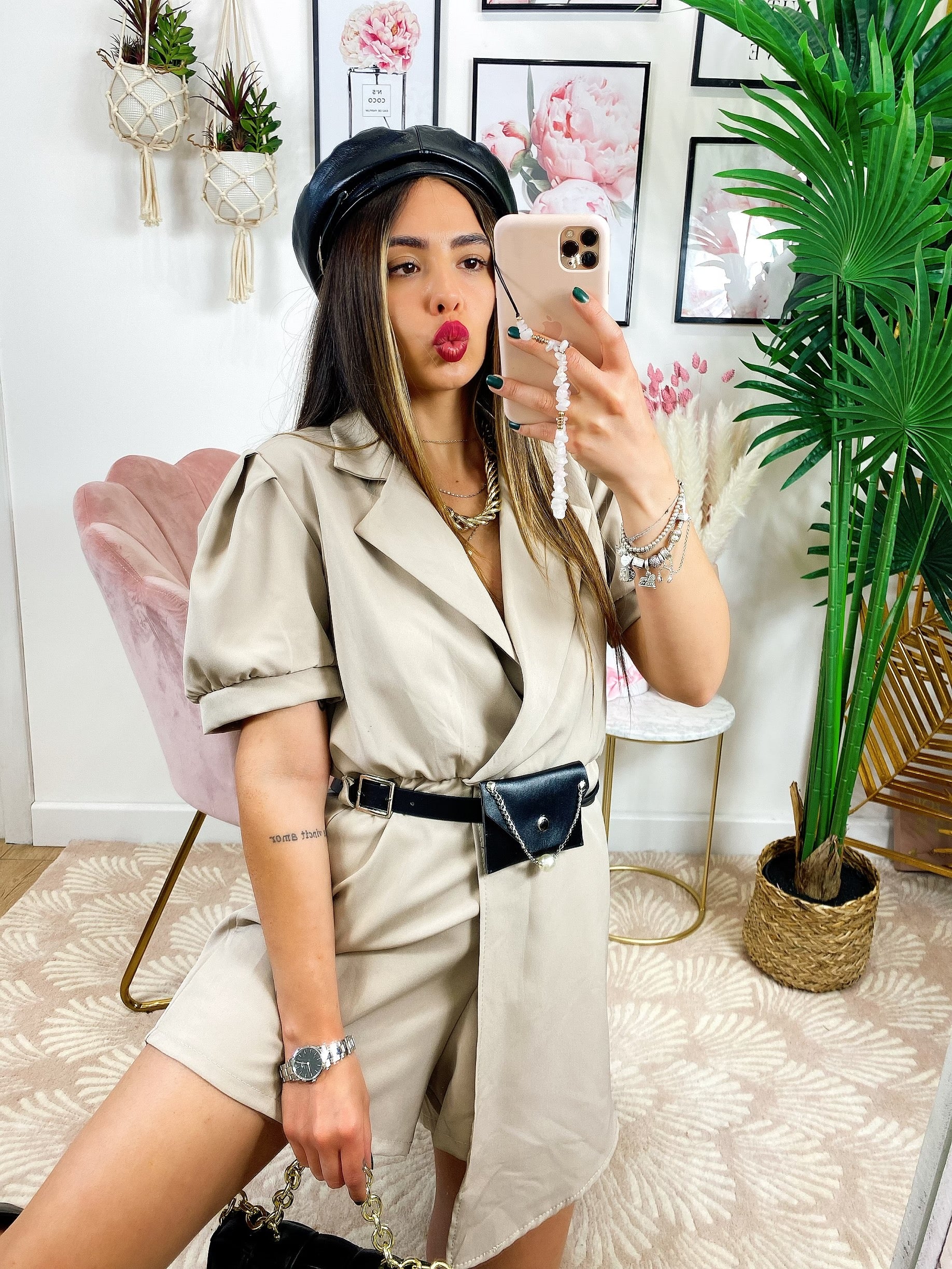 Tutina beige manica corta con borsetta compresa e dettaglio perla.