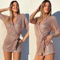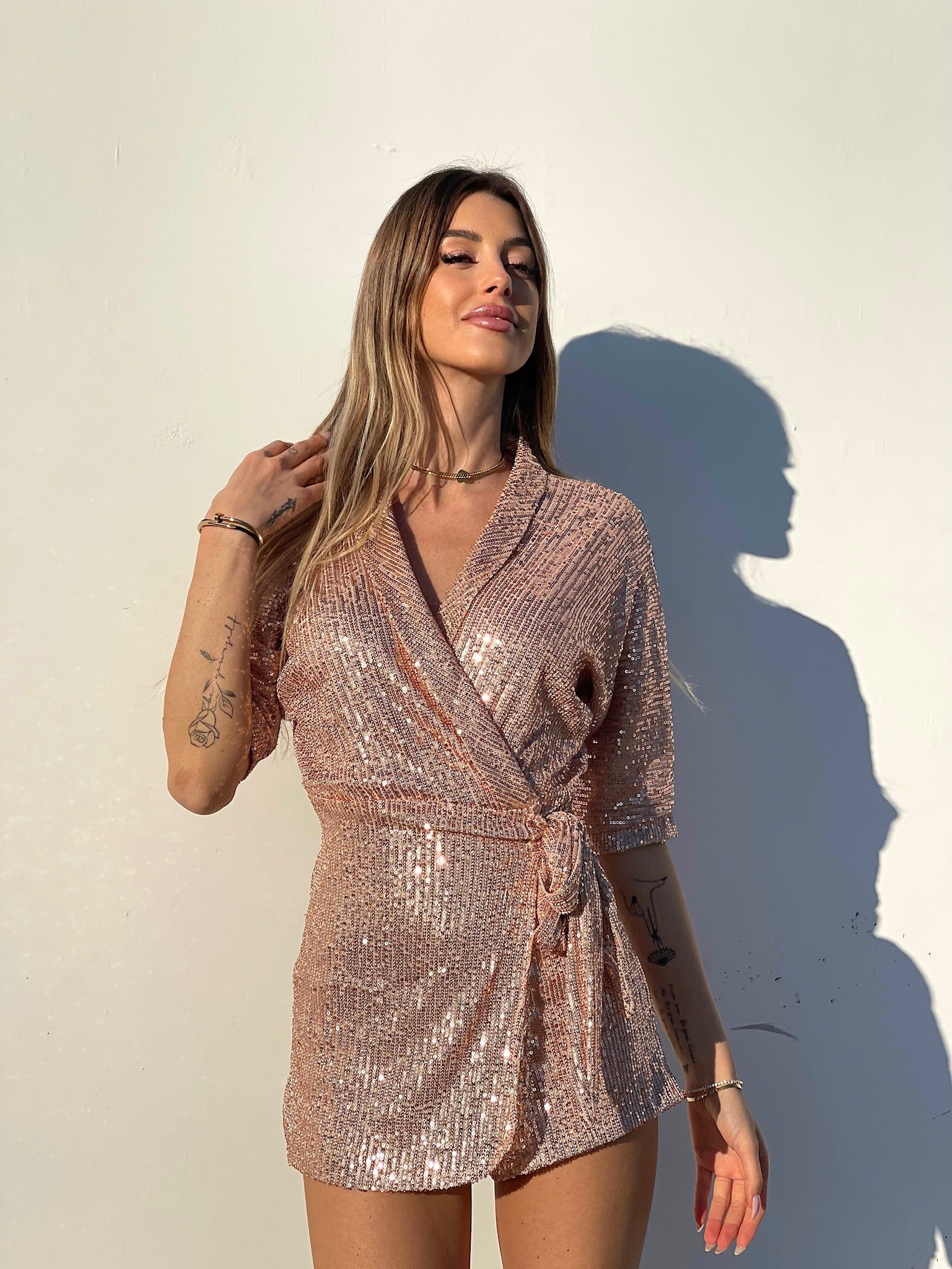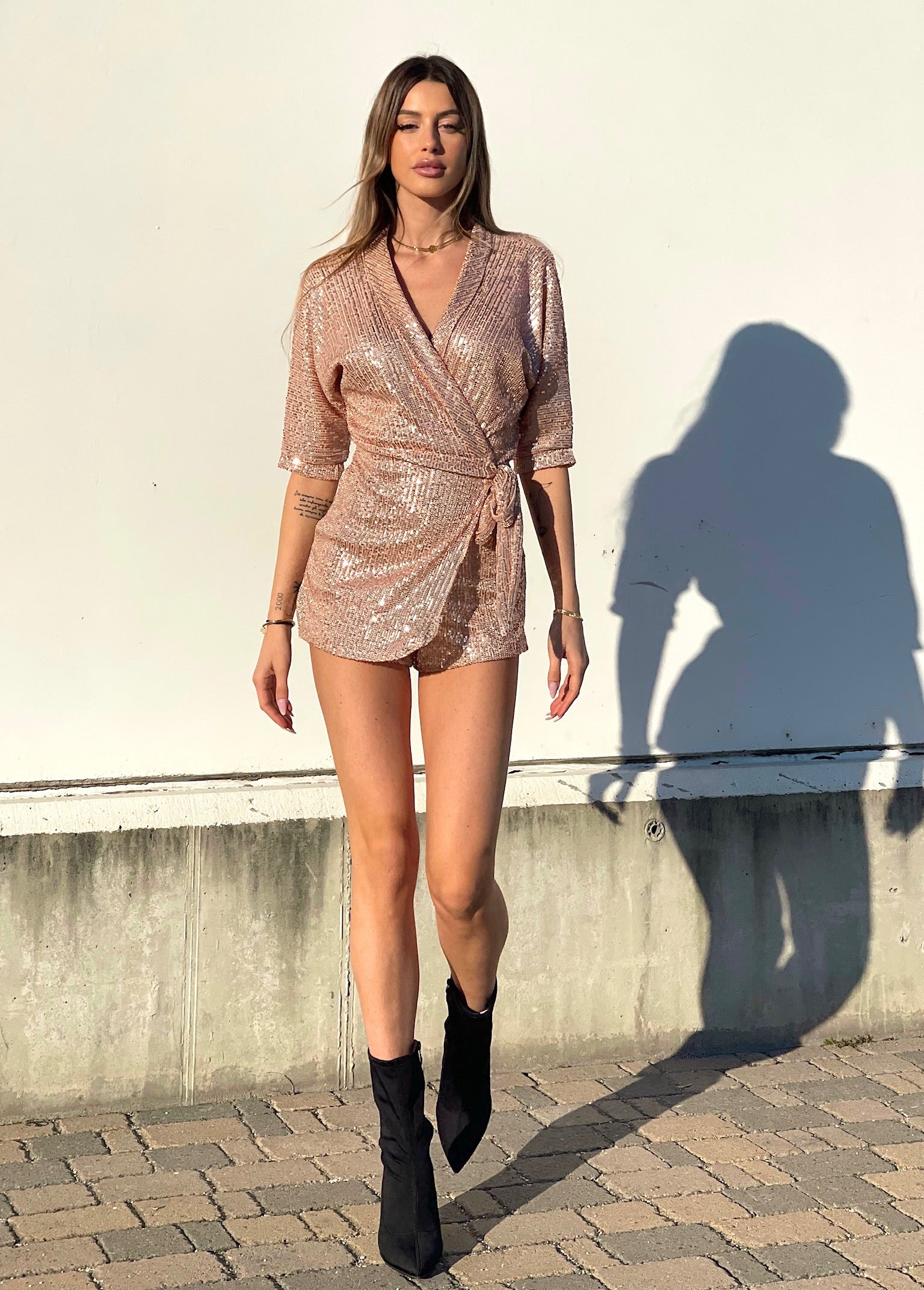 Tutina super elegante piena di paillettes con chiusura a portafoglio. Pantaloncino comodo e pratico