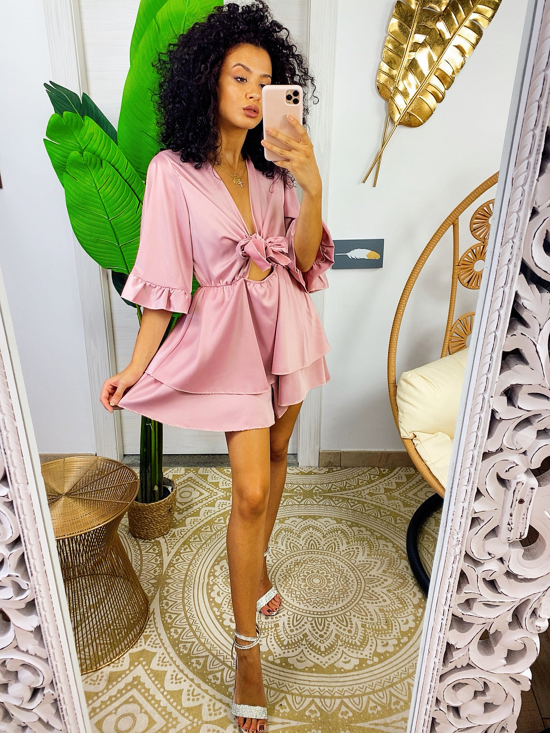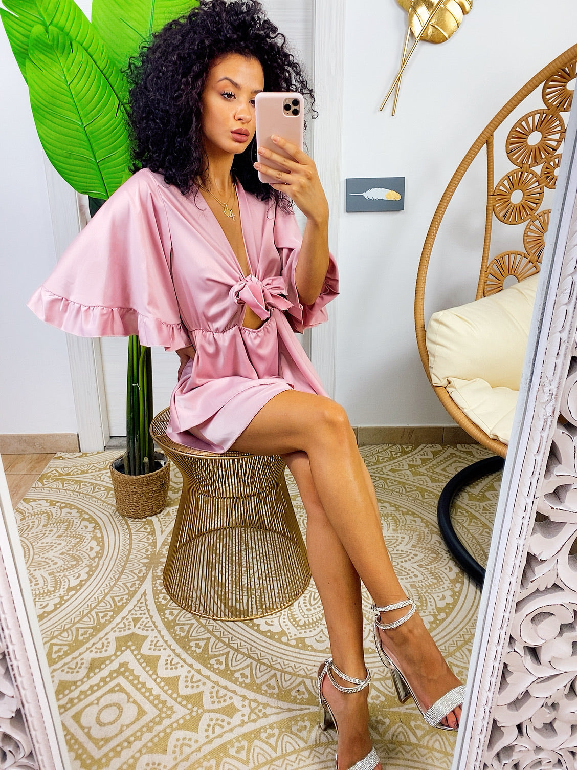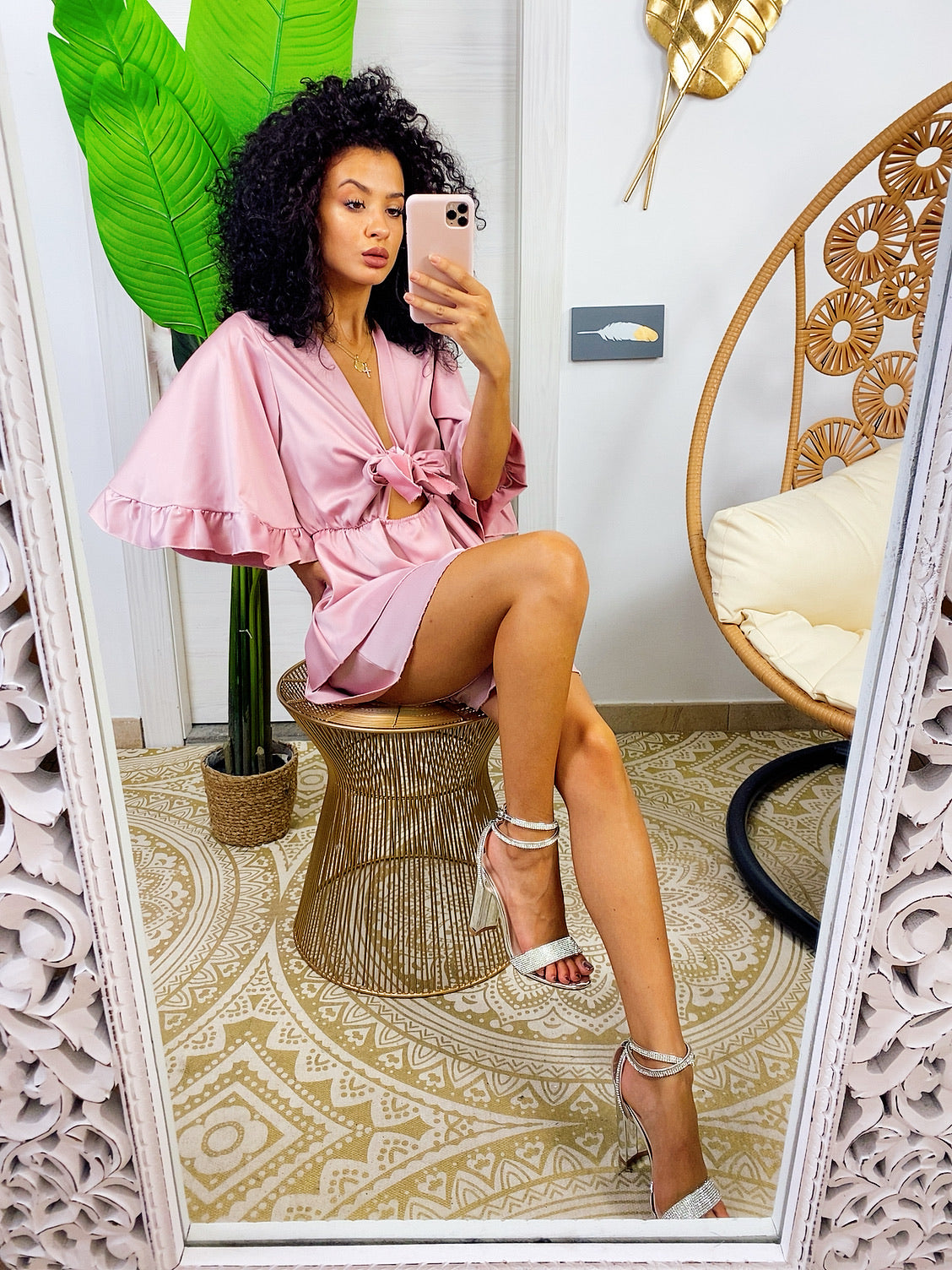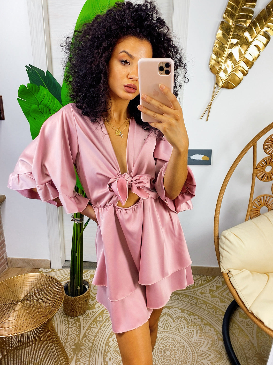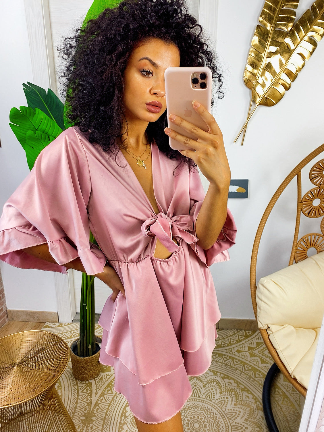 tutina in morbido raso con manica lunga ampia. Chiusura con fiocco davanti: Abbinalo con un paio di stivali alti o un tacco aperto.