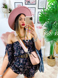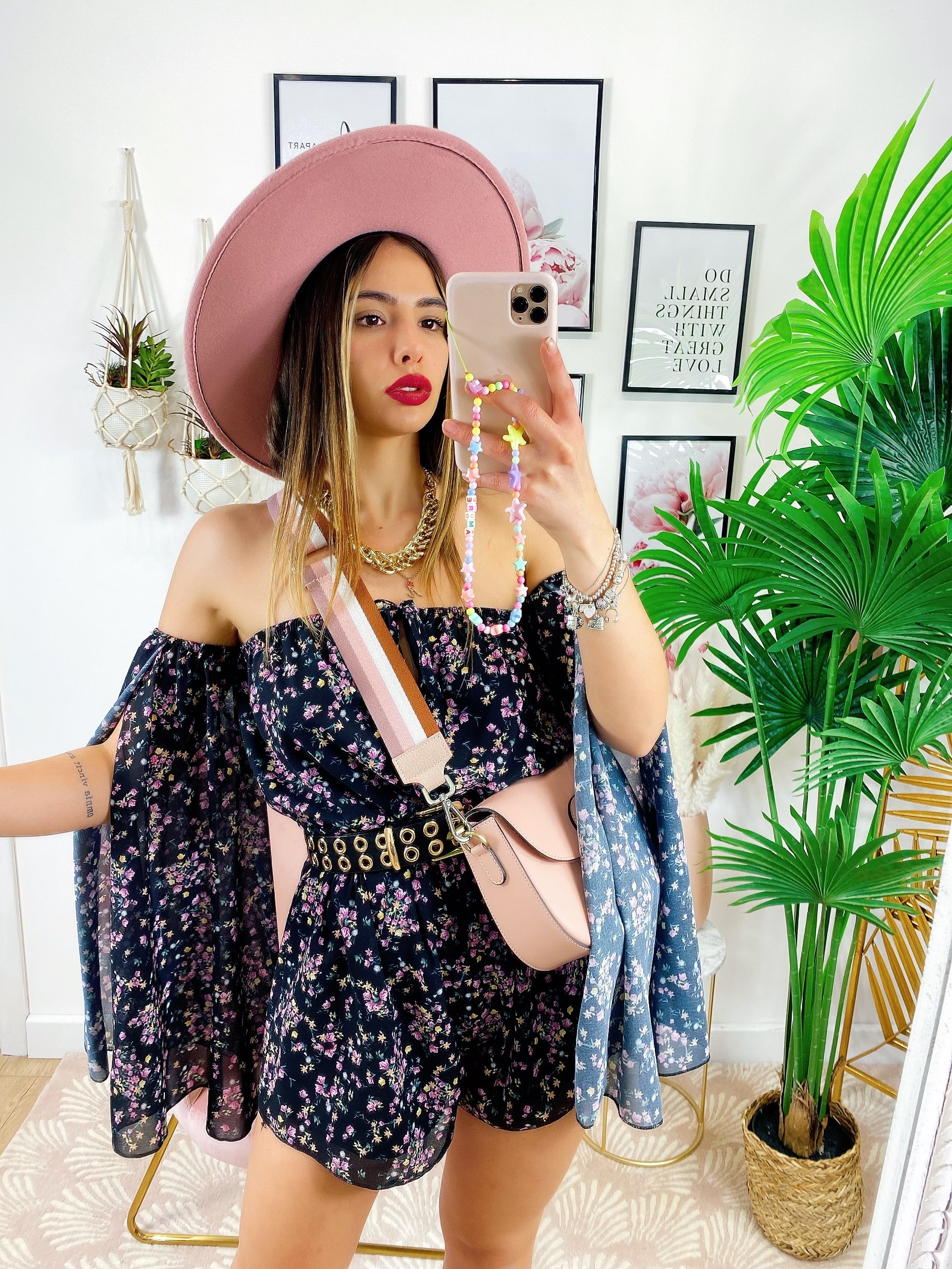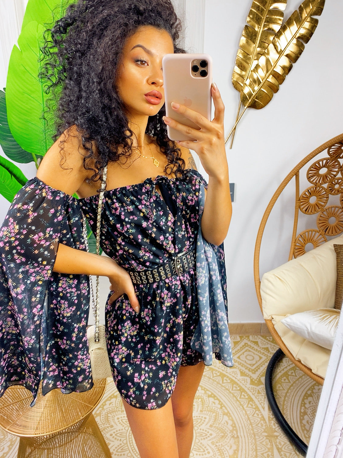 Tutina manica velata con fiori rosia. Scollo a barchetta con arricciatura e fiocchetti e elastico in vita. Fresca e comoda