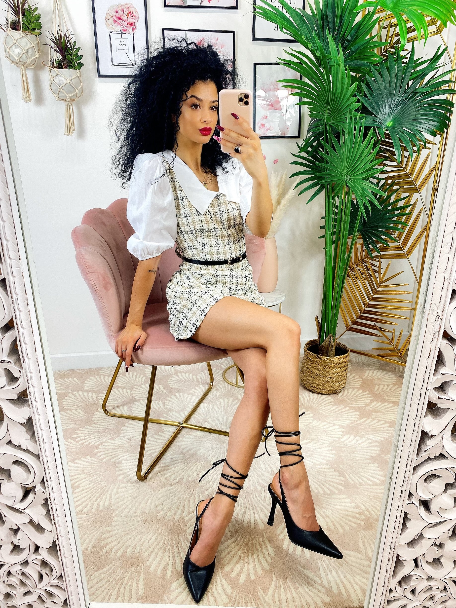 Tutina Queen trama pied de poule con manica bombata e polsino chiuso fatta a camicetta con cinturina compresa, zip posteriore per chiuderla.
