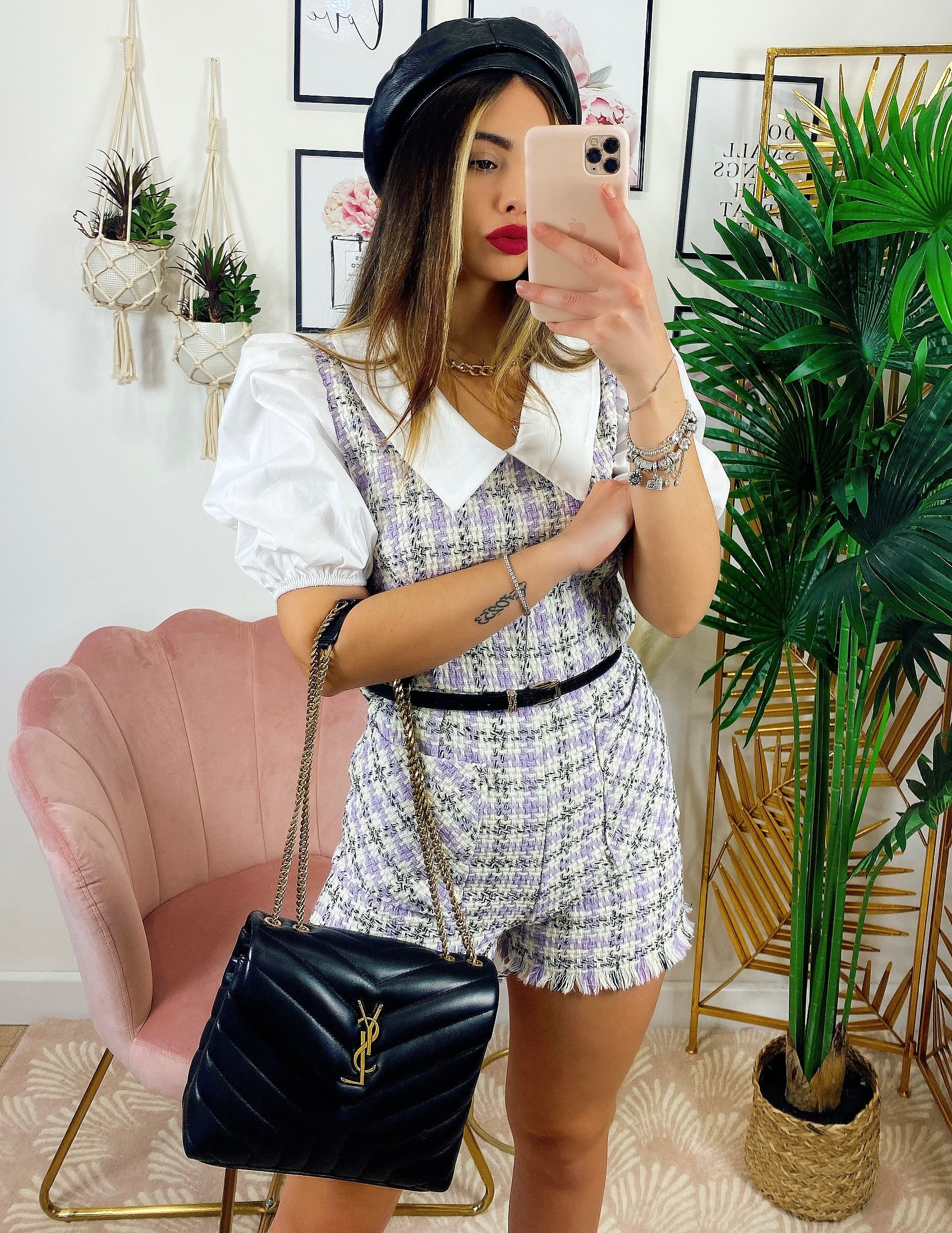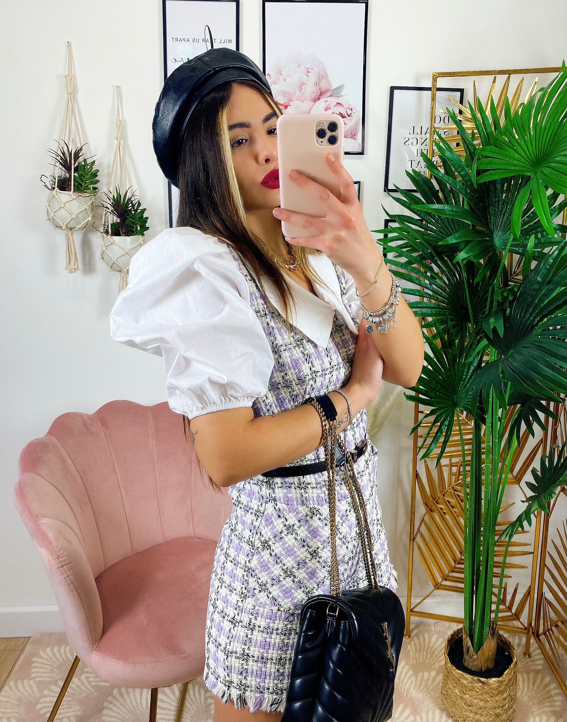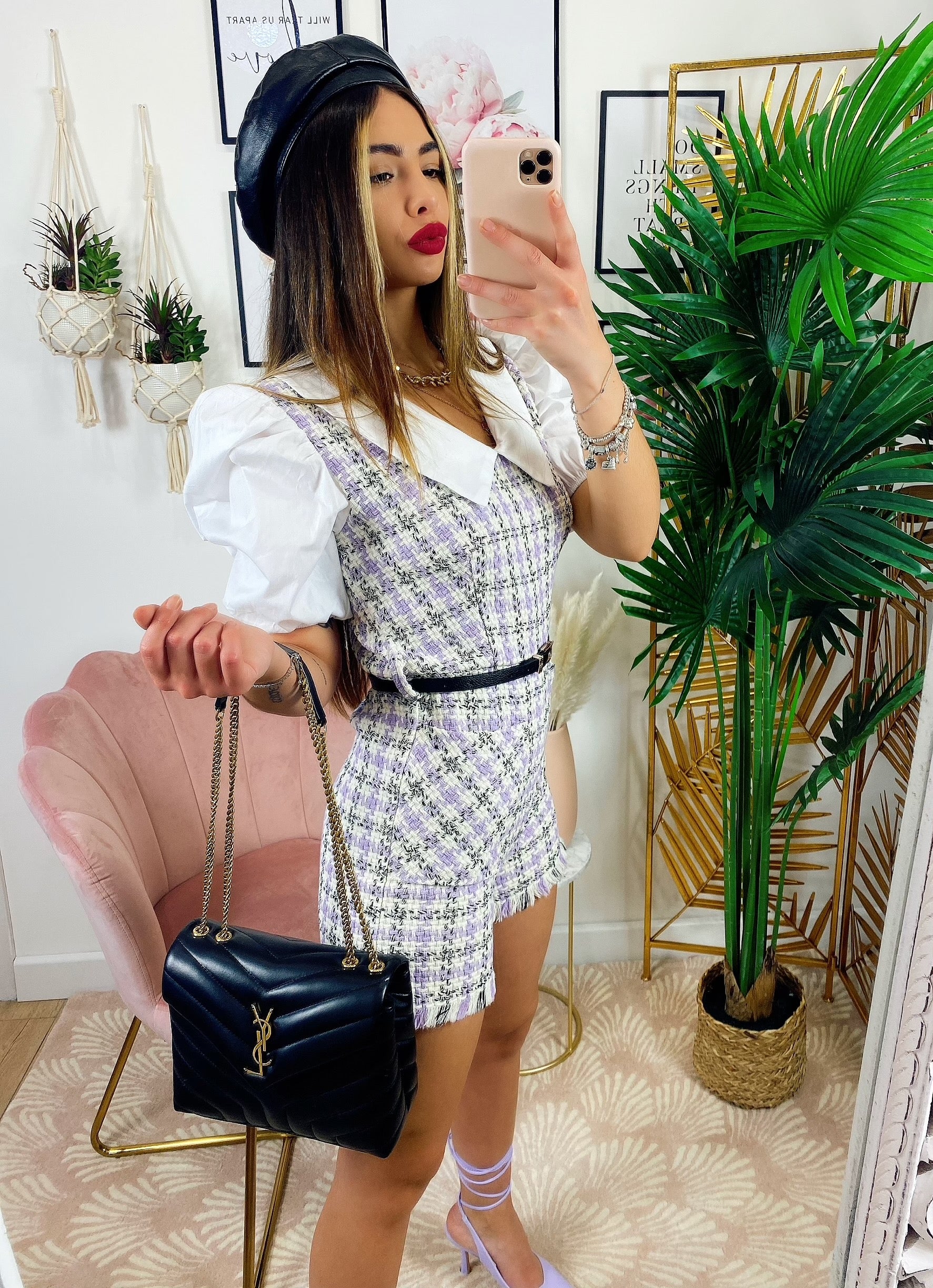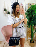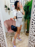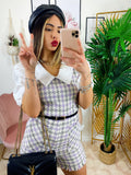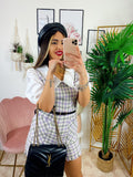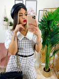 Tutina Queen trama pied de poule con manica bombata e polsino chiuso fatta a camicetta con cinturina compresa, zip posteriore per chiuderla.