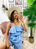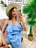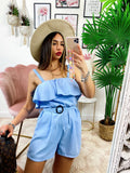 Tutina scollo a barchetta con spalline fisse e balza nella parte superiore, compresa di cintura.