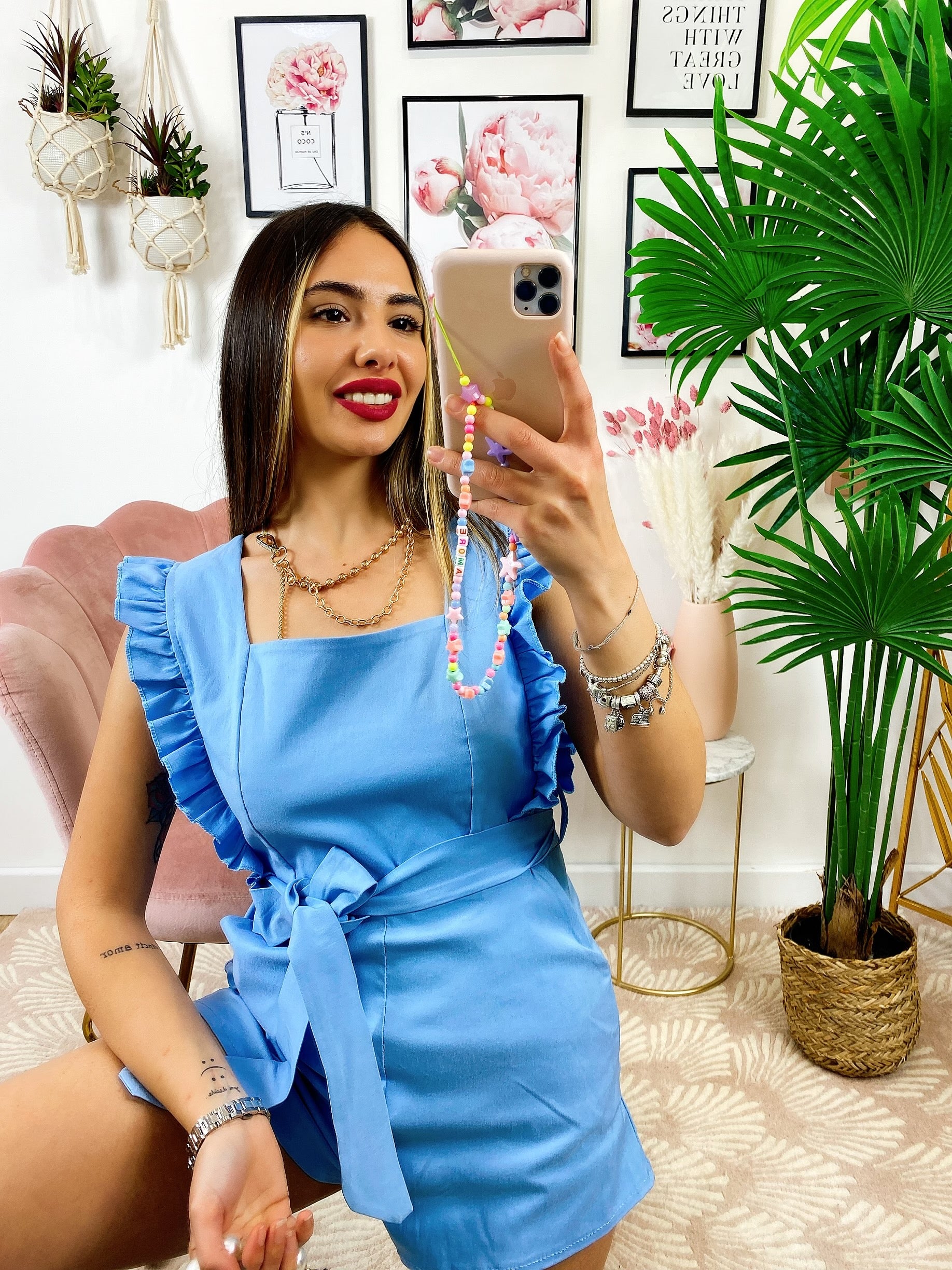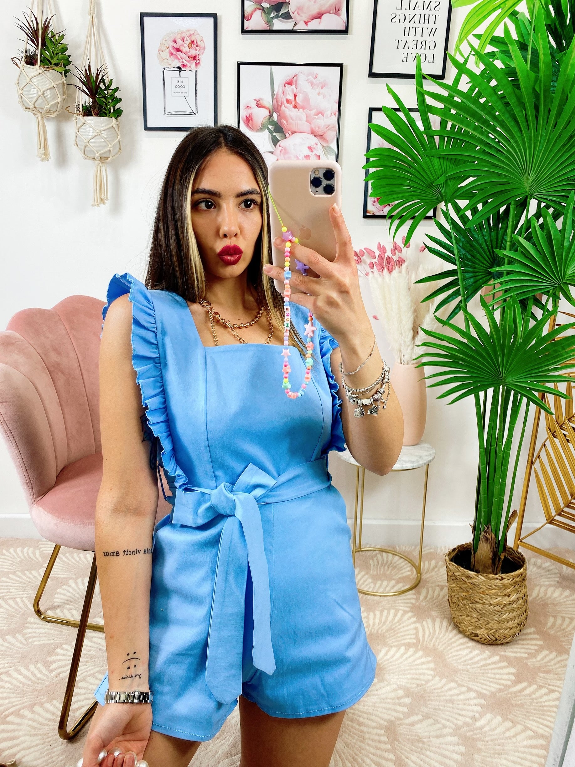 Tutina scollo a barchetta con rouches zip posteriore, tasche e cintura in vita.