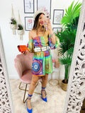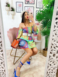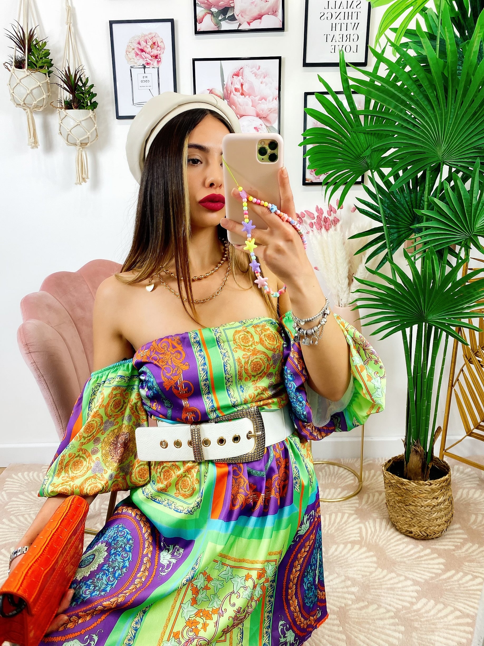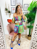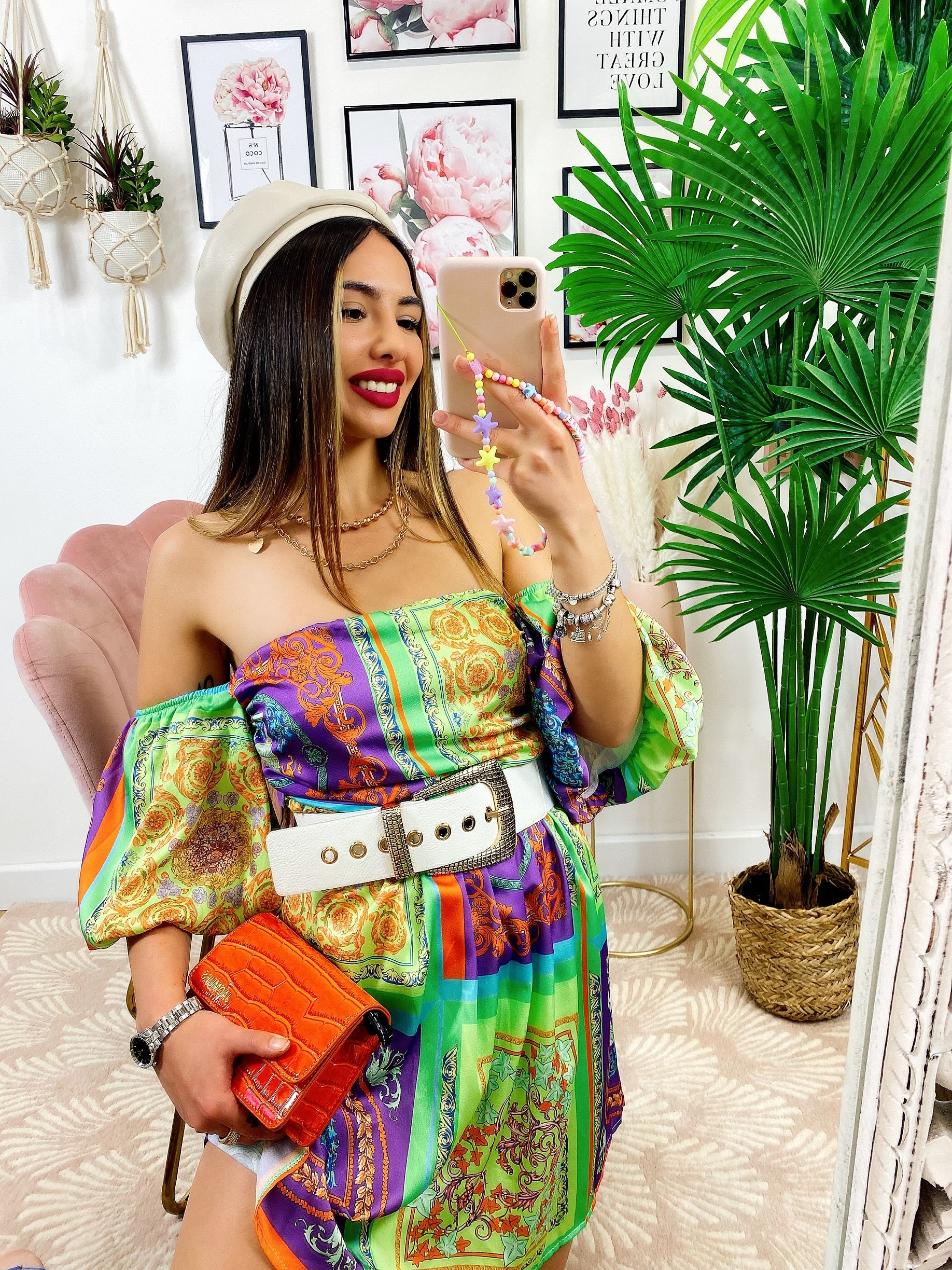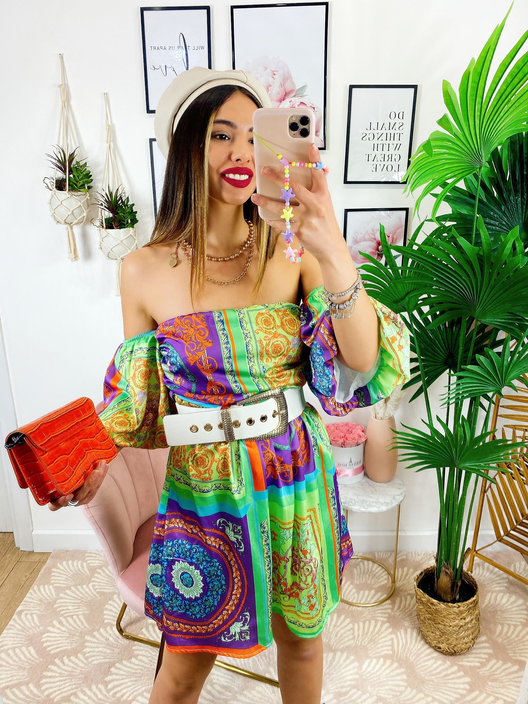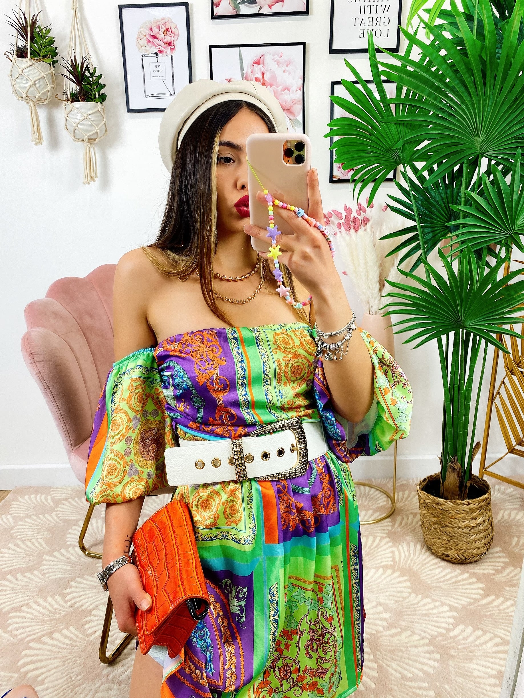 Abito scollo a barchetta stampa etnica Con manica a palloncino e cintura compresa.