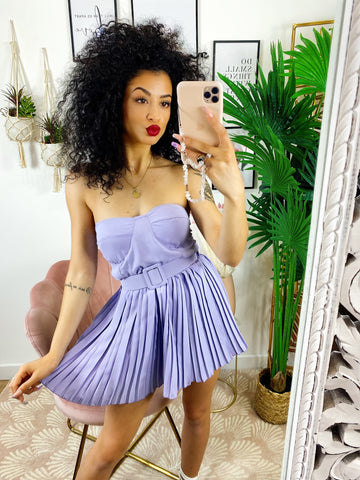 Tutina con scollo a cuore e coppe, cintura in vita e pantaloncino a pieghine. Vestibilità piccola