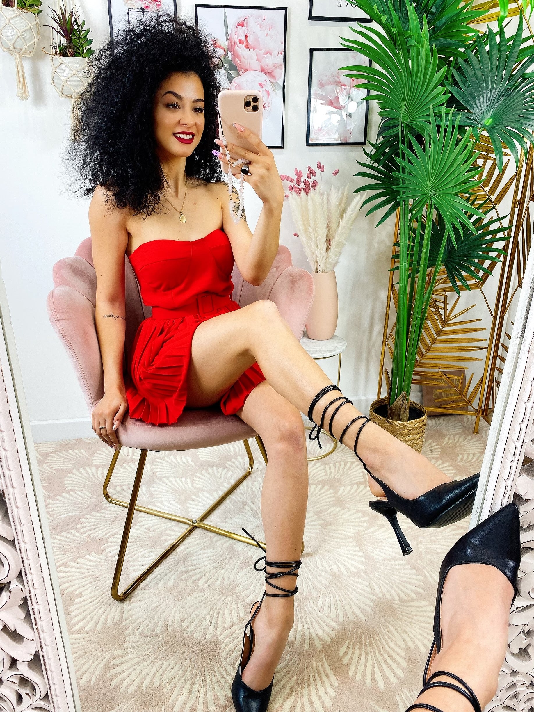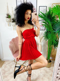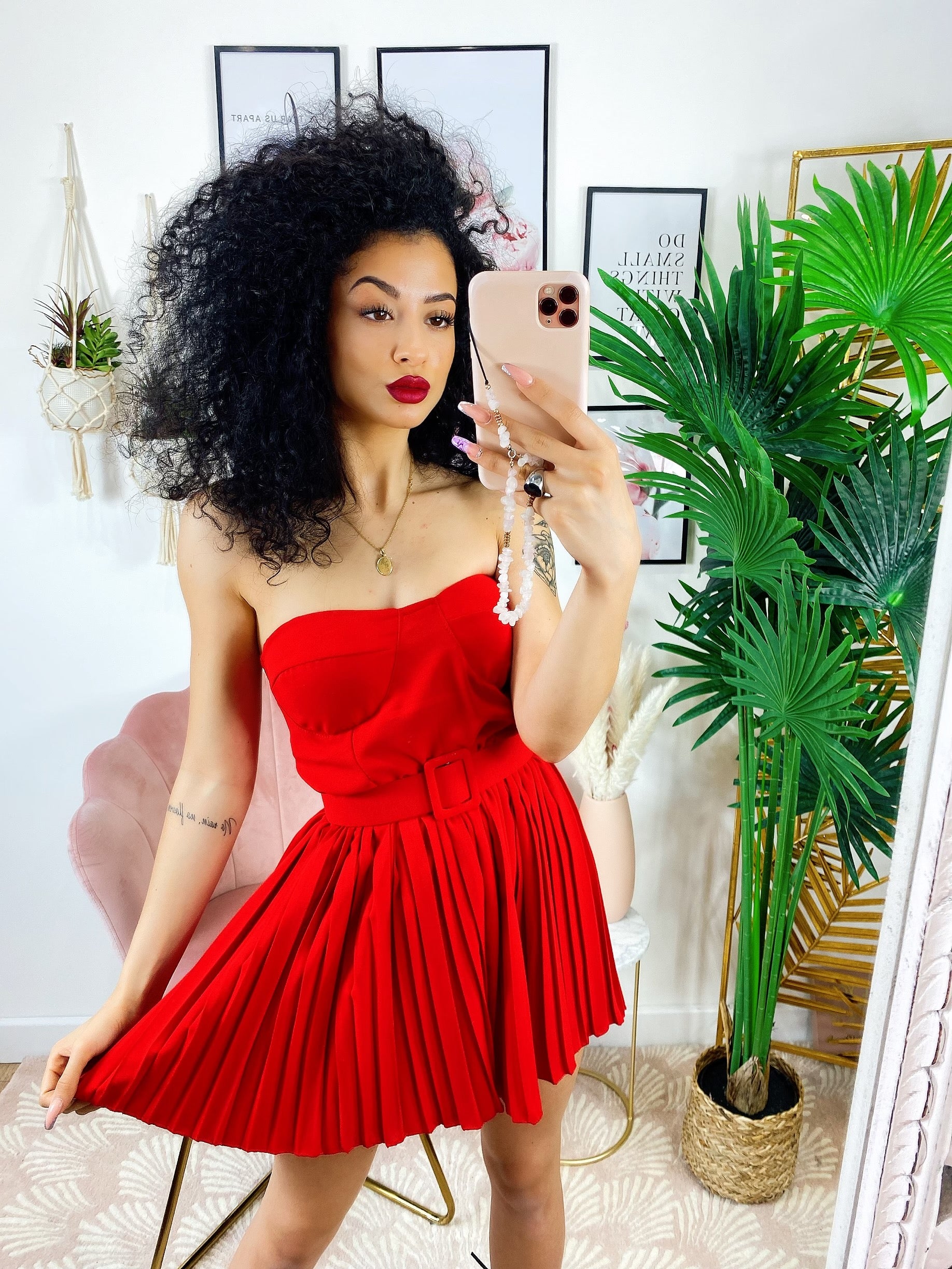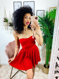 Tutina con scollo a cuore e coppe, cintura in vita e pantaloncino a pieghine. Vestibilità piccola